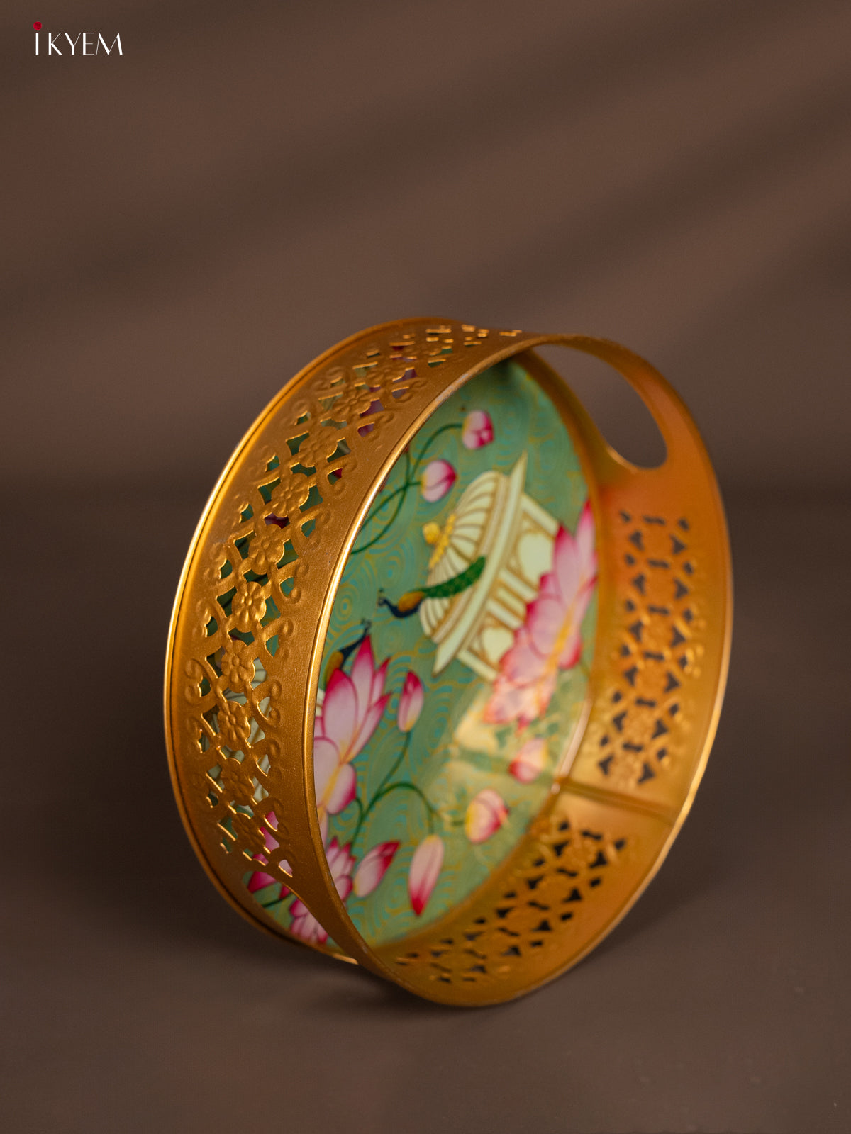 - This 8-inch round metal tray features a detailed digital print of a peacock and lotus design in green, ideal for pooja ceremonies and thoughtful return gifts.