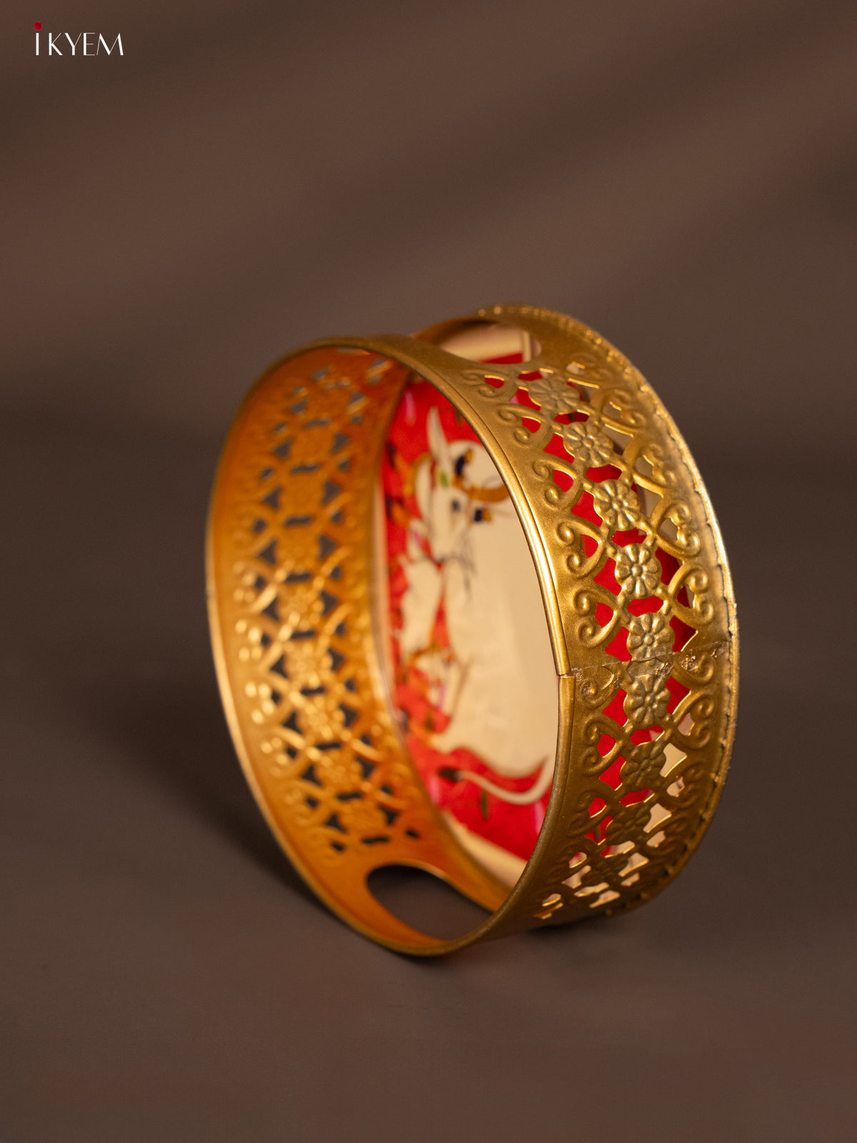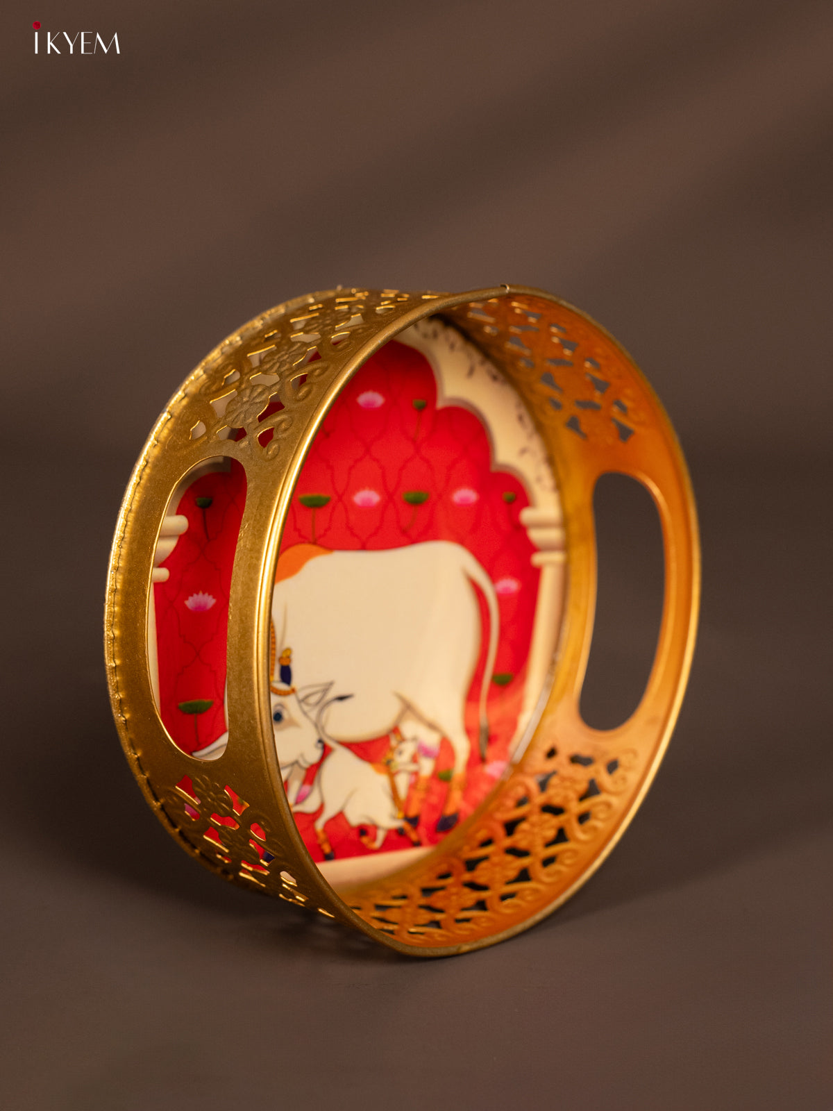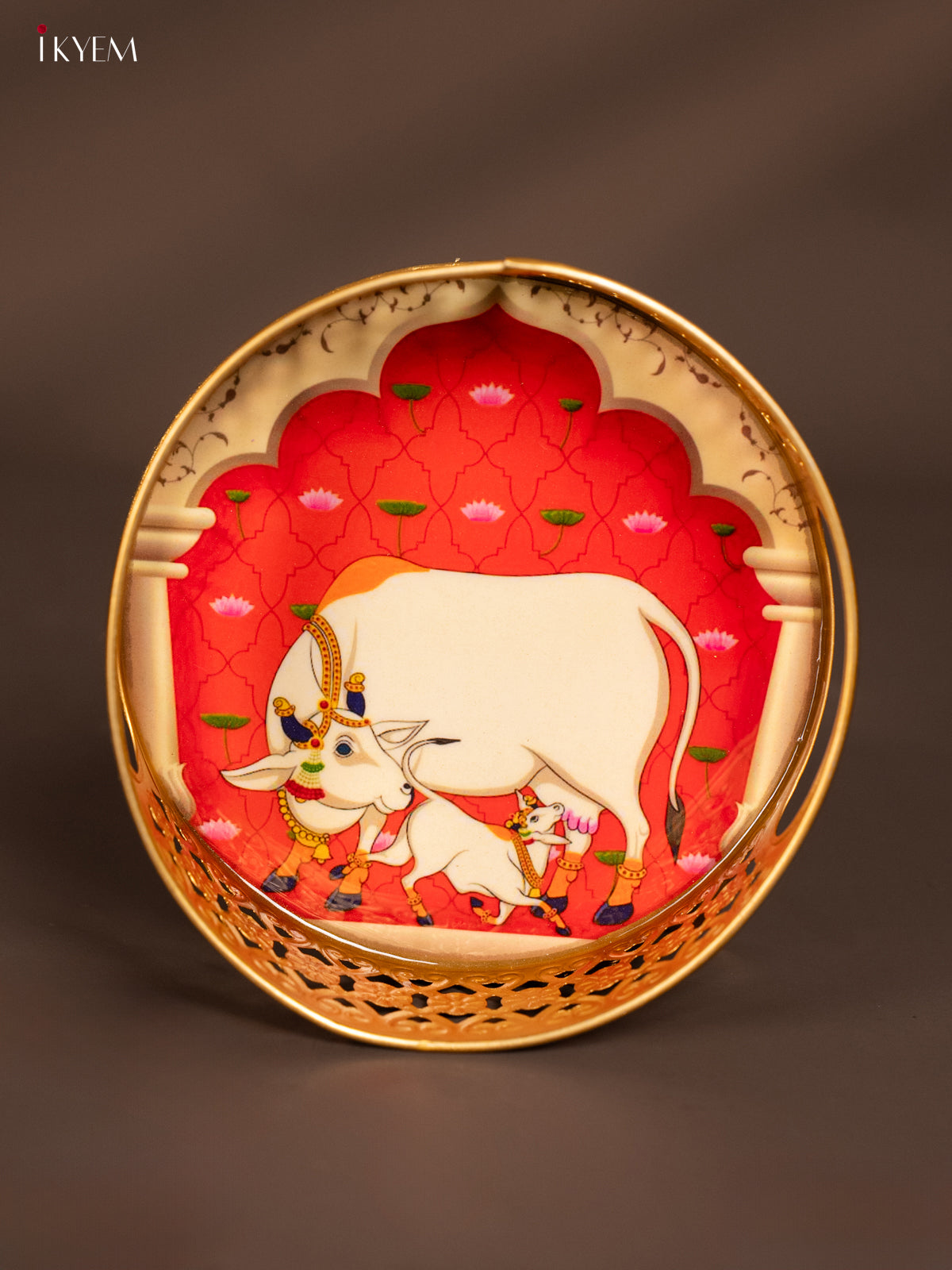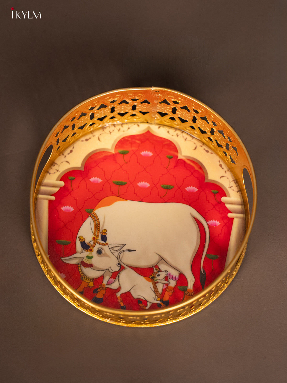 - This 6-inch round metal tray features a detailed digital print of a cow and Calf design in red, ideal for pooja ceremonies and thoughtful return gifts.