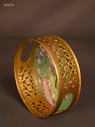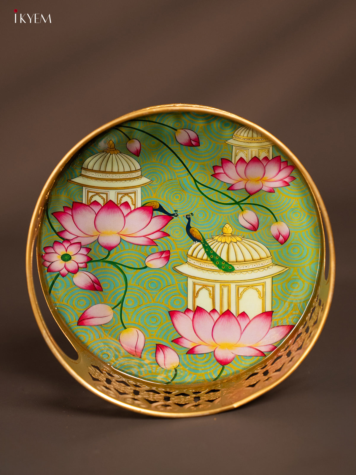 Digital printed Round Metal Tray Peacock & Lotus - Green - 6 Inches - KH13120