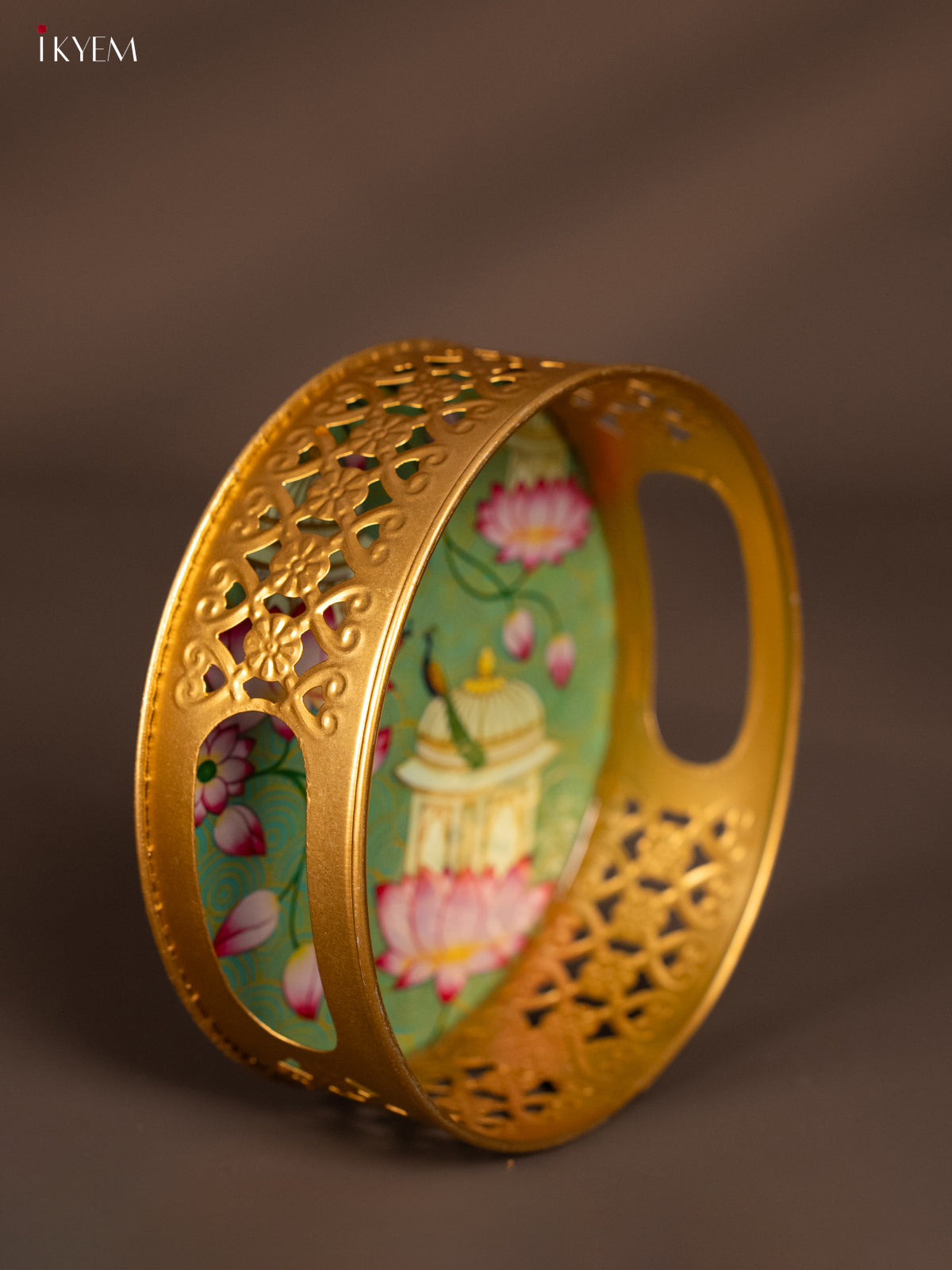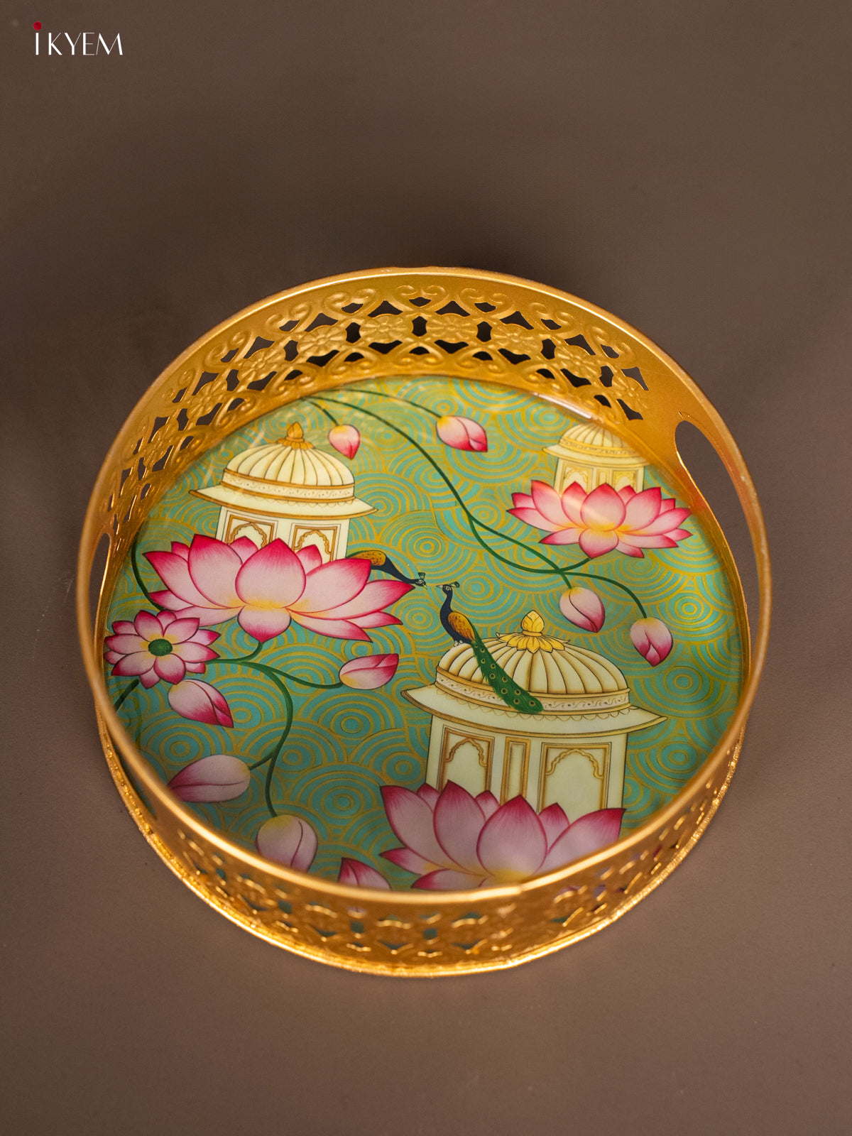- This 6-inch round metal tray features a detailed digital print of a peacock and lotus design in green, ideal for pooja ceremonies and thoughtful return gifts.