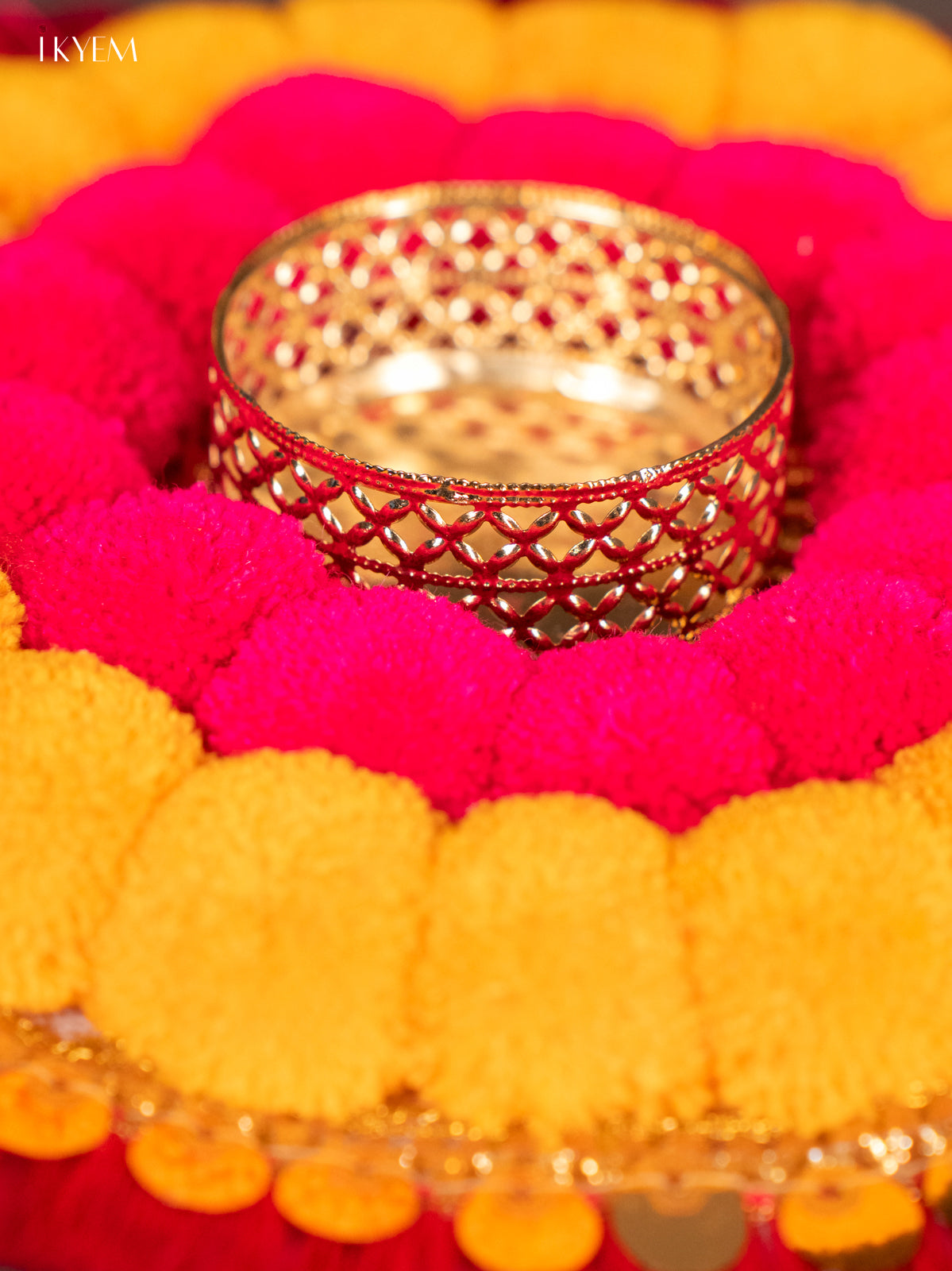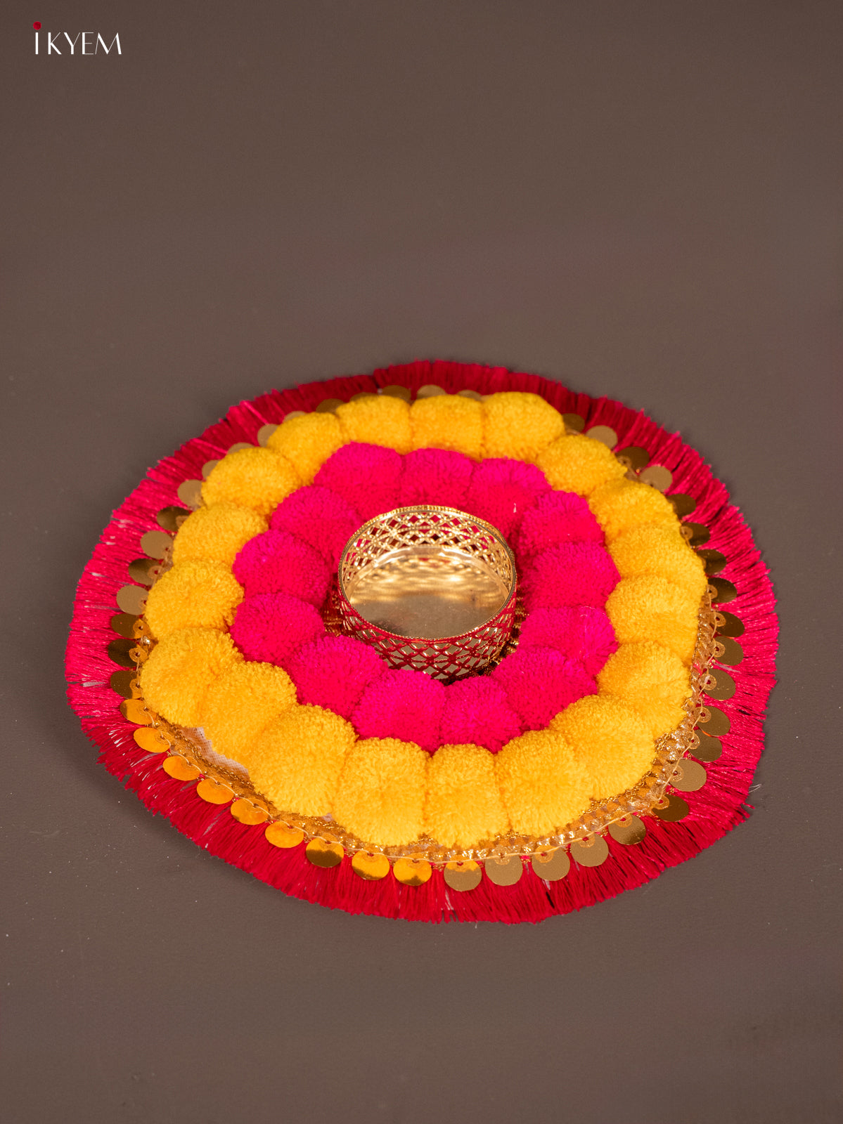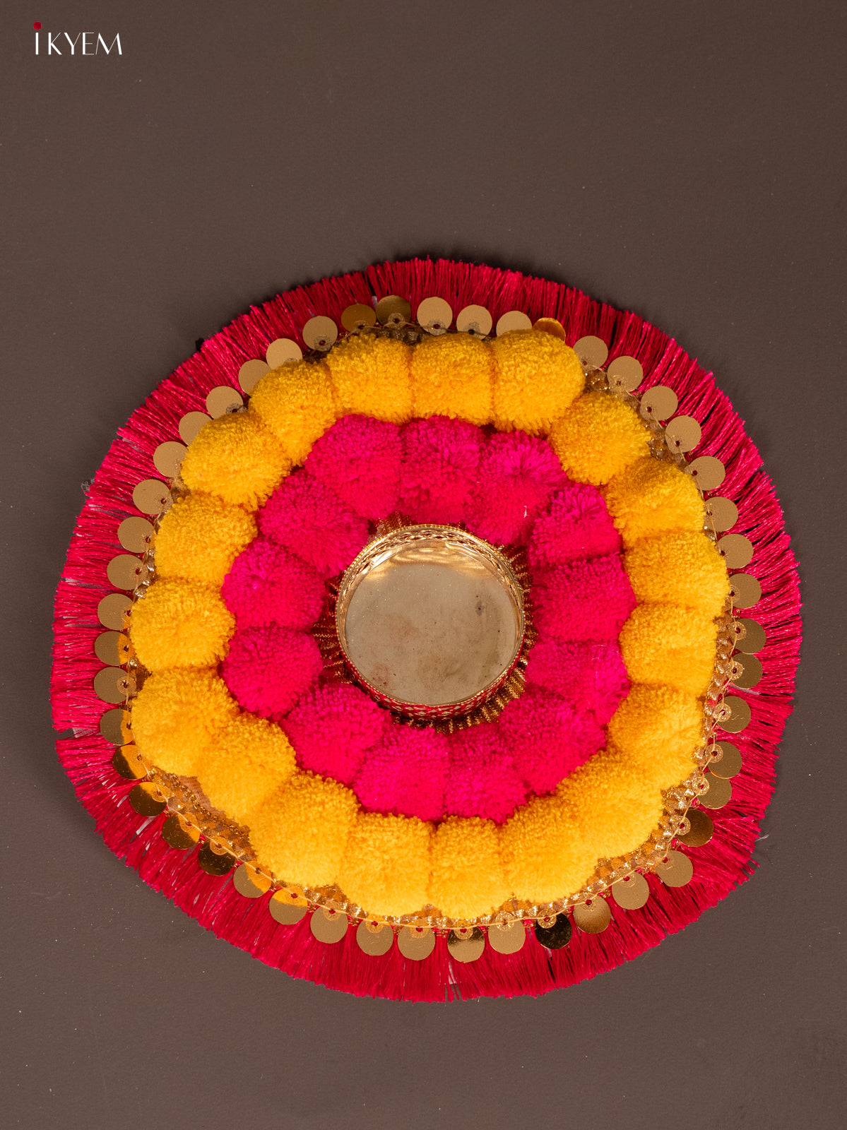 - The Artificial Flowers Round Rangoli Diya Mat in pink offers a beautifully crafted base for decorating your pooja space and enhancing your home decor.