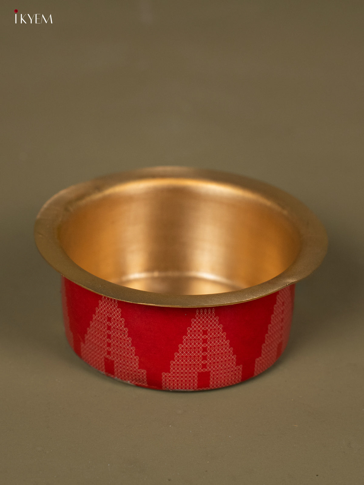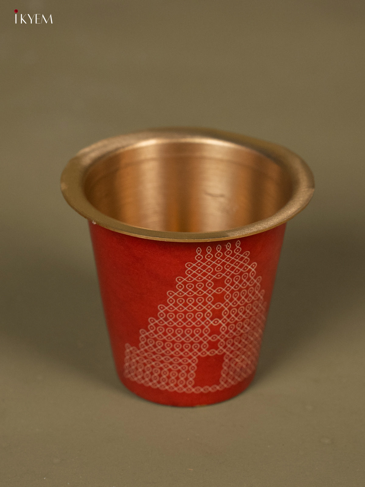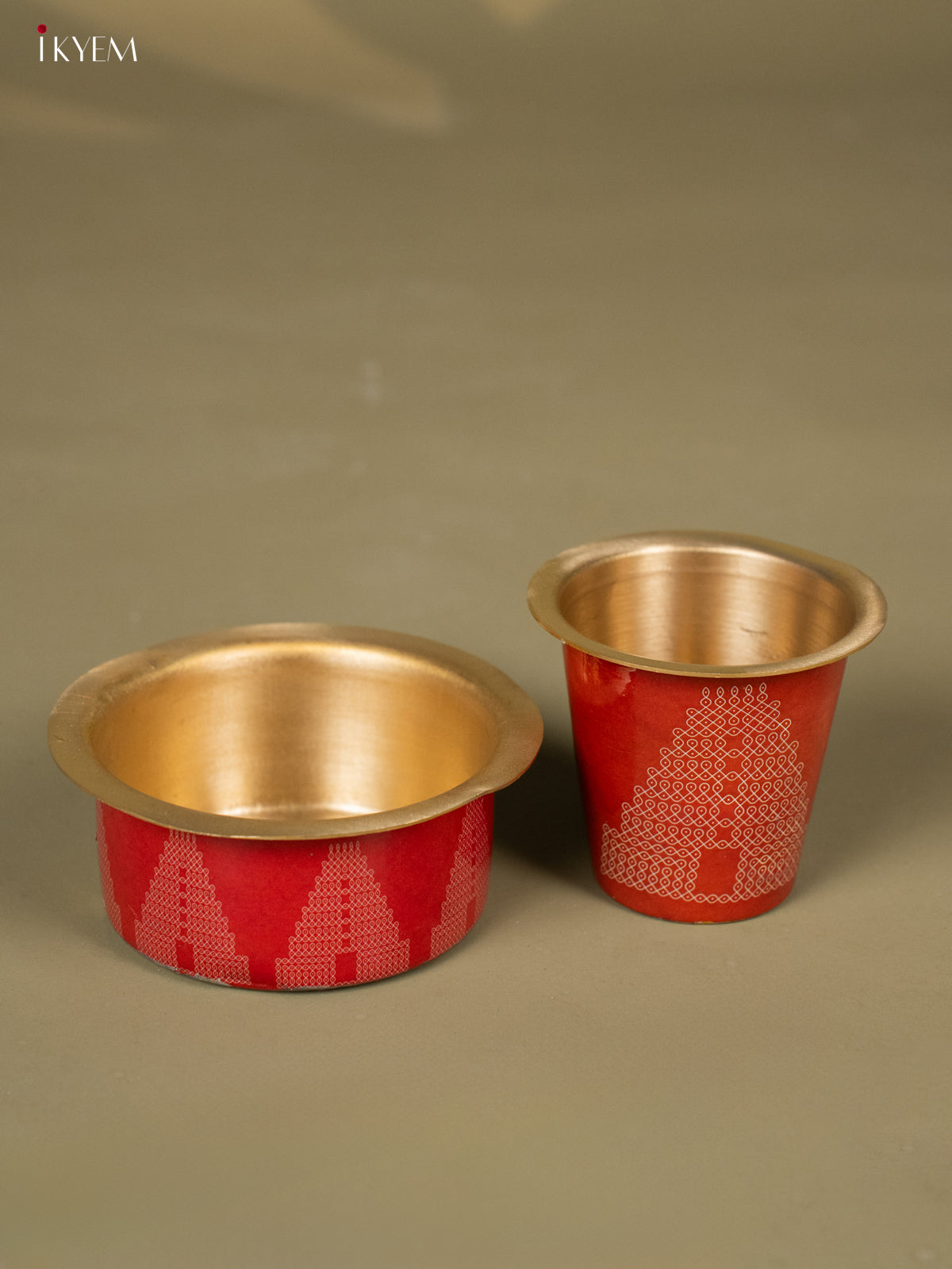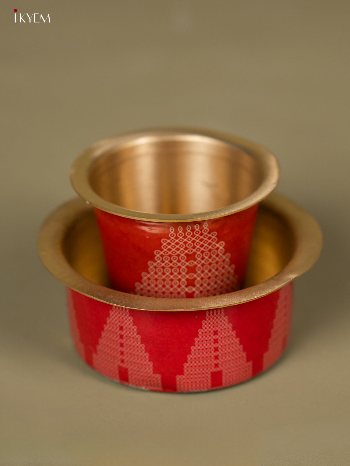 - The Gopuram kolam Digital Printed Brass Coffee Dabara Set in brick red features a stylish and unique design, perfect for coffee enthusiasts.