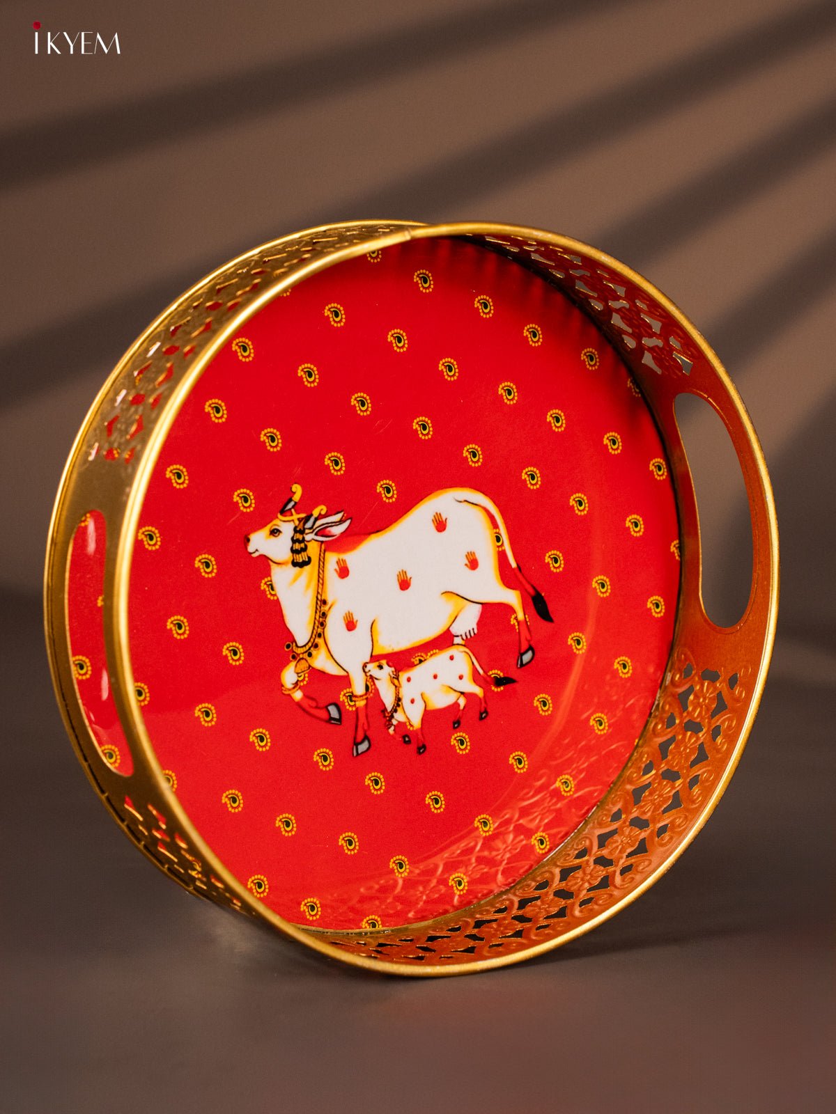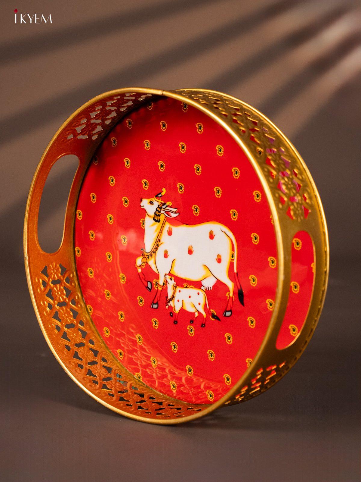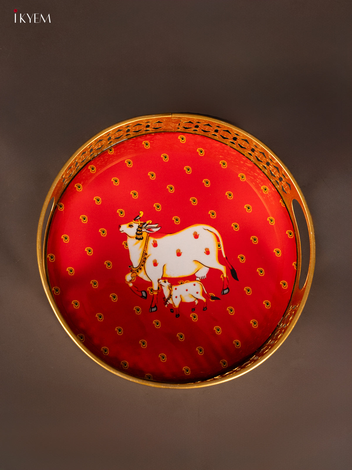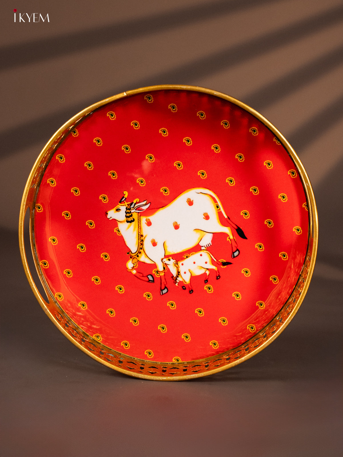 - This 8-inch round metal tray features a digitally printed red design of a cow and calf, reflecting traditional motifs.