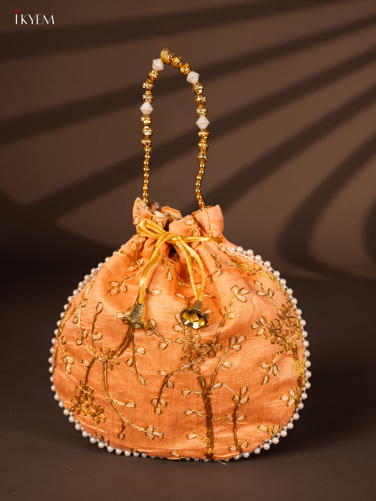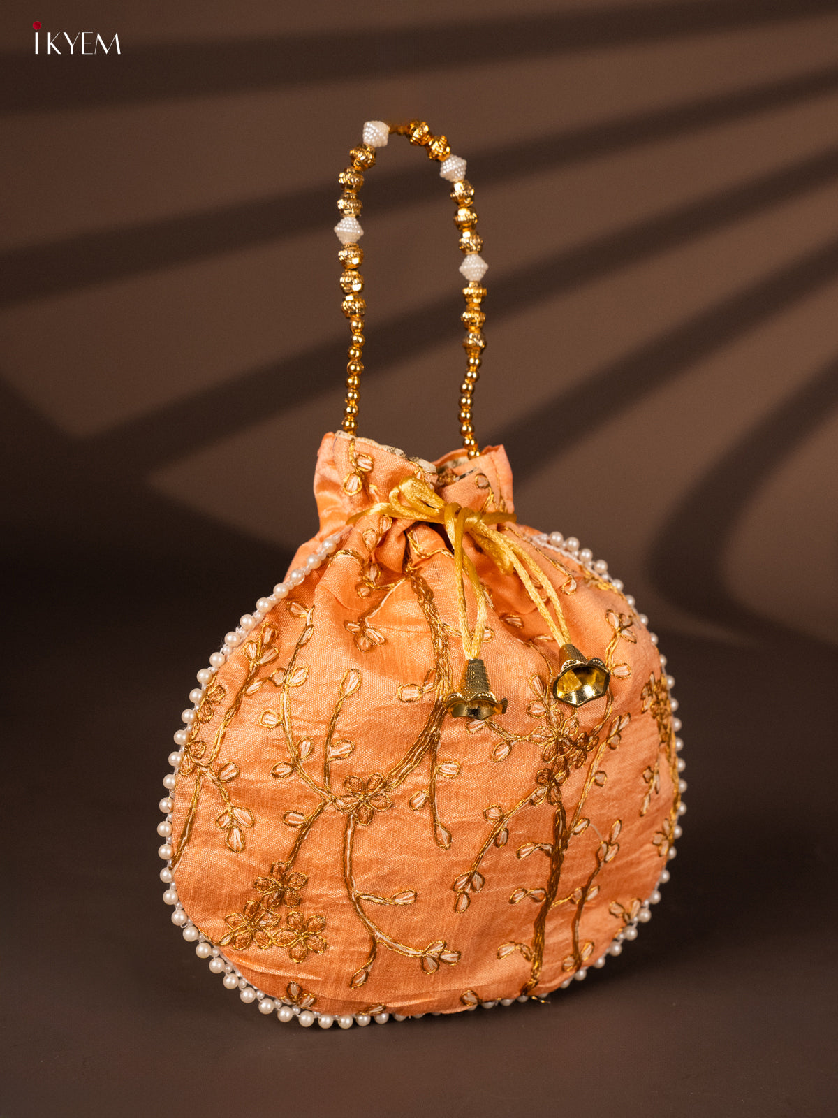 - The Designer Embroidered Potli Bag in peach combines elegant craftsmanship with practicality, making it an ideal option for return gifts.
