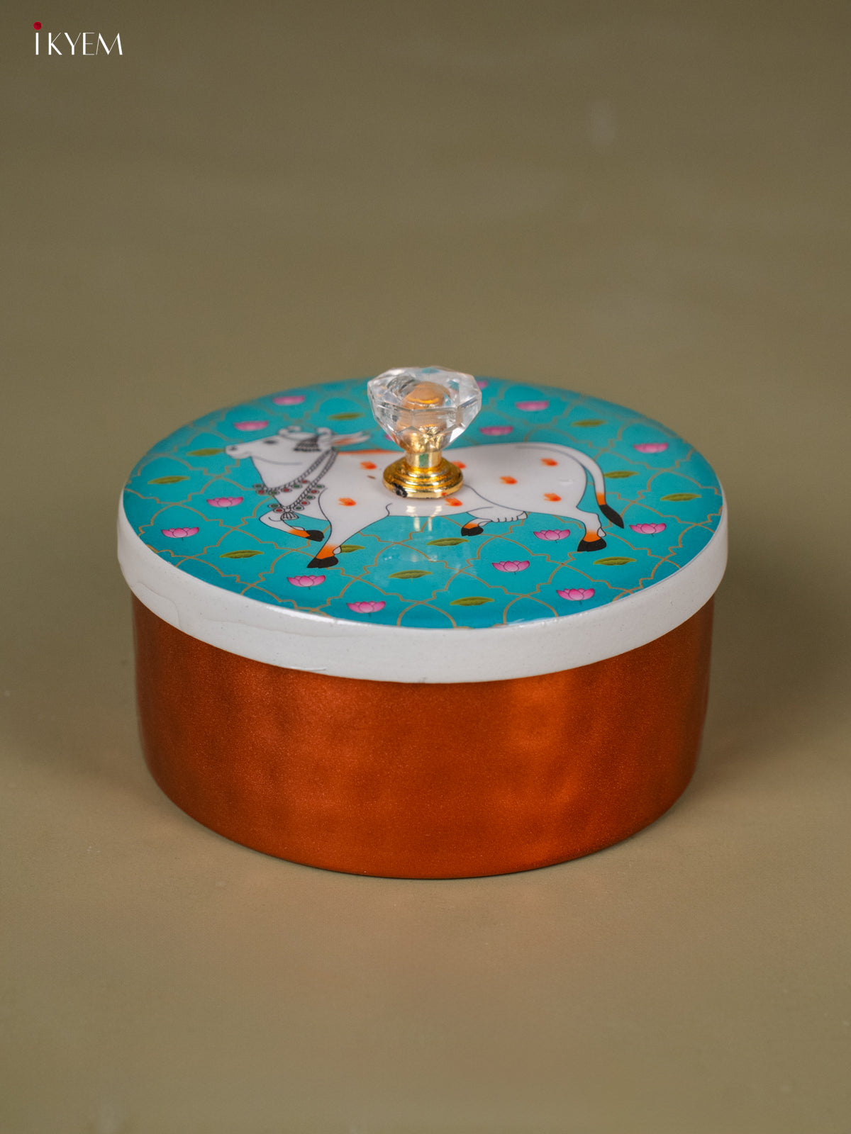- This digital printed round copper dry fruit box features a vibrant teal blue cow design, combining aesthetic appeal with practical use.