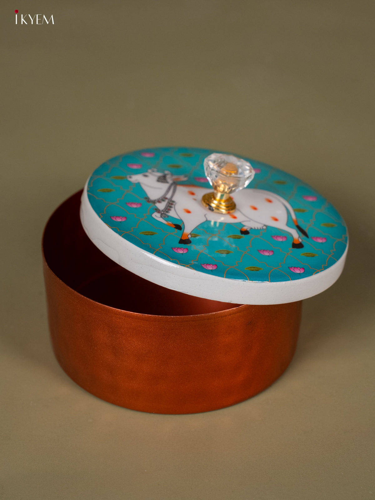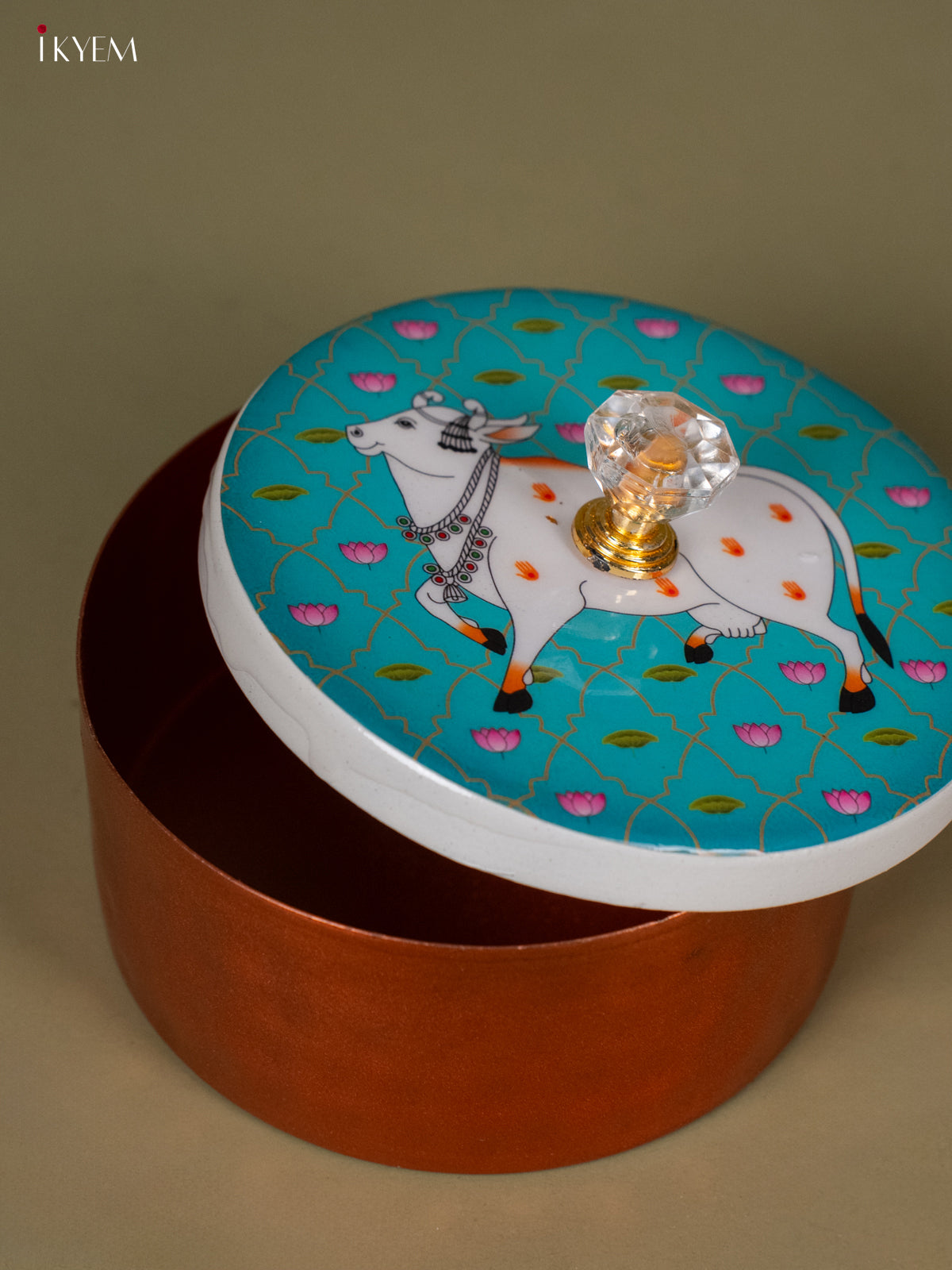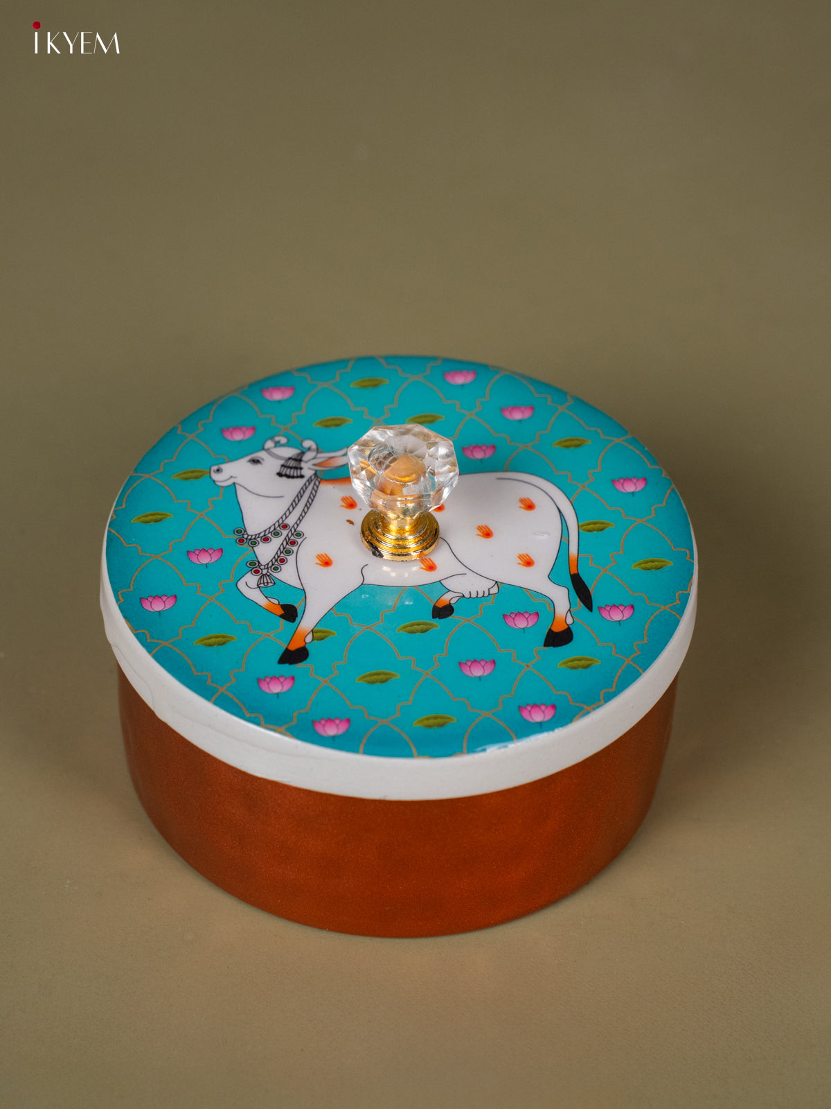 Digital Printed Round Copper Dry Fruit Box - Cow - Teal Blue- KH25111