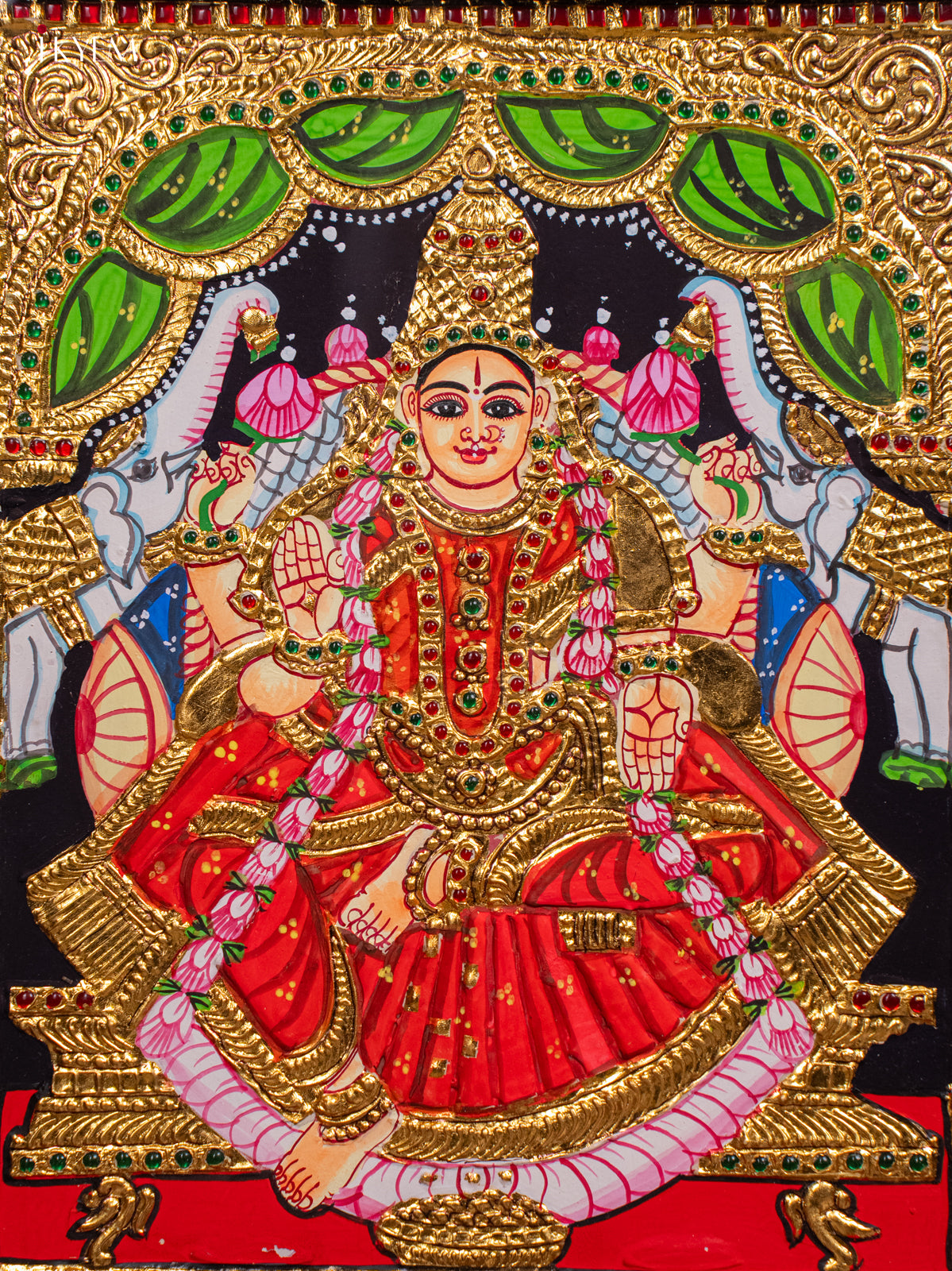 - A Divine Goddess Gajalakshmi Tanjore Painting (18 x 15) for your pooja room, radiating divine energy and exquisite artistry.