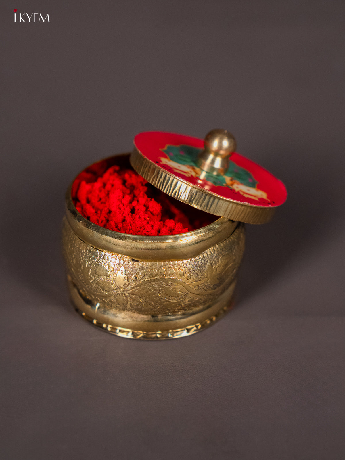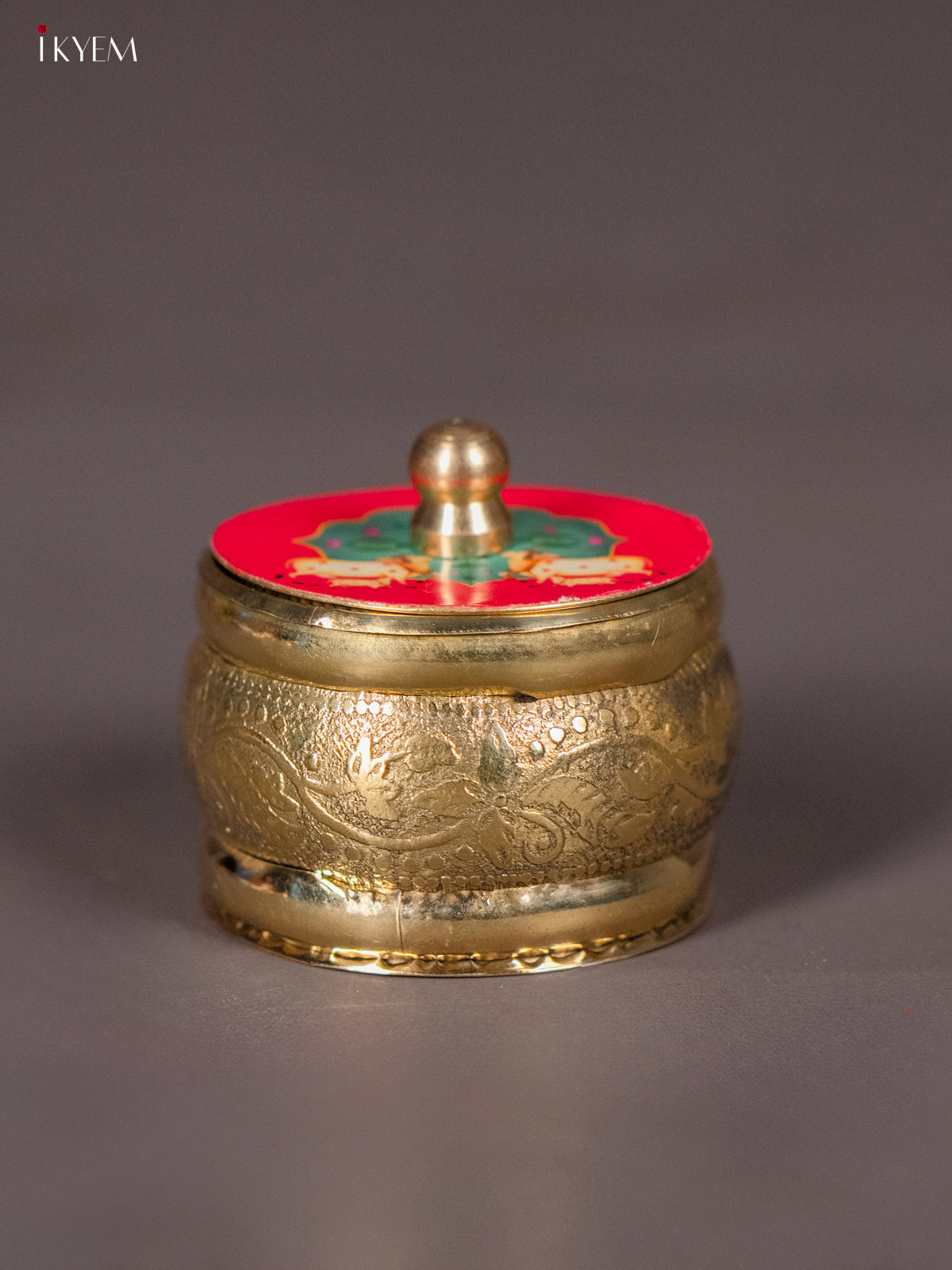 - This brass-coated kumkum holder features an elegant digital print of a cow and calf on a vibrant pink base, making it perfect for pooja rituals.