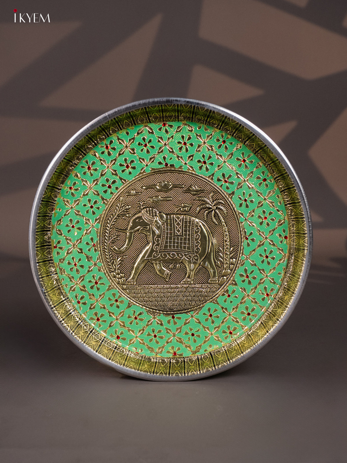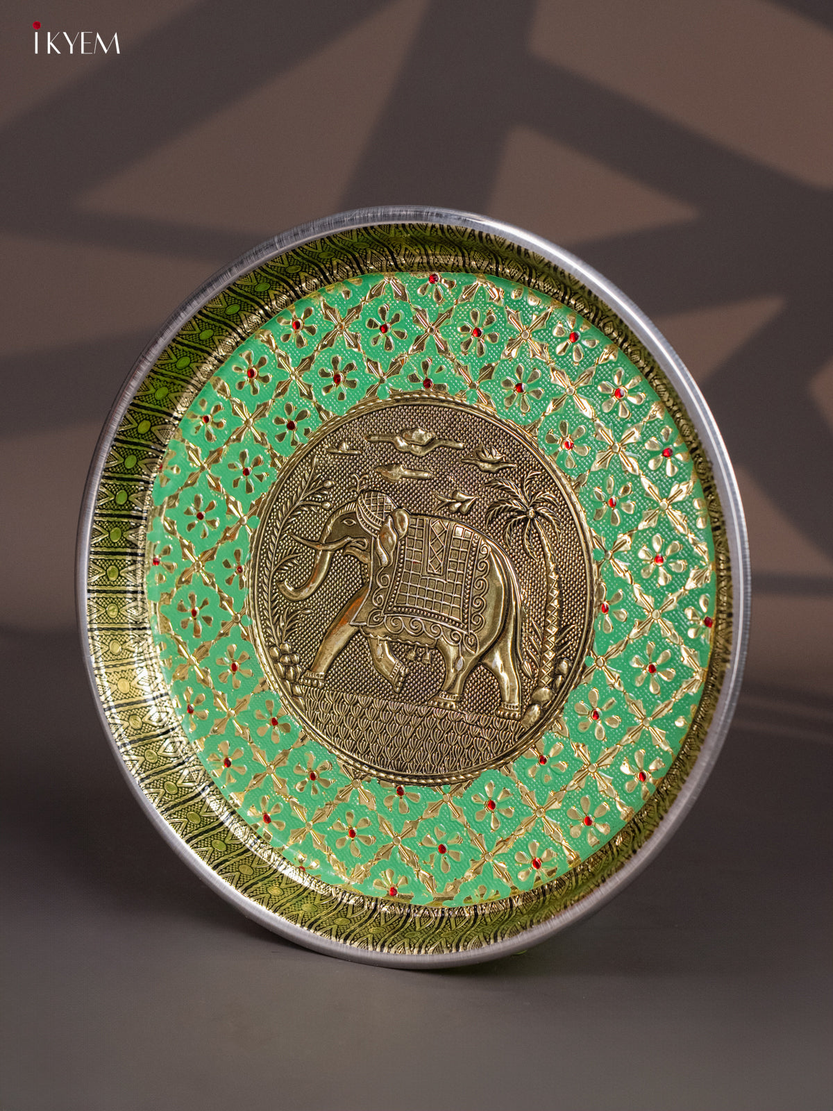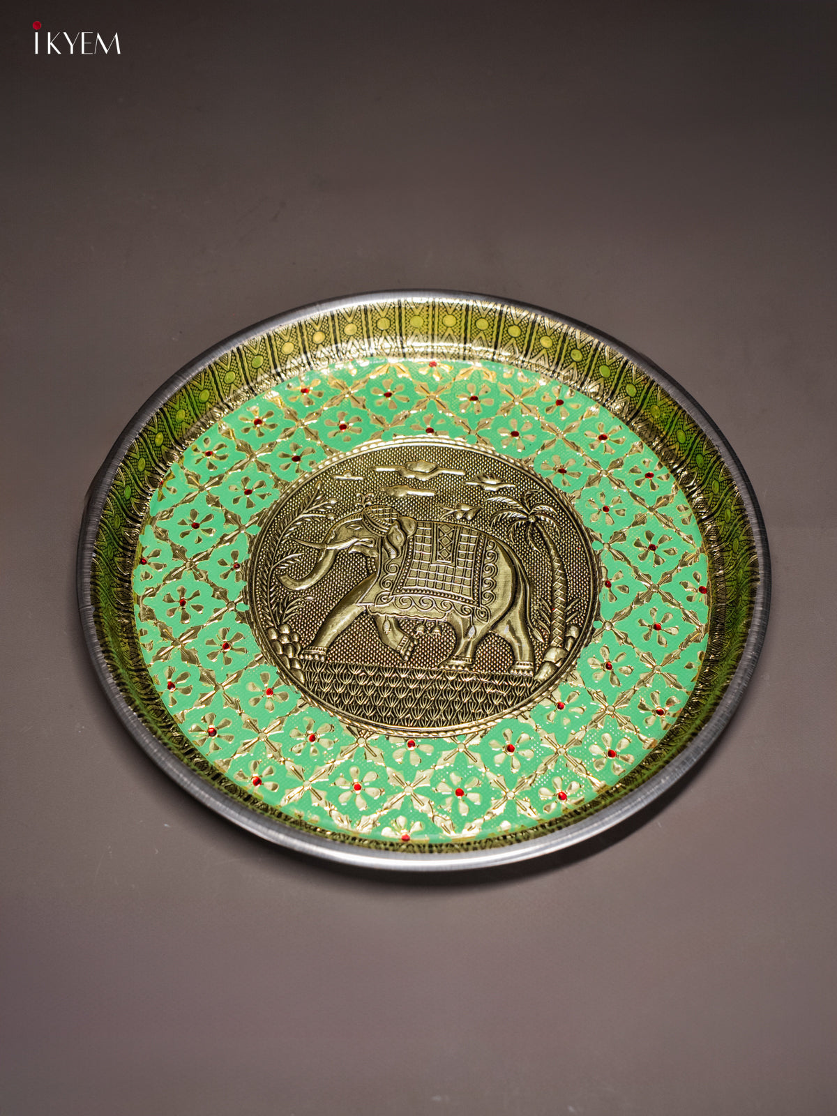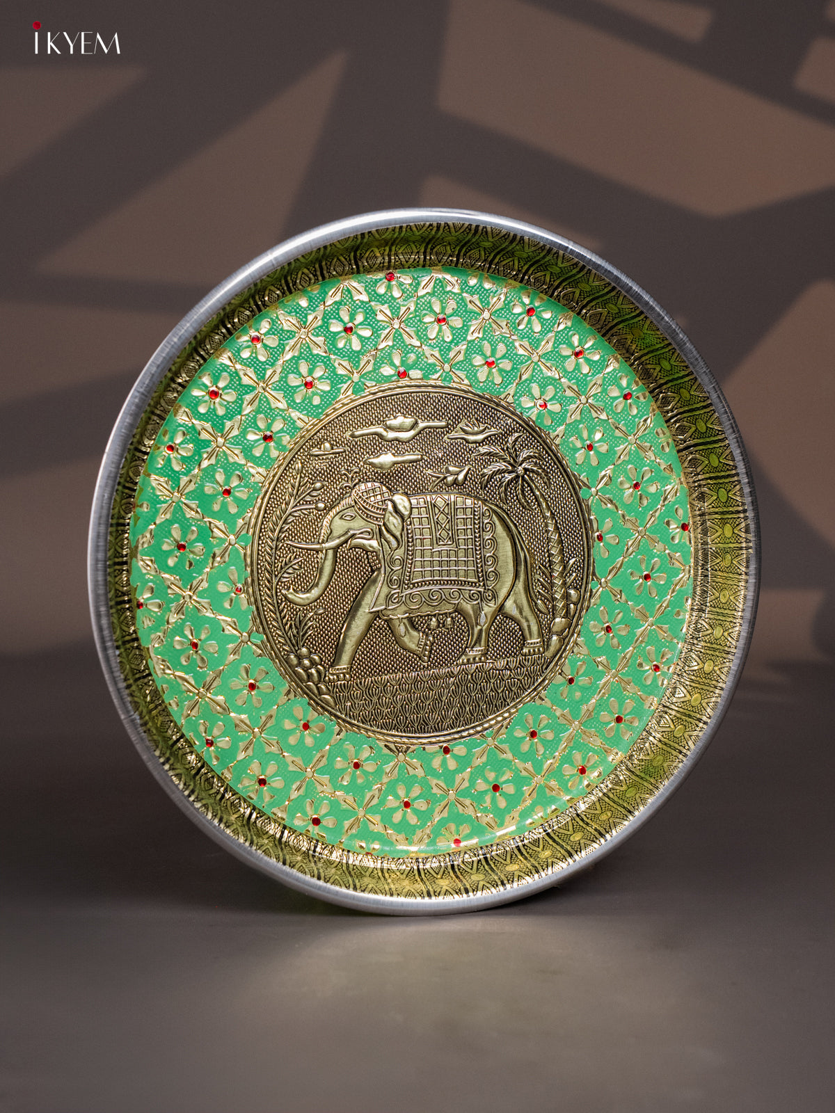 - This 11-inch Green Meenakari Plate features a beautifully detailed oxidized elephant design, making it an ideal item for pooja ceremonies or as a thoughtful return gift.