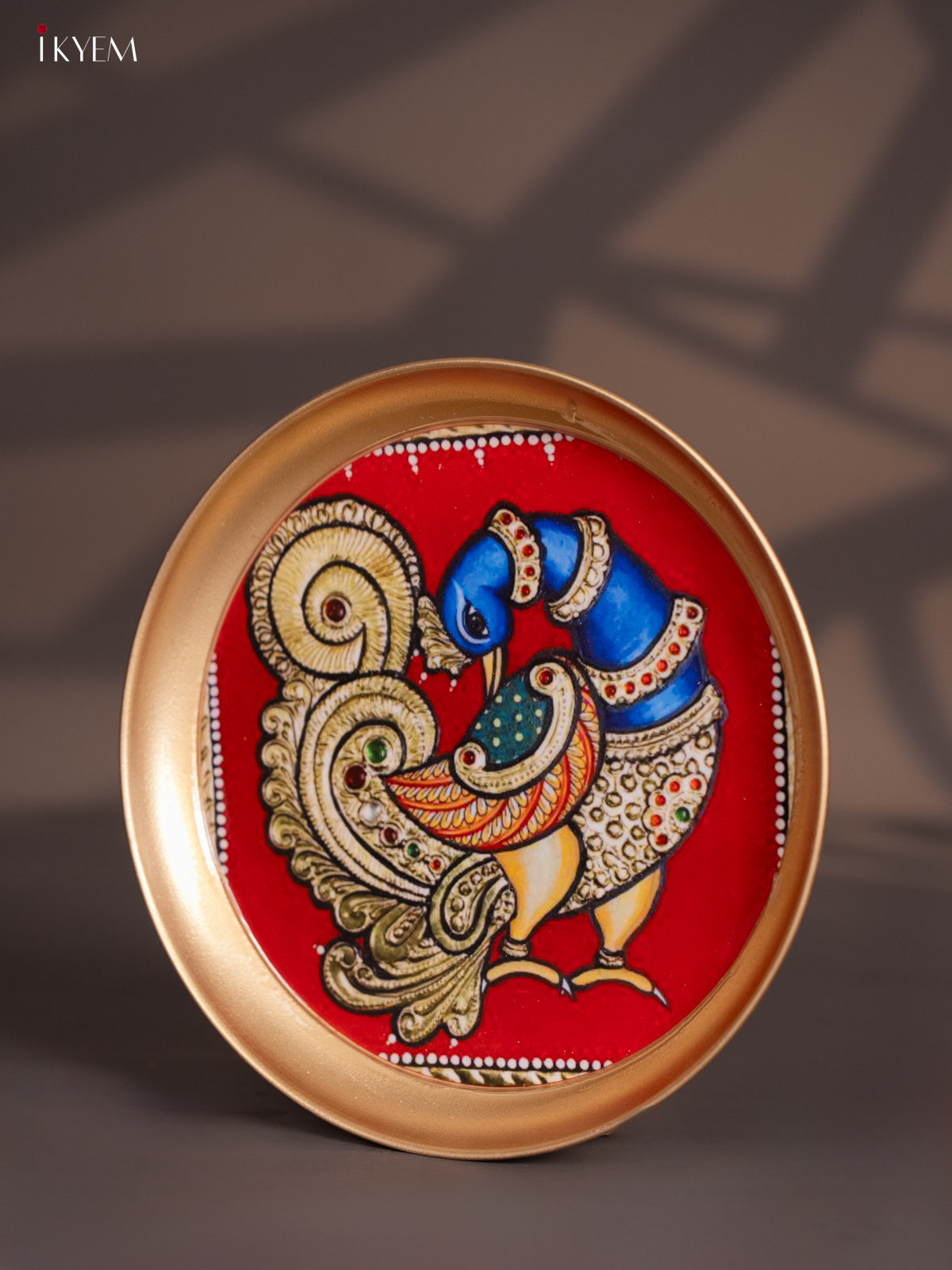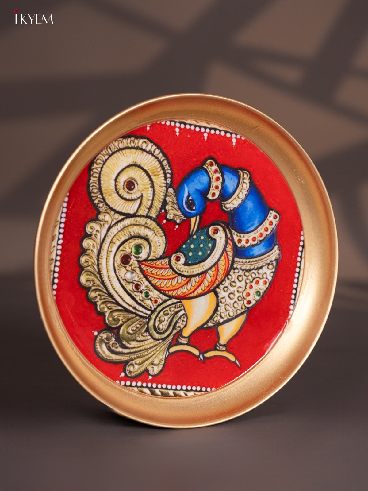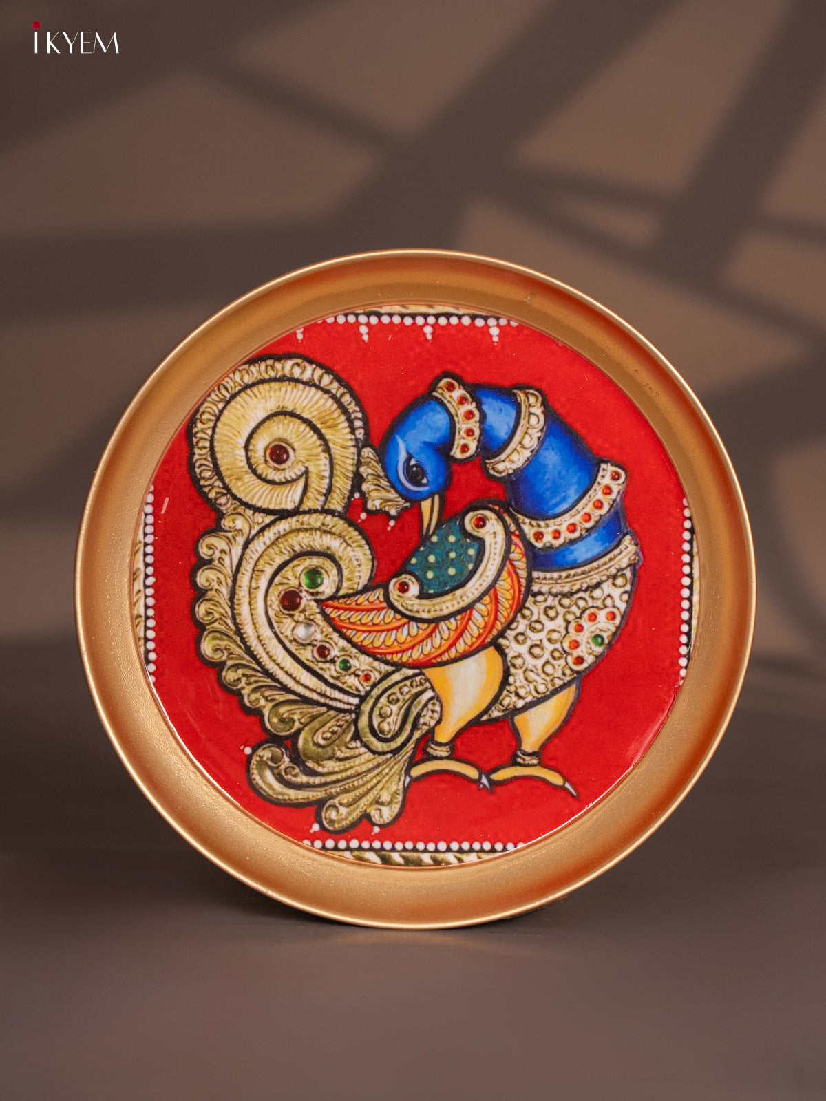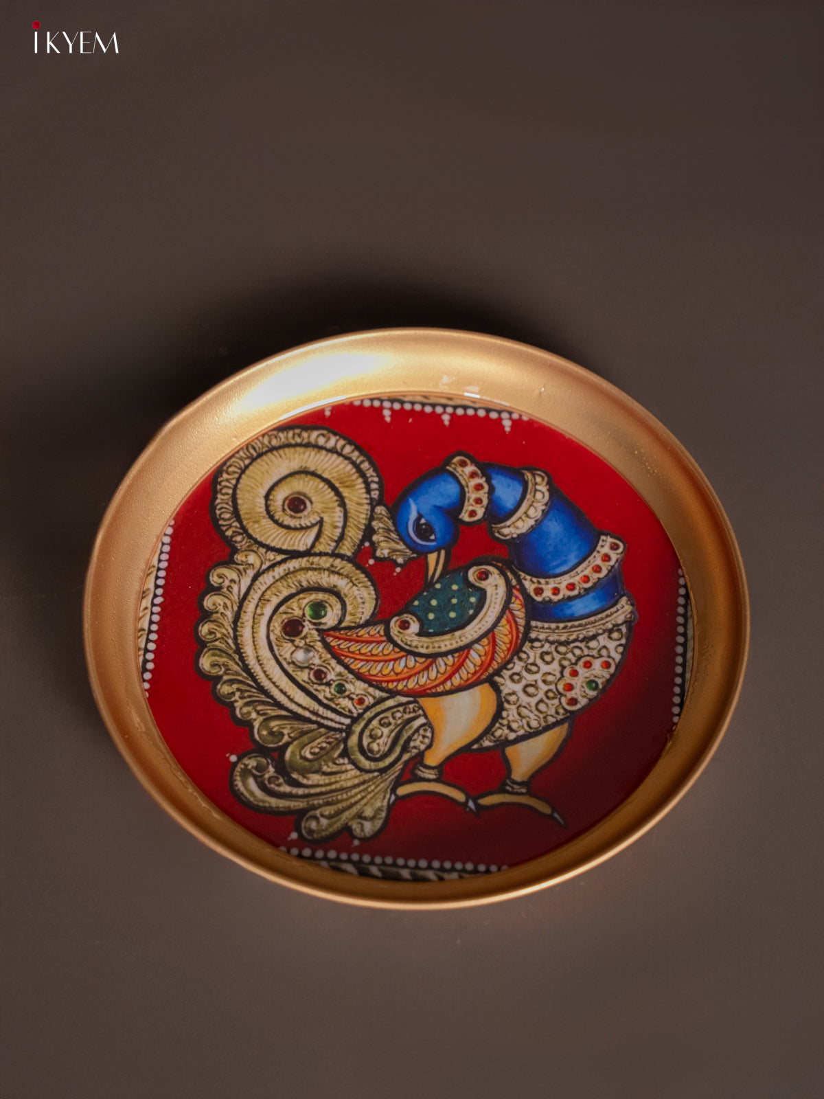 - This 8-inch brass coated plate showcases a bright a red with blue peacock design, perfect for pooja ceremonies and festive occasions.