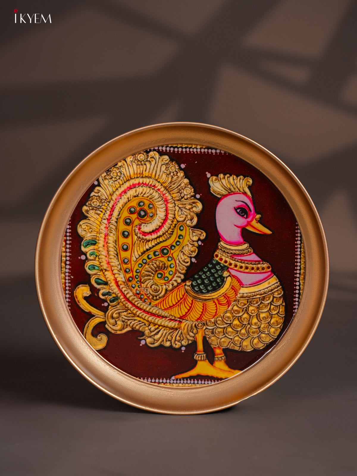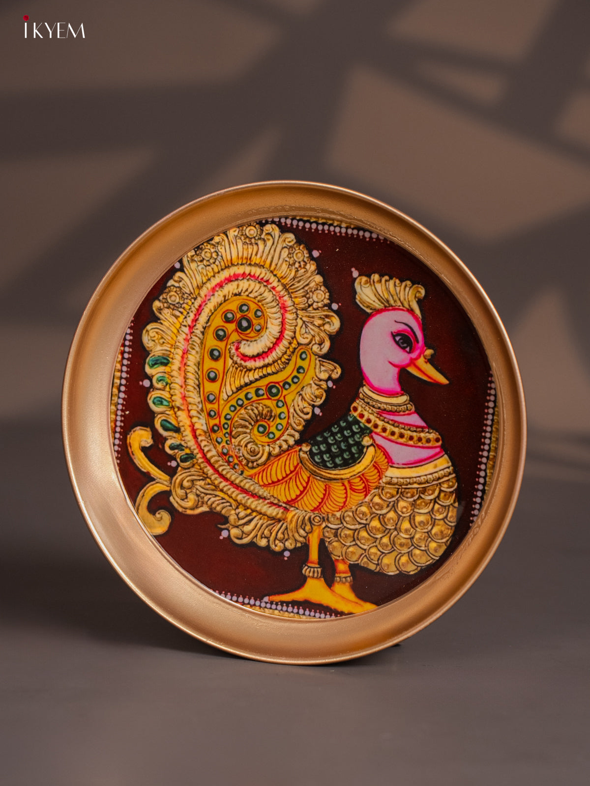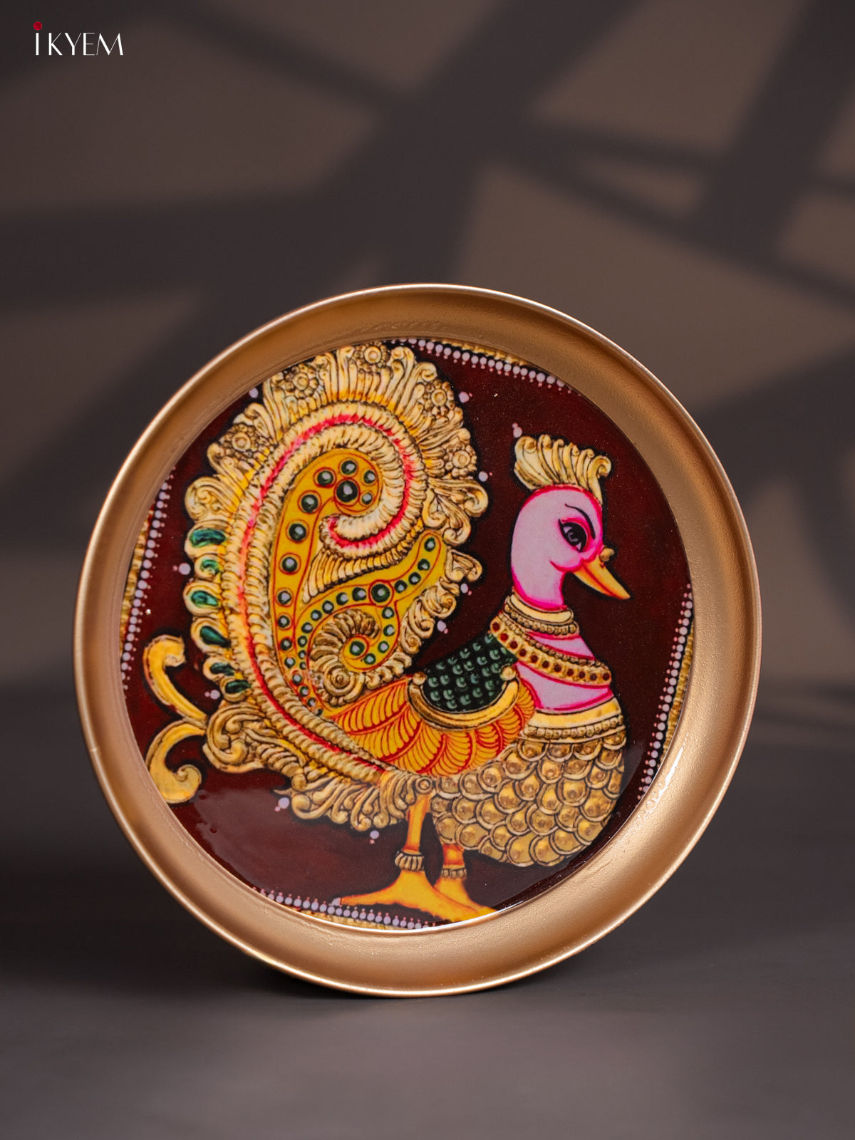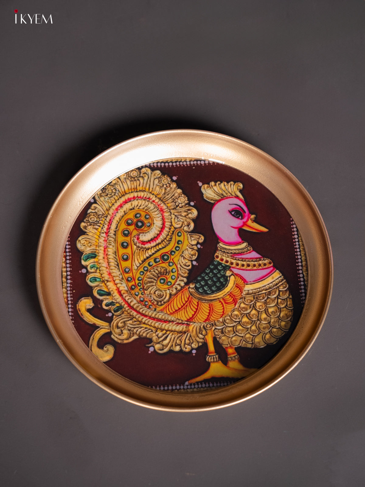 - This 8-inch brass coated plate showcases a bright a brown peacock design, perfect for pooja ceremonies and festive occasions.