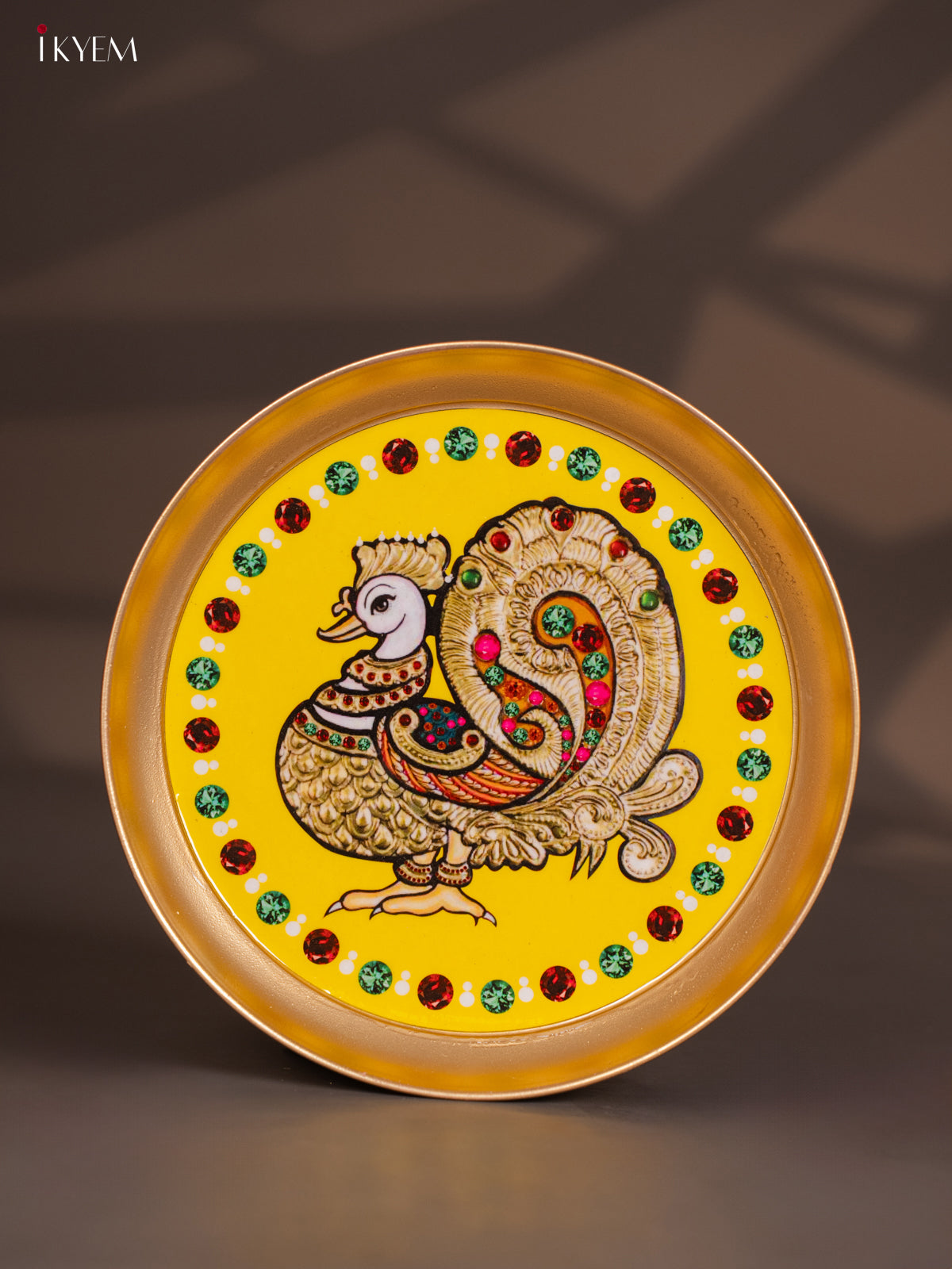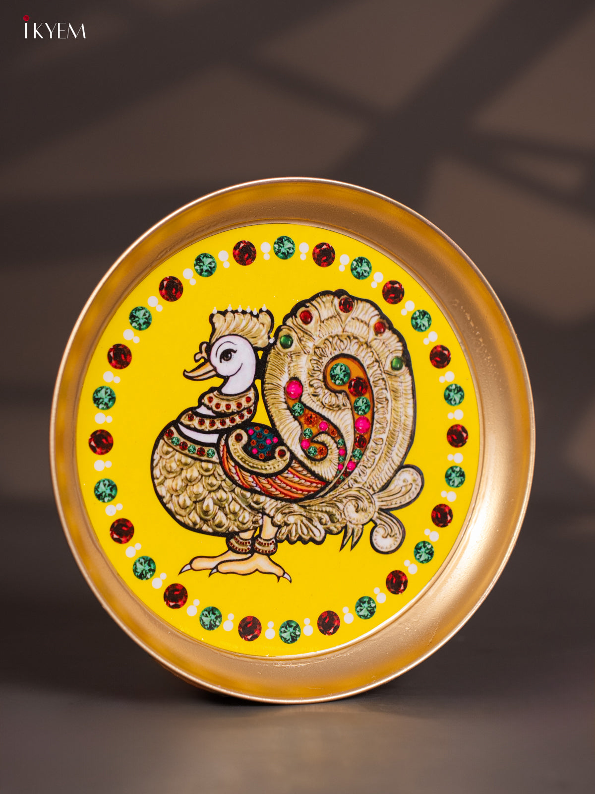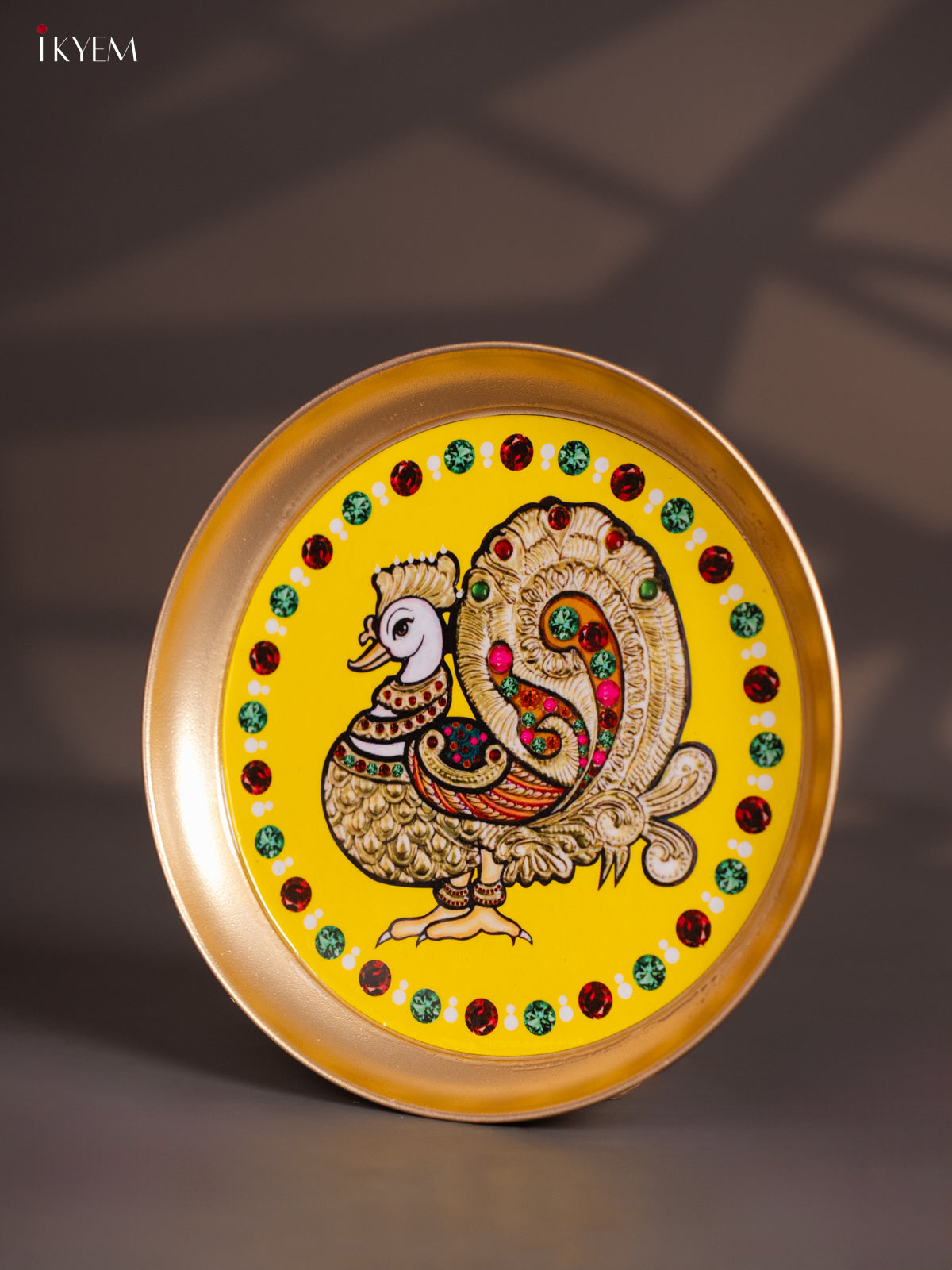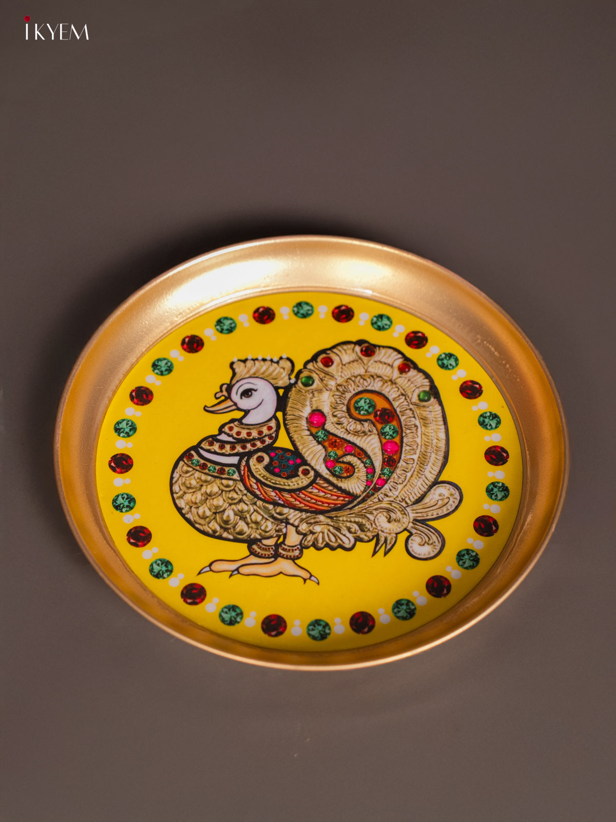 - This 8-inch brass coated plate showcases a bright a yellow peacock design, perfect for pooja ceremonies and festive occasions.