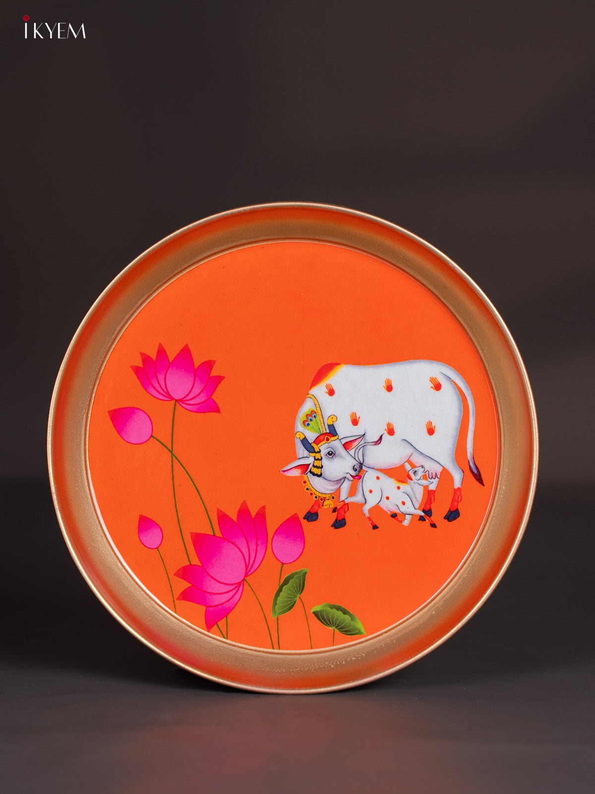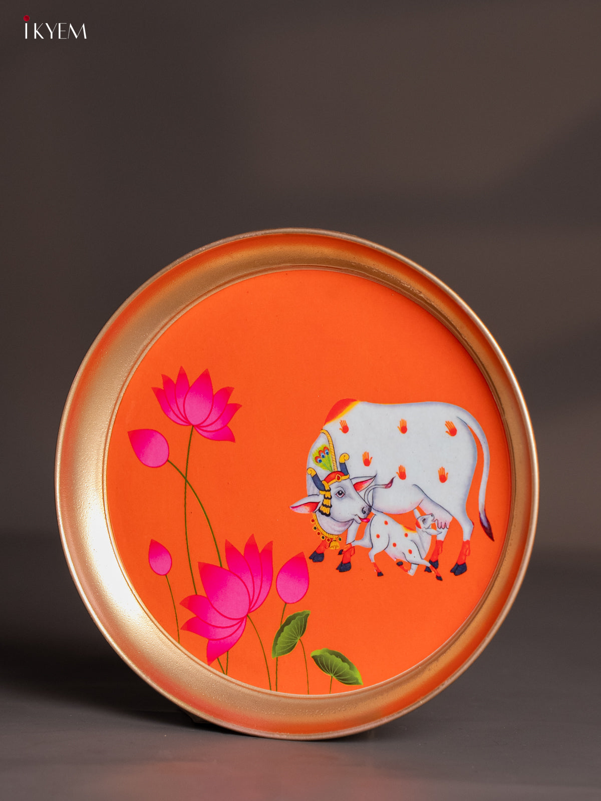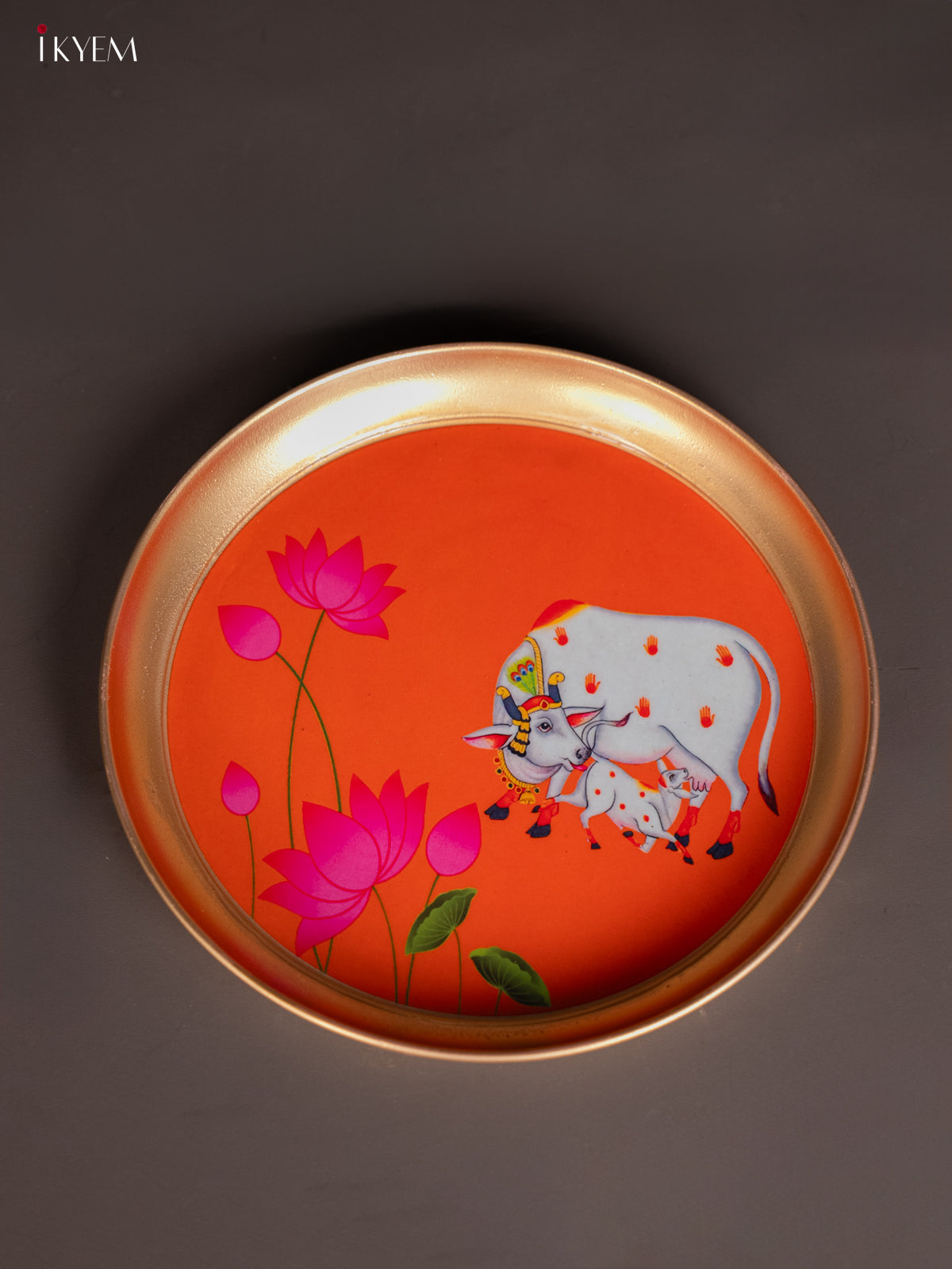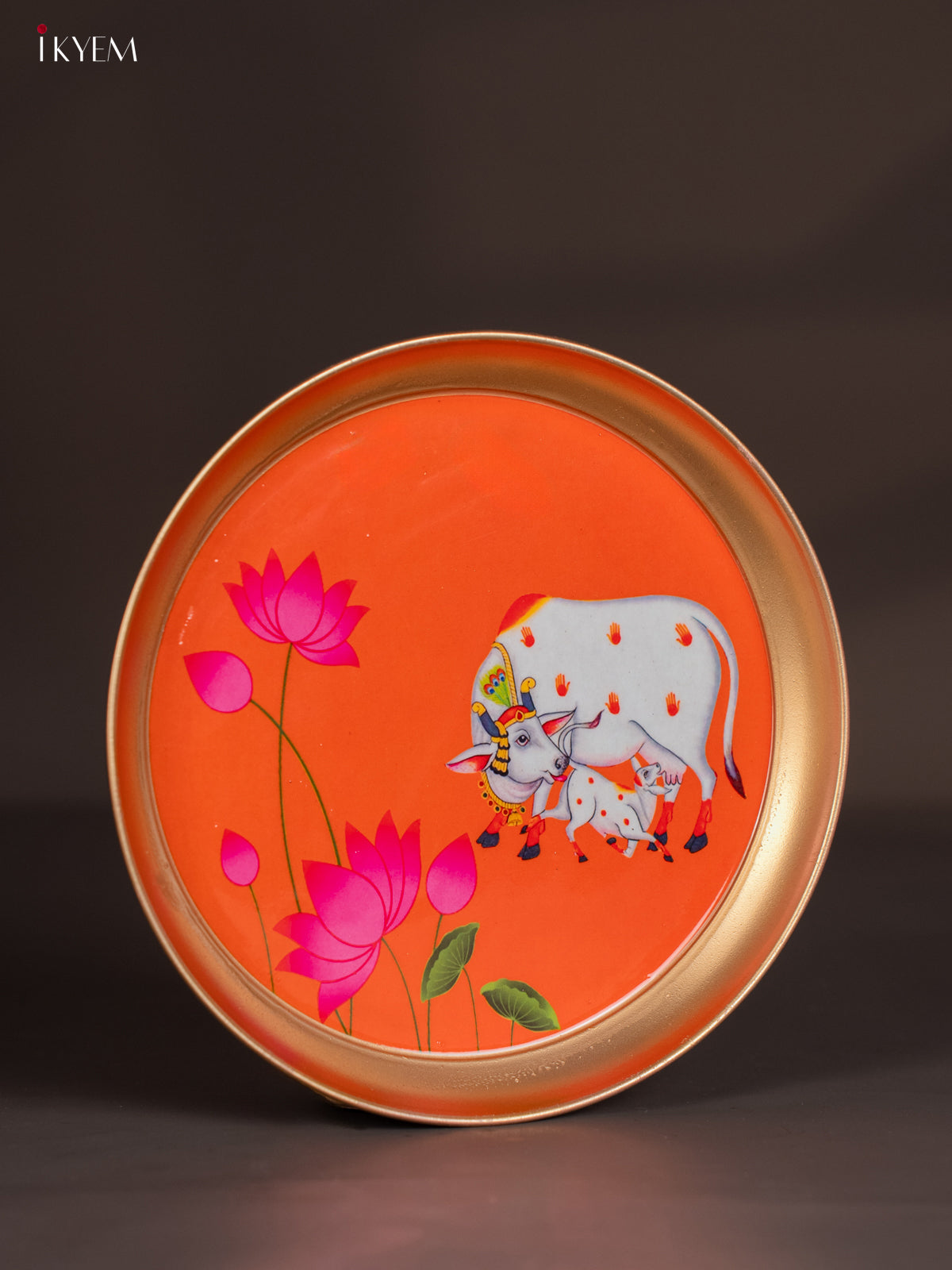 - This 8-inch brass coated plate showcases a bright an Orange with pink cow & Calf with lotus design, perfect for pooja ceremonies and festive occasions.