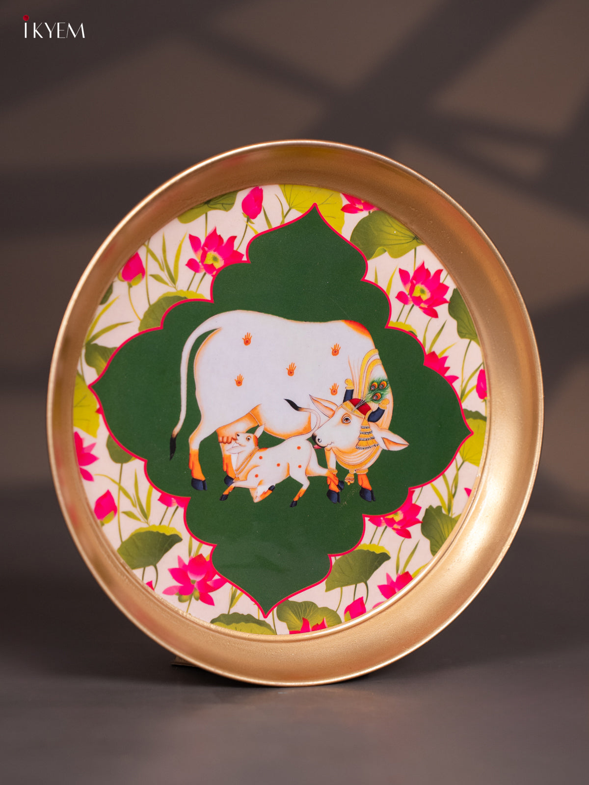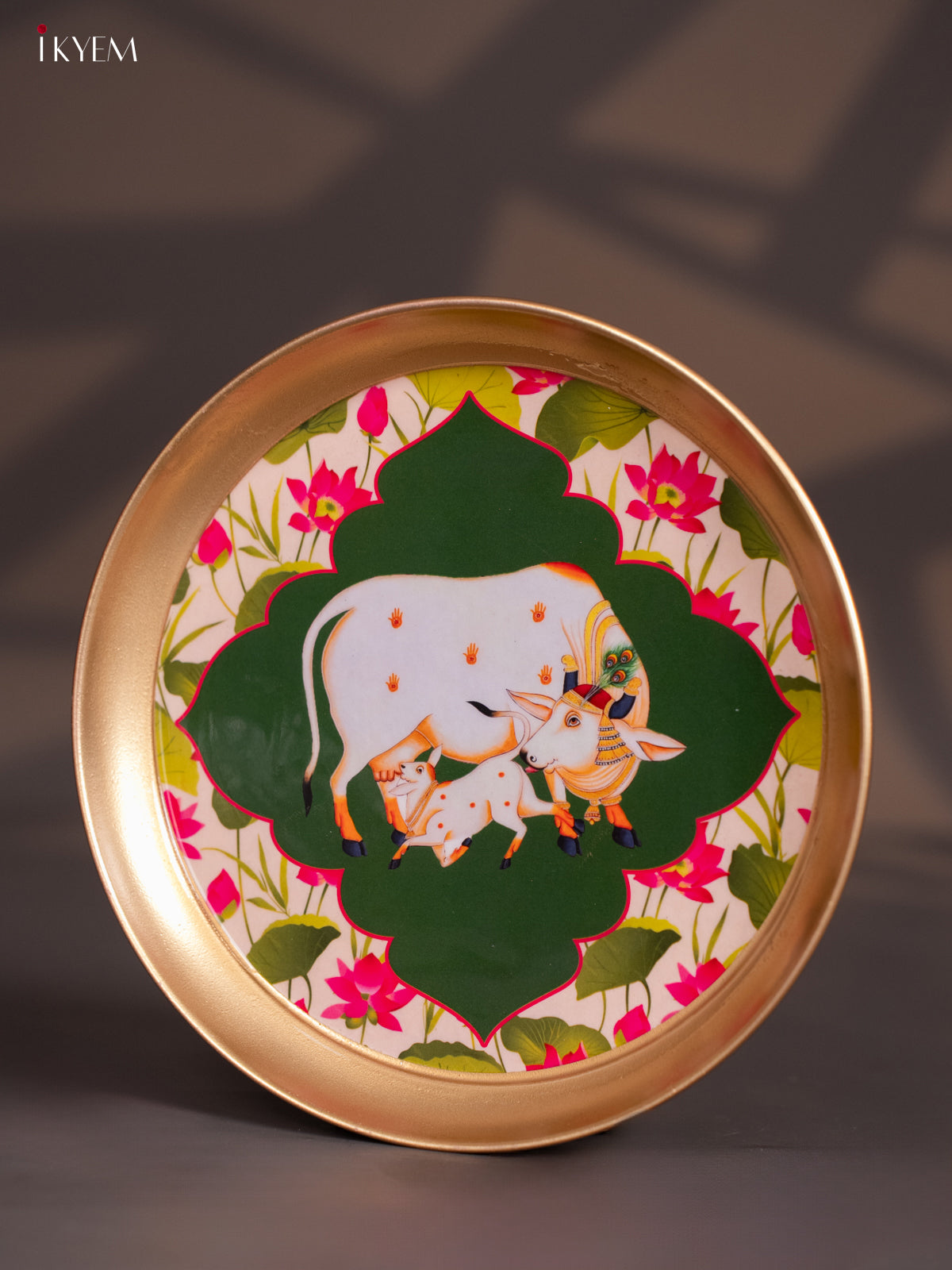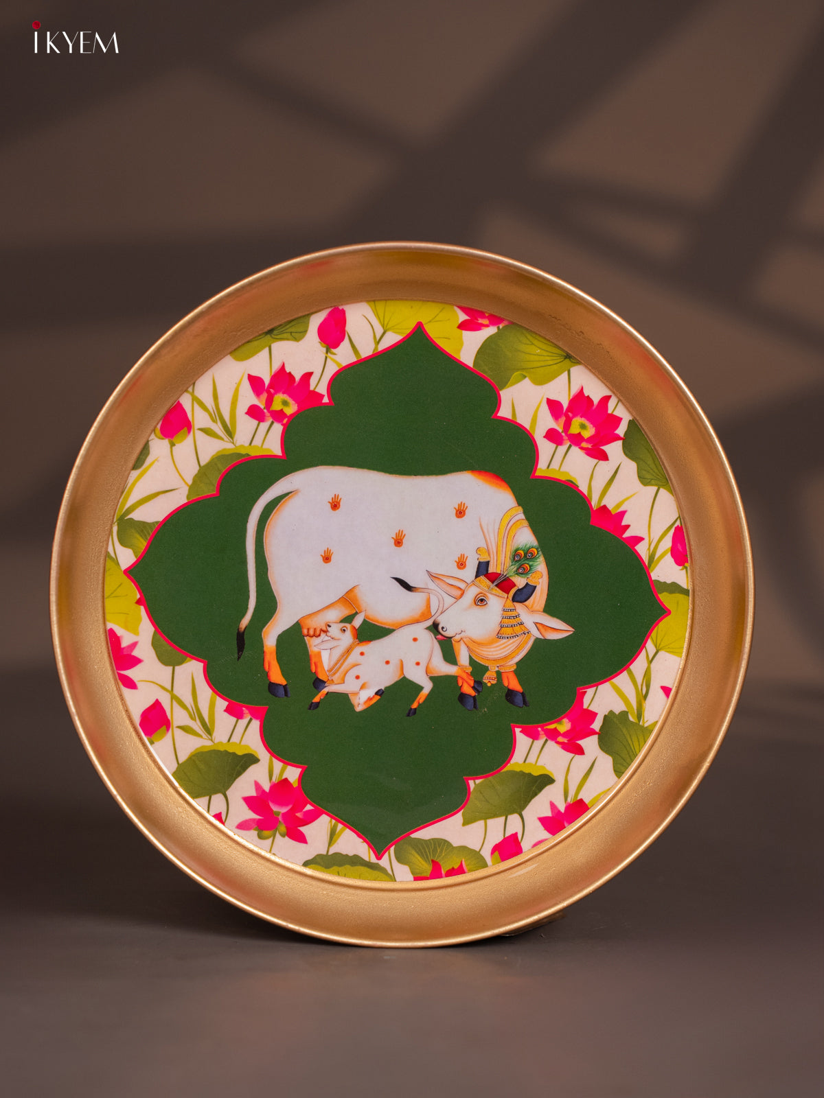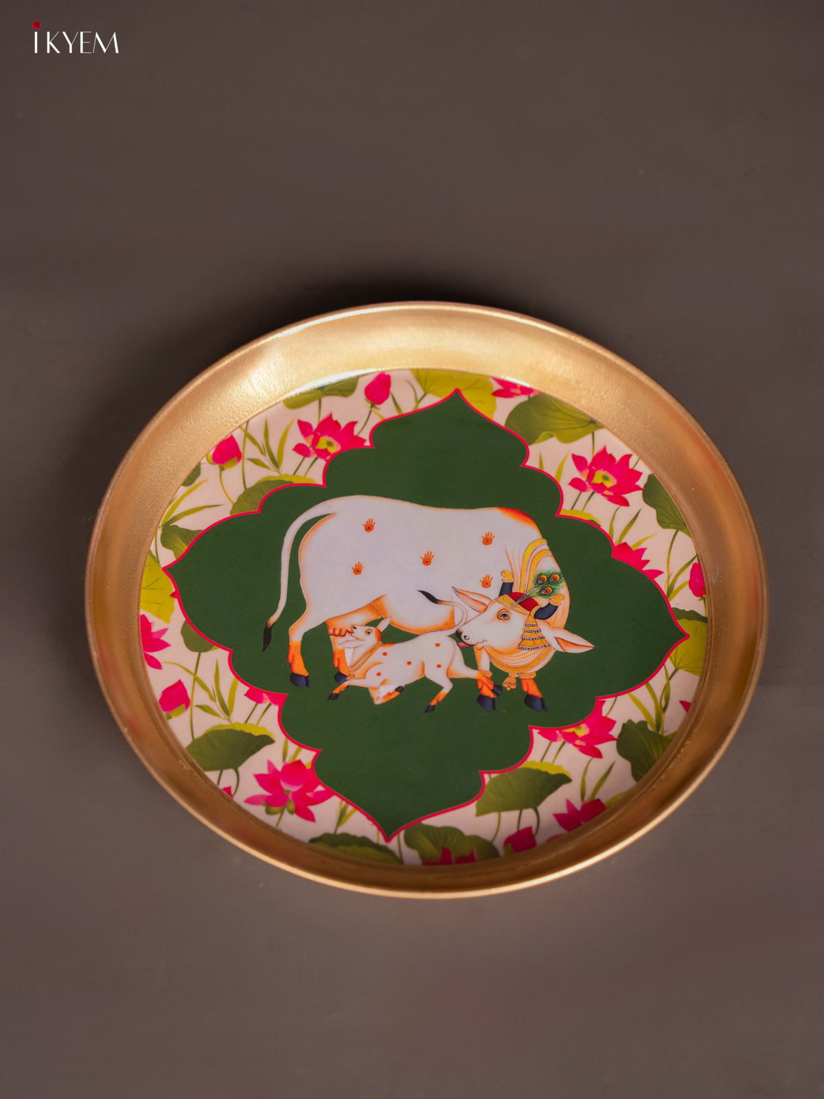 Brass Coated Plate Cow & calf Pichwai - Green - 8 Inches - KI06124