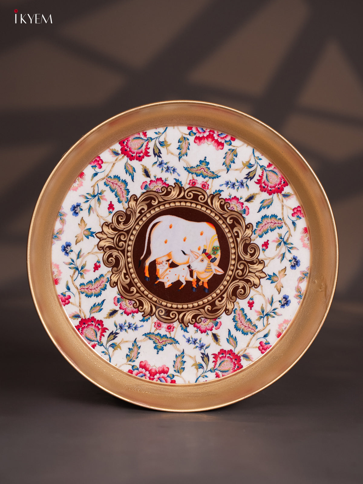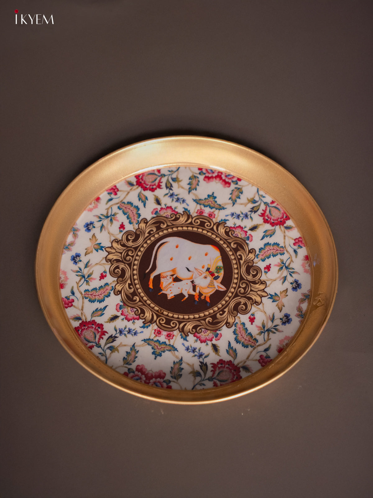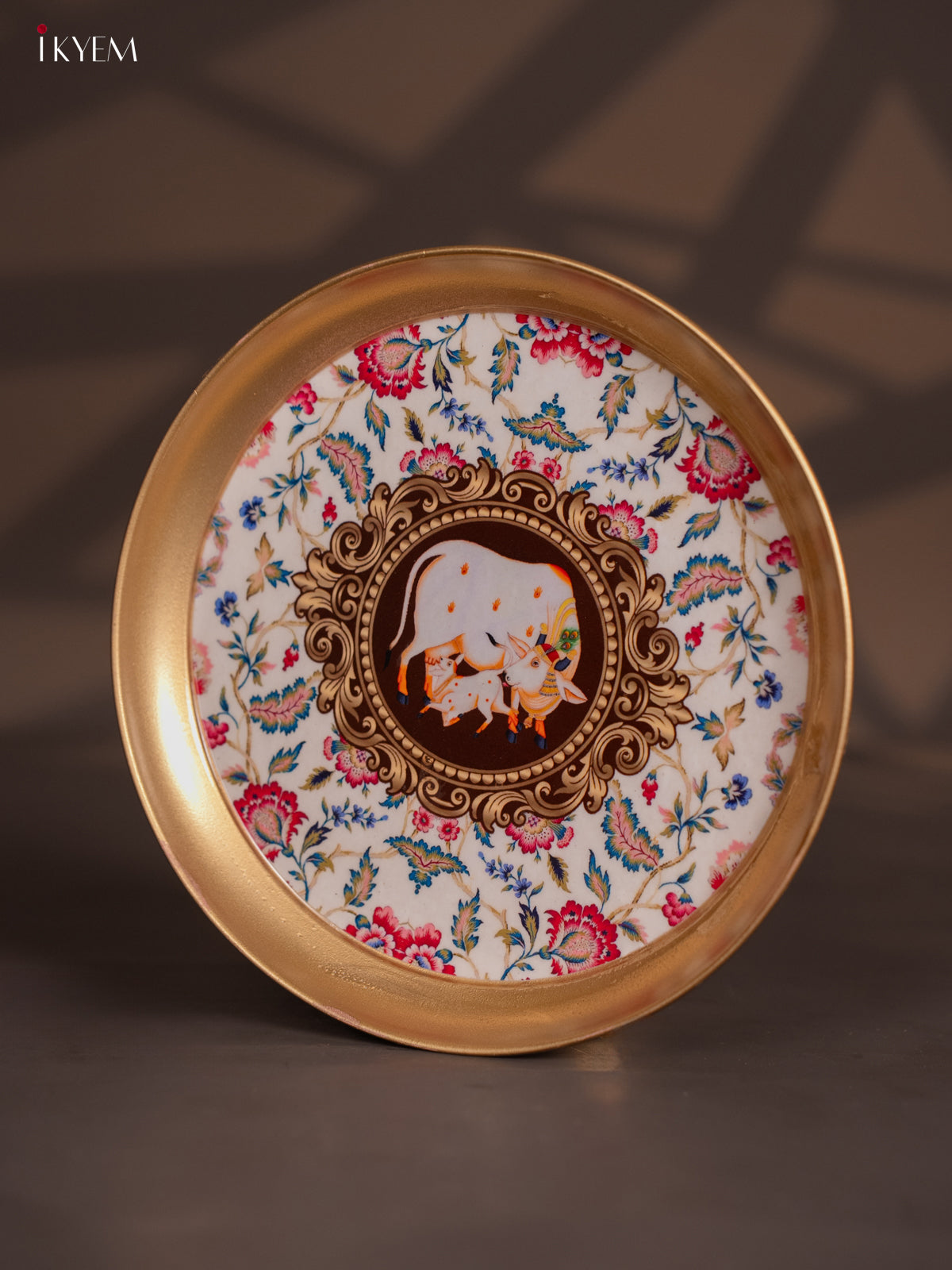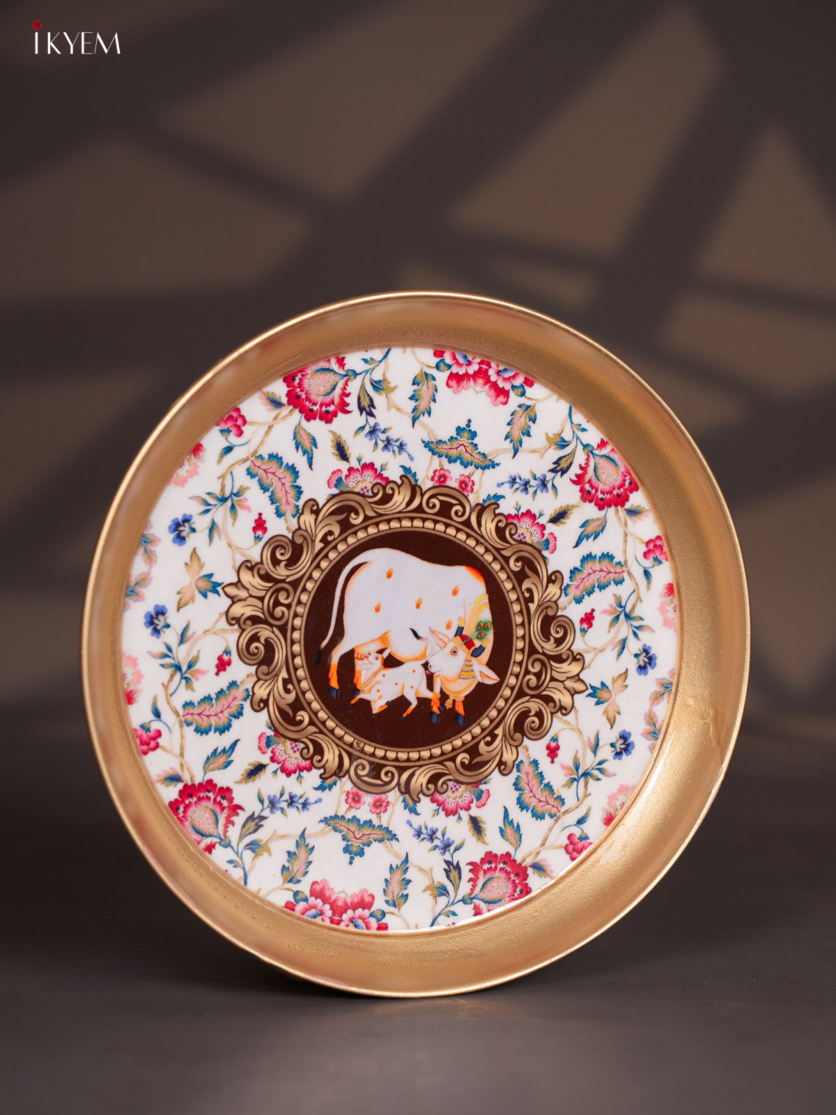 - This 8-inch brass-coated plate features a traditional design of a cow and calf in white with dark brown accents.