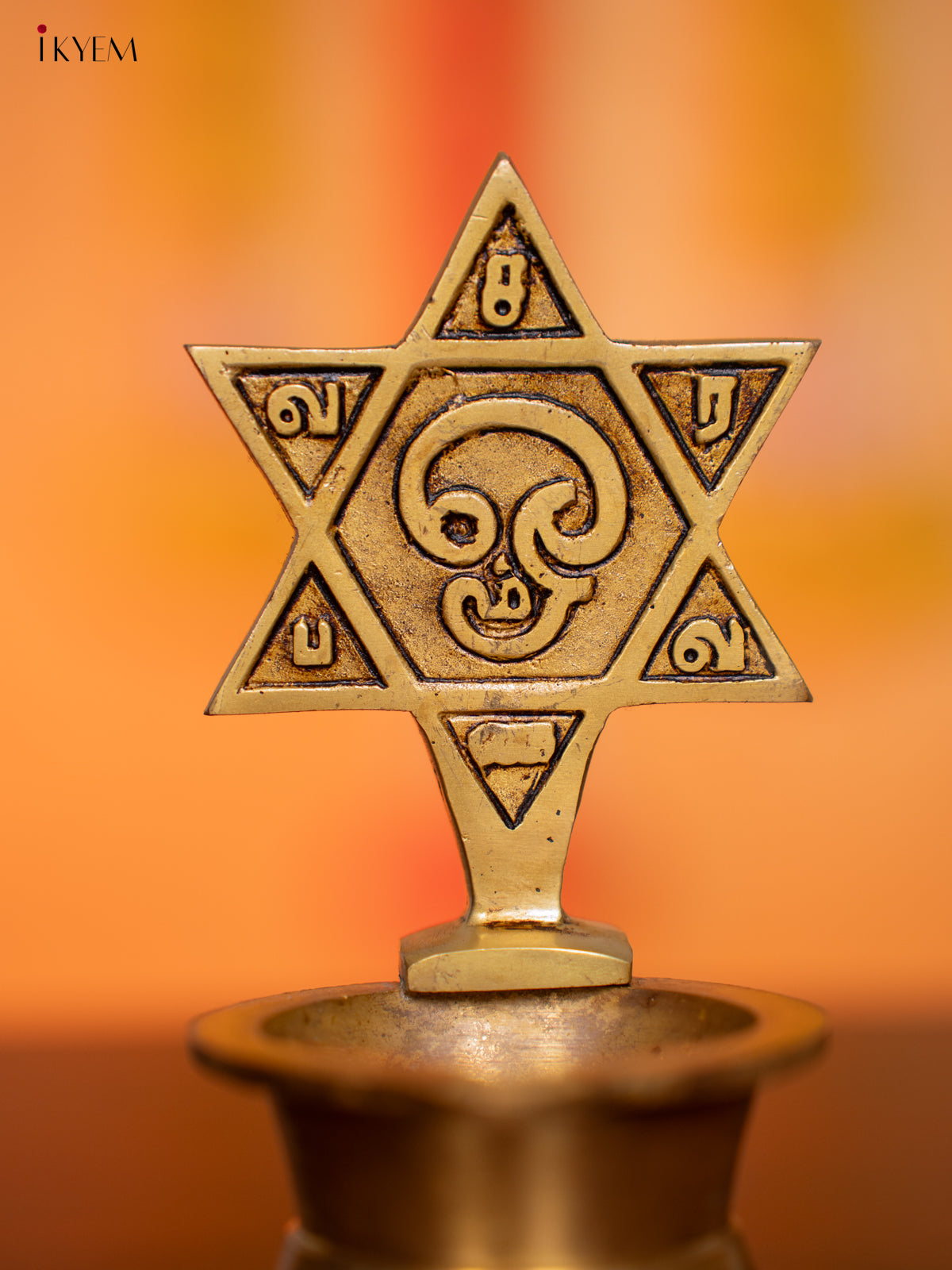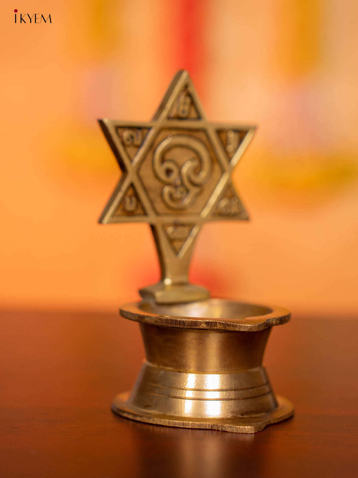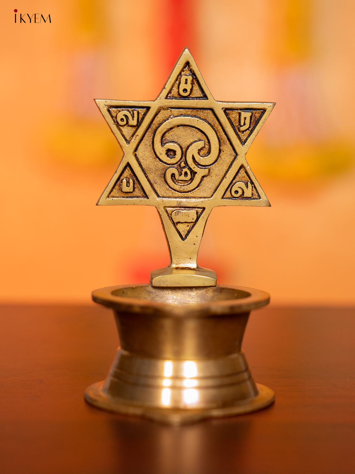 - The Brass Star Diya with Om engraving, measuring 4.5 inches, is crafted from high-quality brass to ensure durability and elegance.