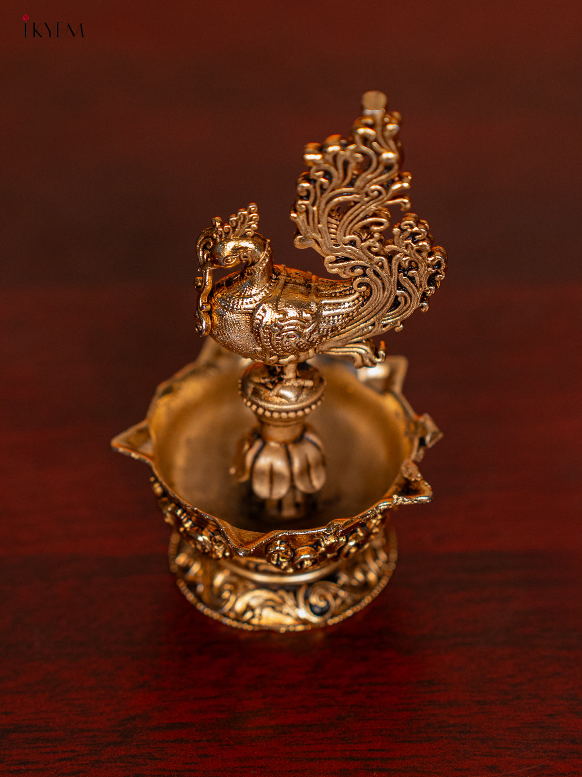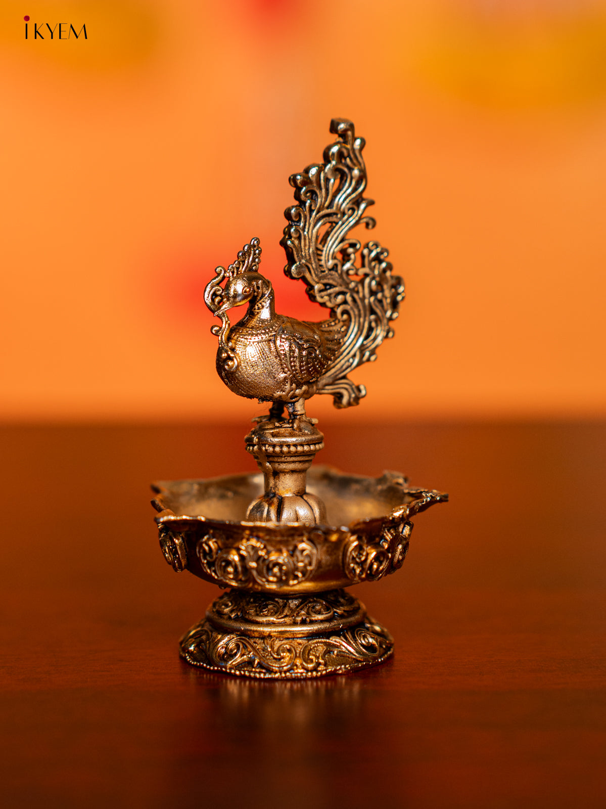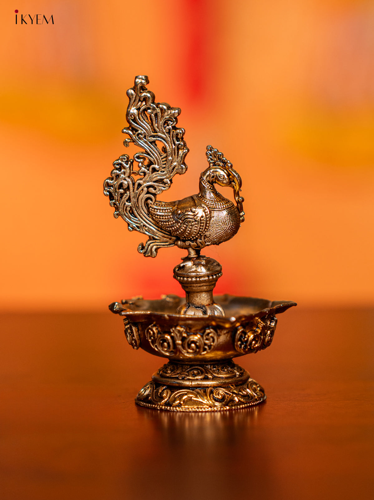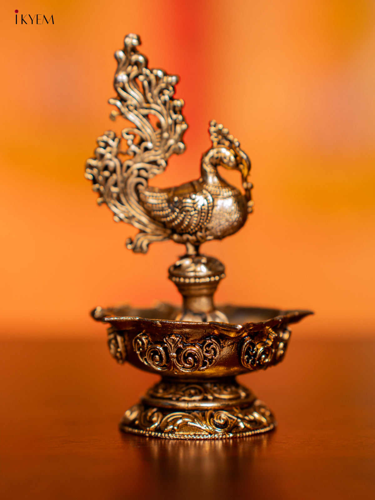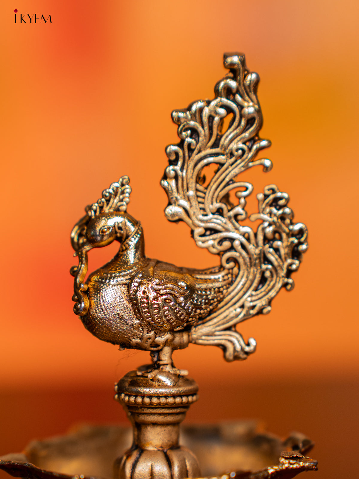 - The Brass 5-face Annapakshi Diya, measuring 3.5 inches, is an elegant addition to your pooja setup.