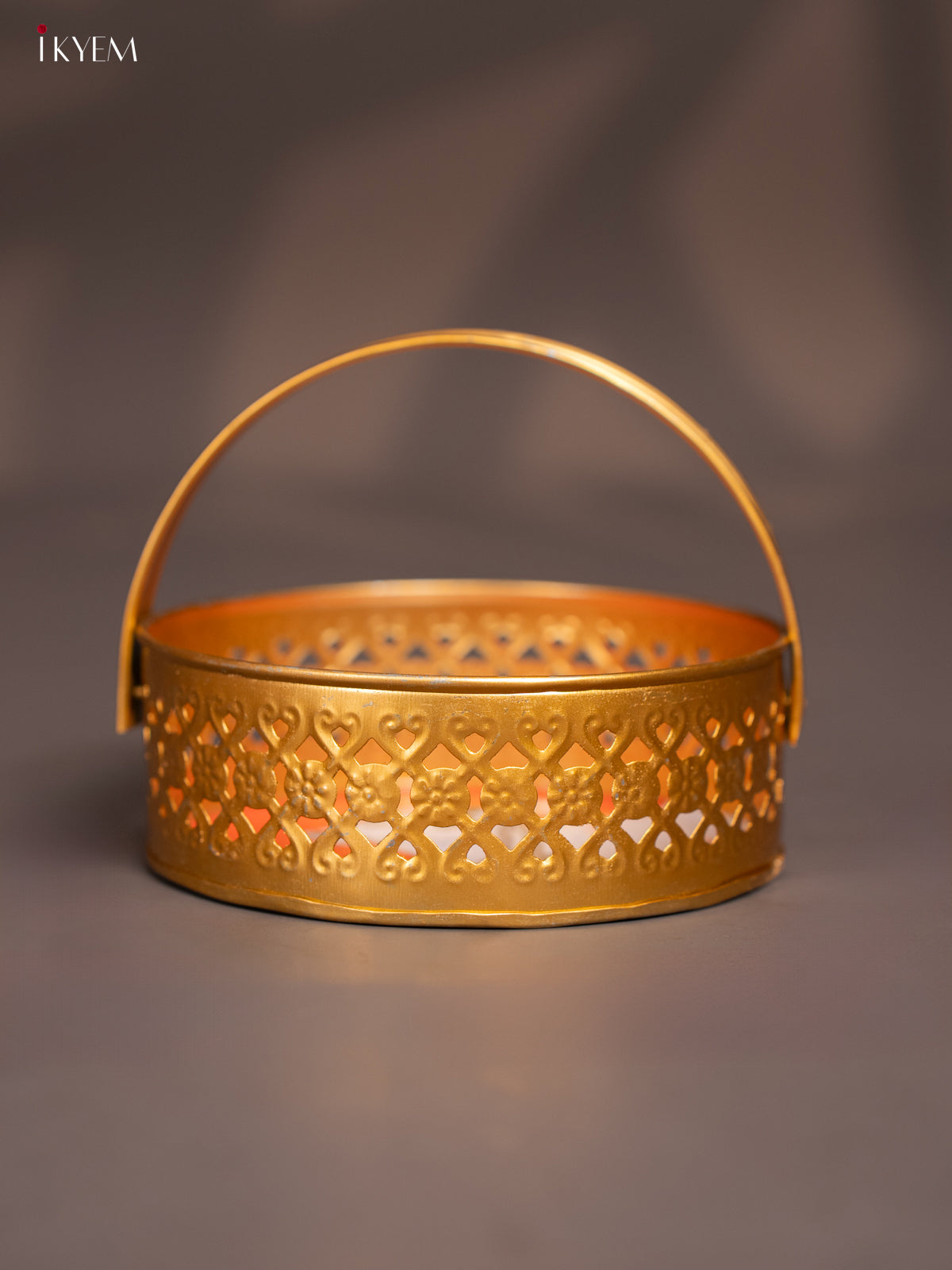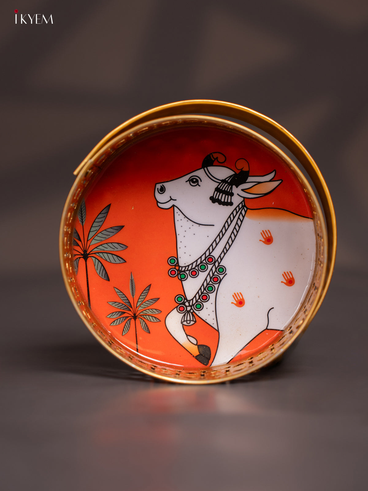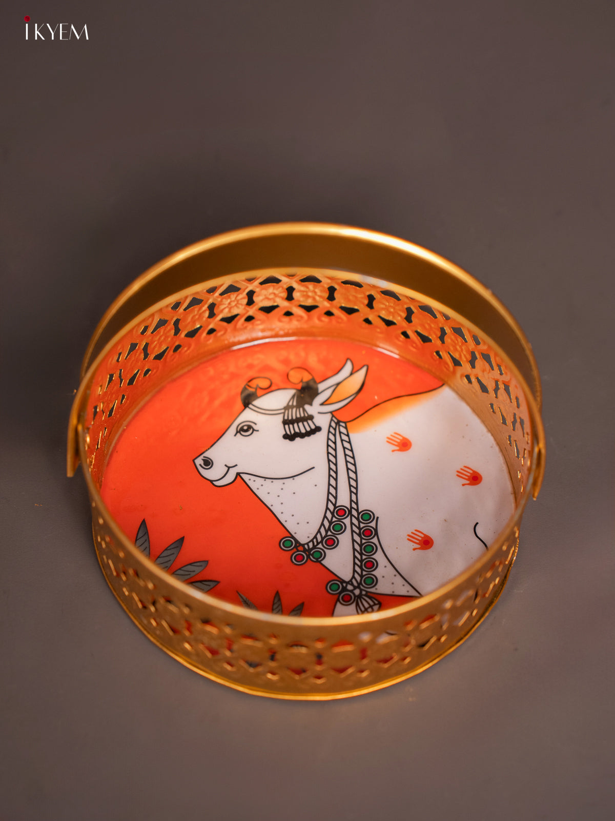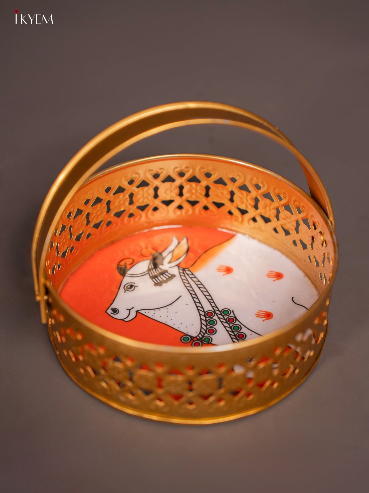 - This 6-inch round metal tray features an eye-catching orange color with a traditional cow print, perfect for pooja rituals or as distinctive return gifts.