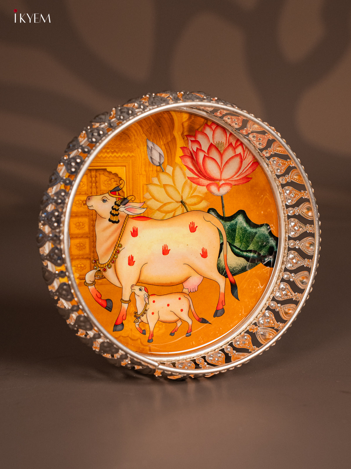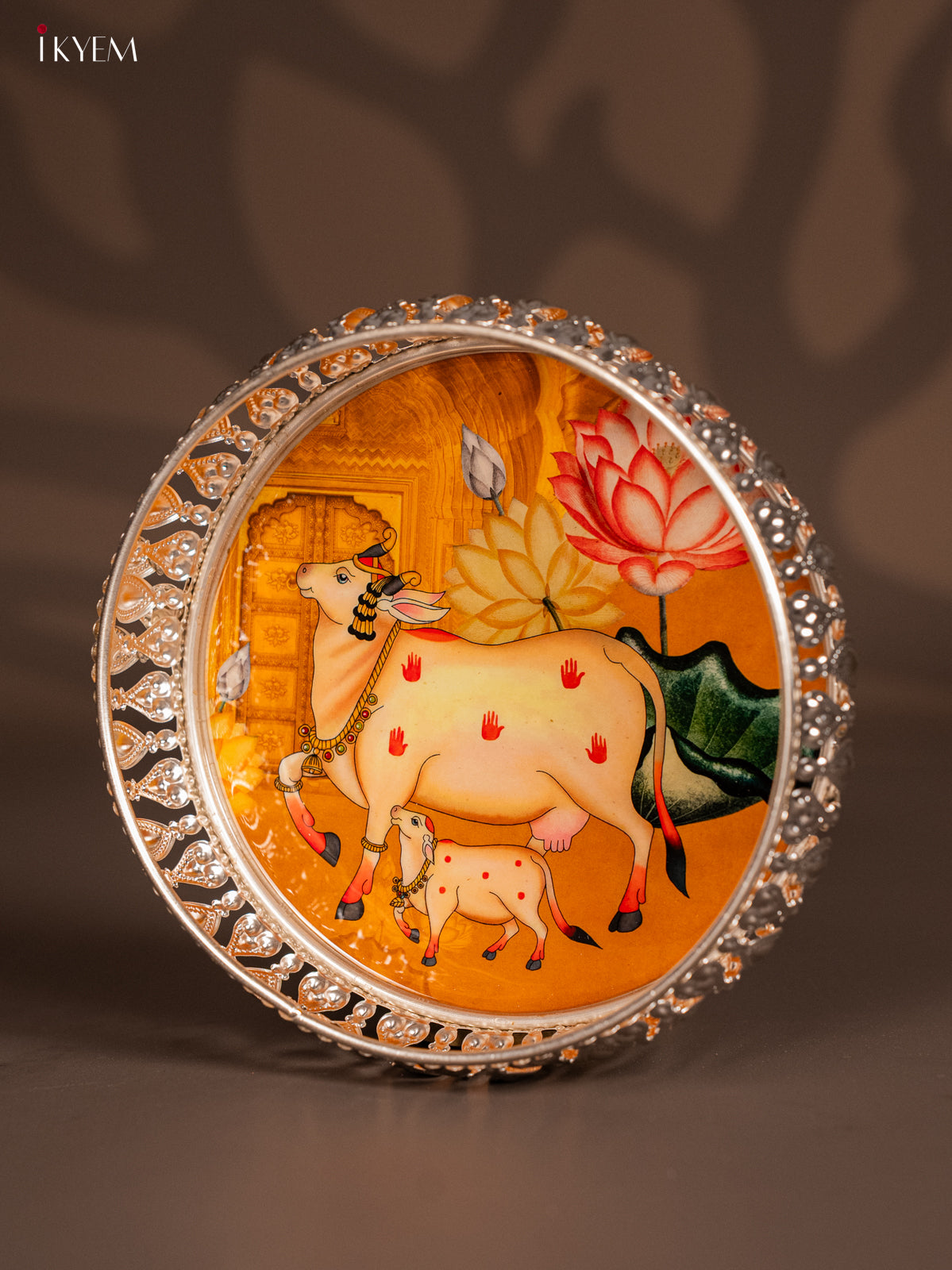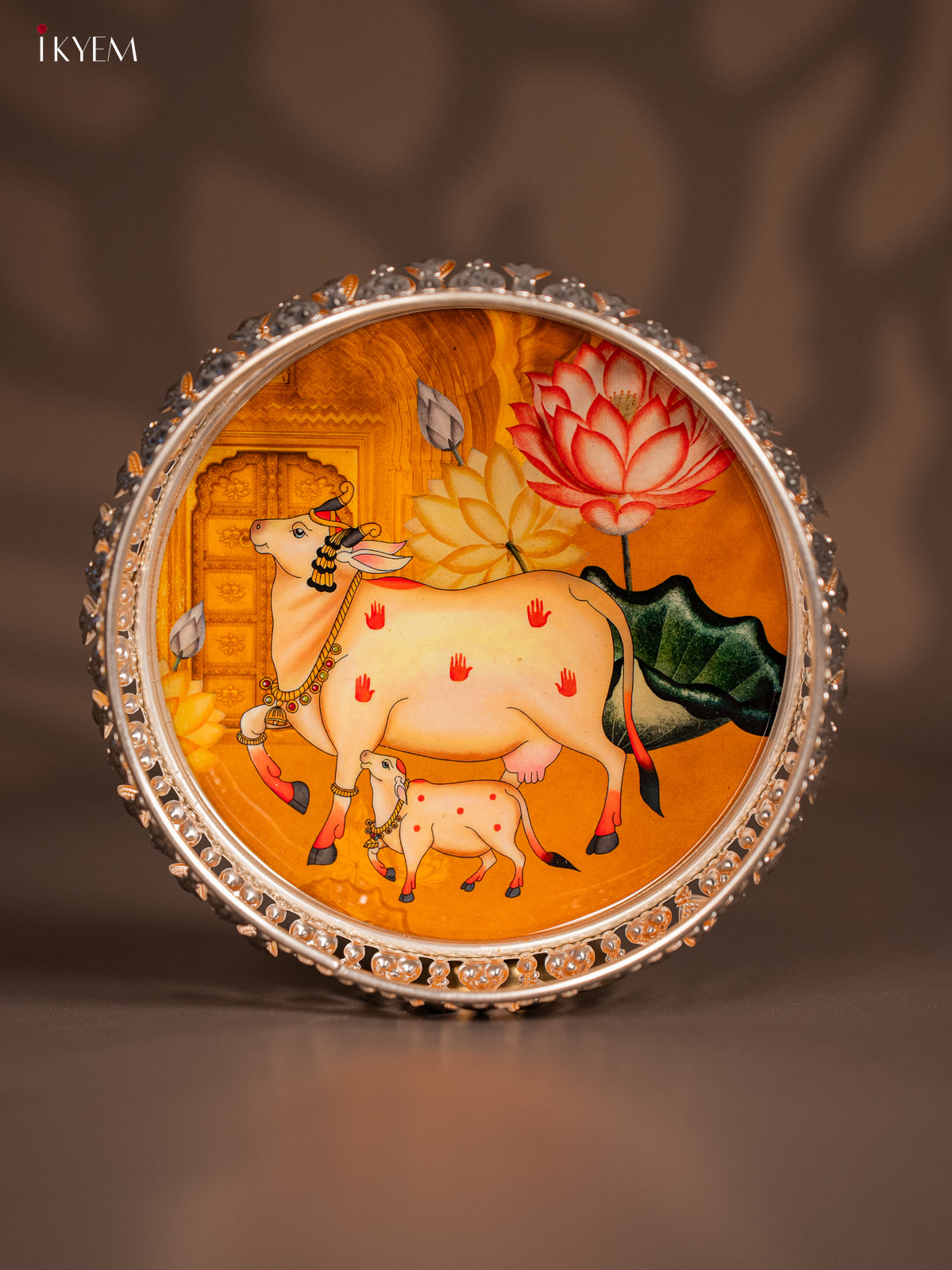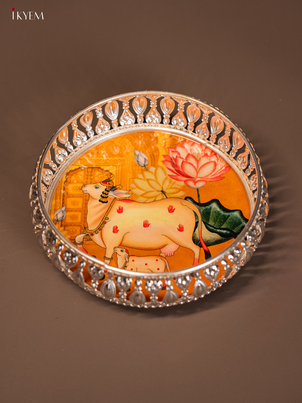 - This 6-inch digital printed German silver tray features a vibrant yellow design showcasing a cow and calf motif, ideal for pooja rituals and elegant return gifts.