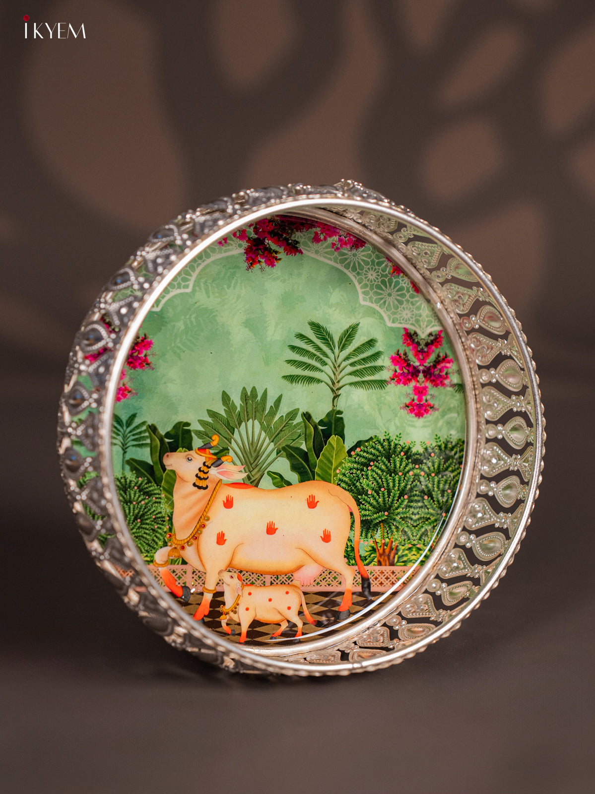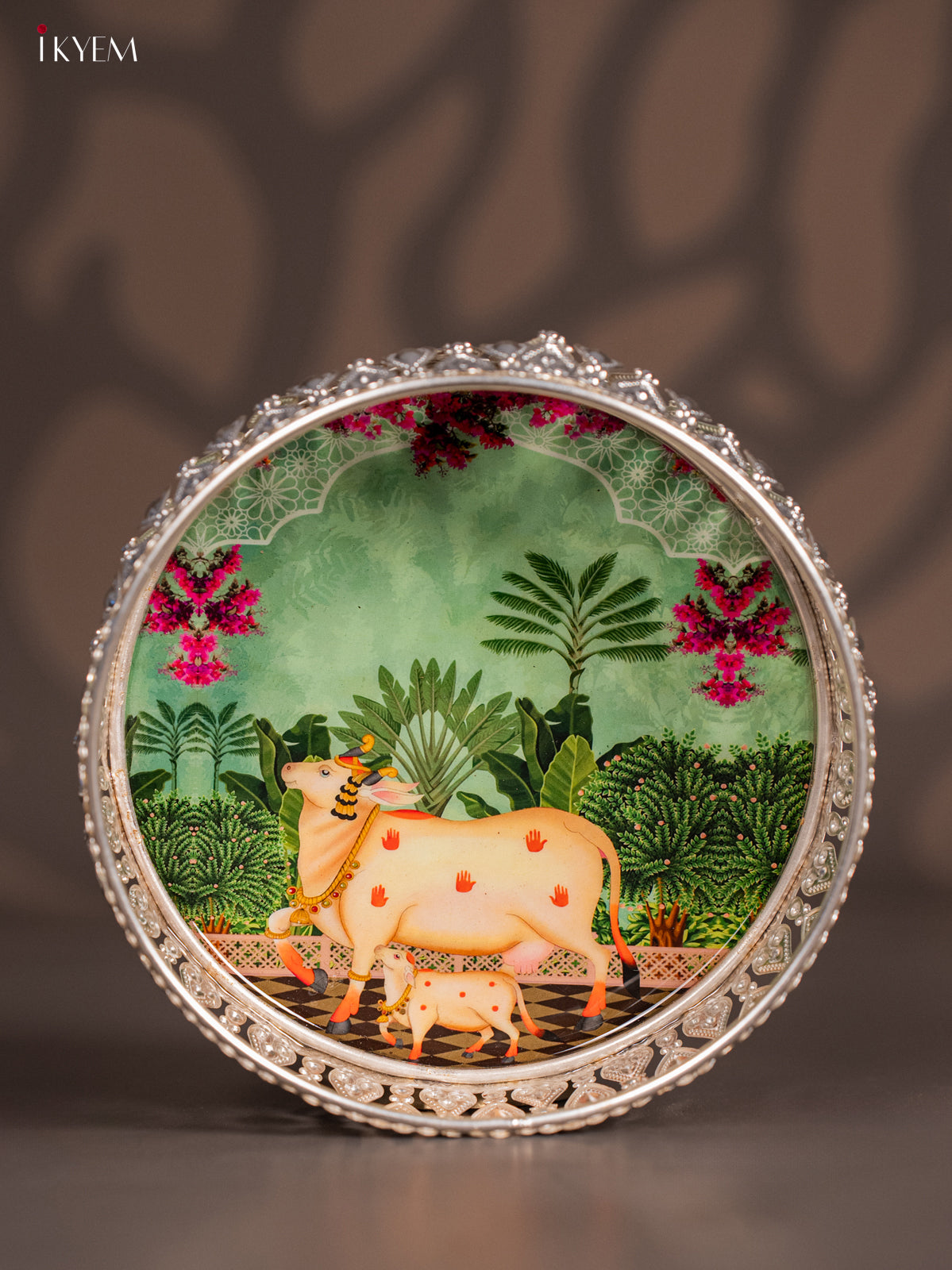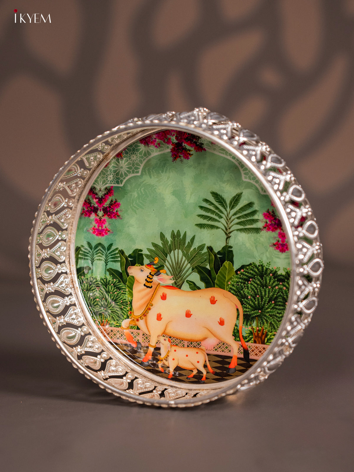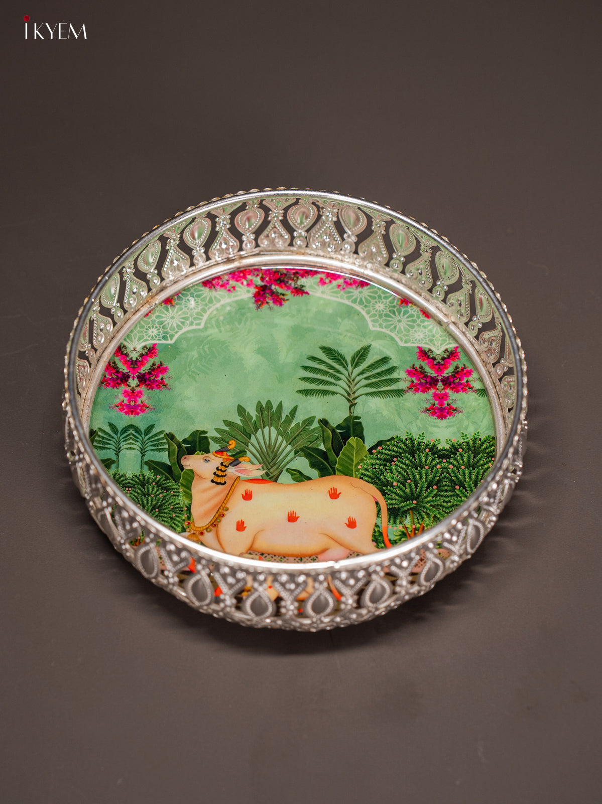 - This 6-inch digital printed German silver tray features a vibrant green design showcasing a cow and calf motif, ideal for pooja rituals and elegant return gifts.
