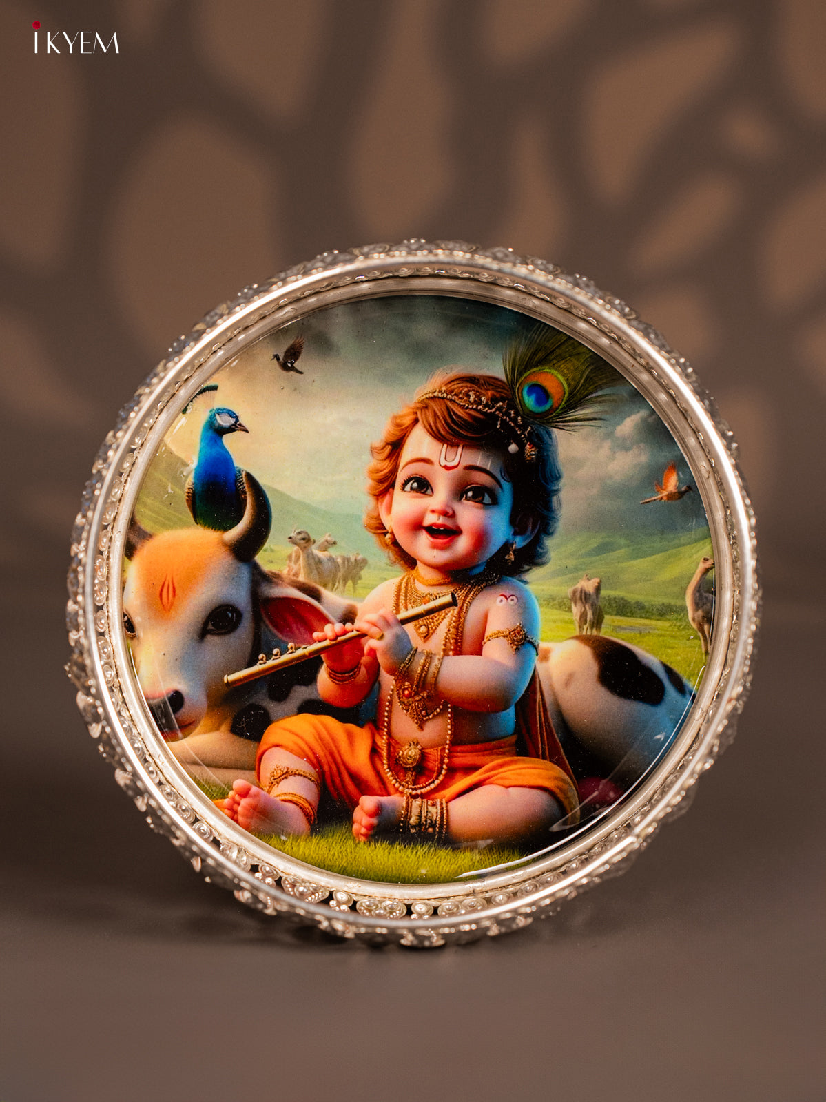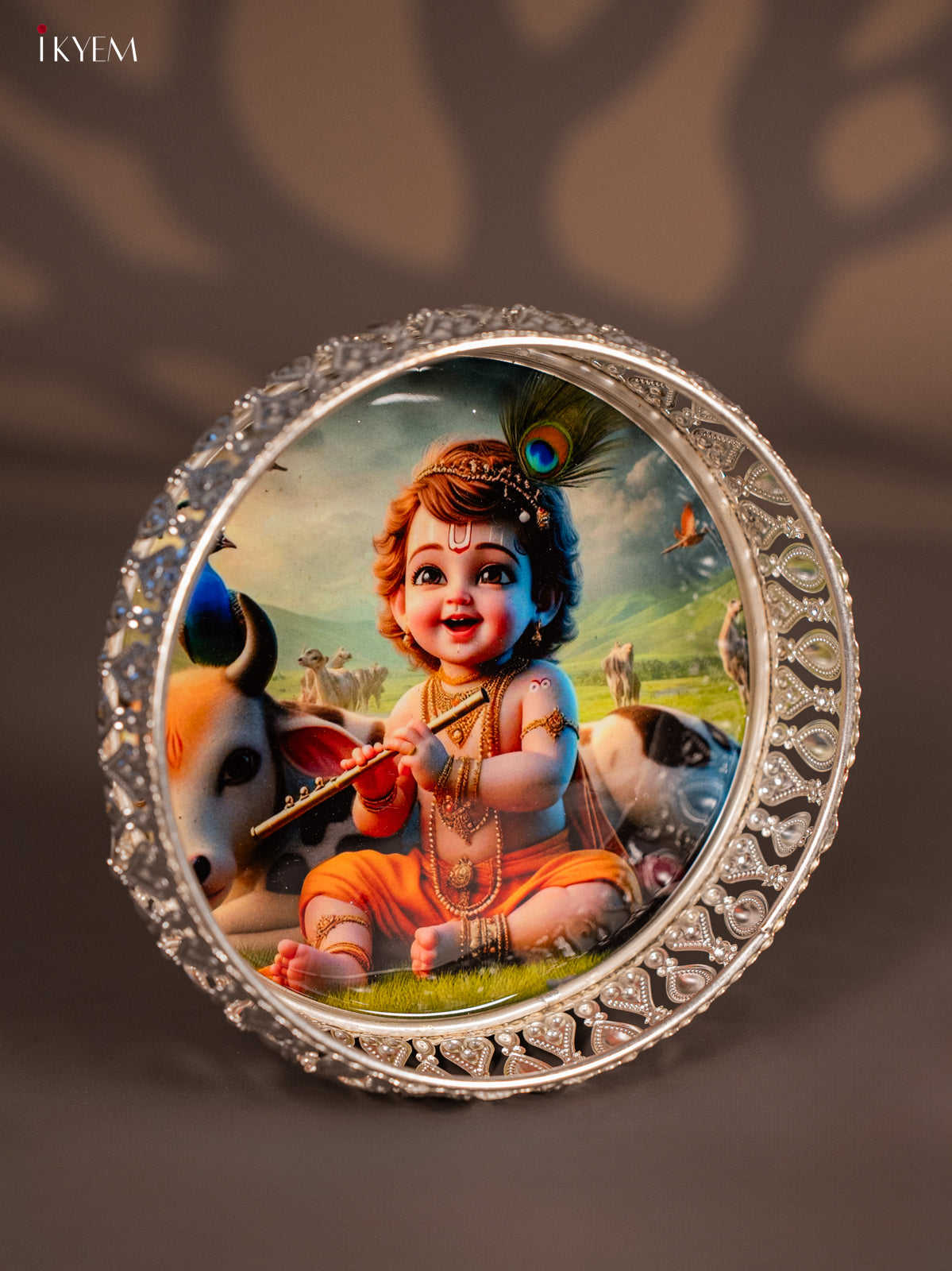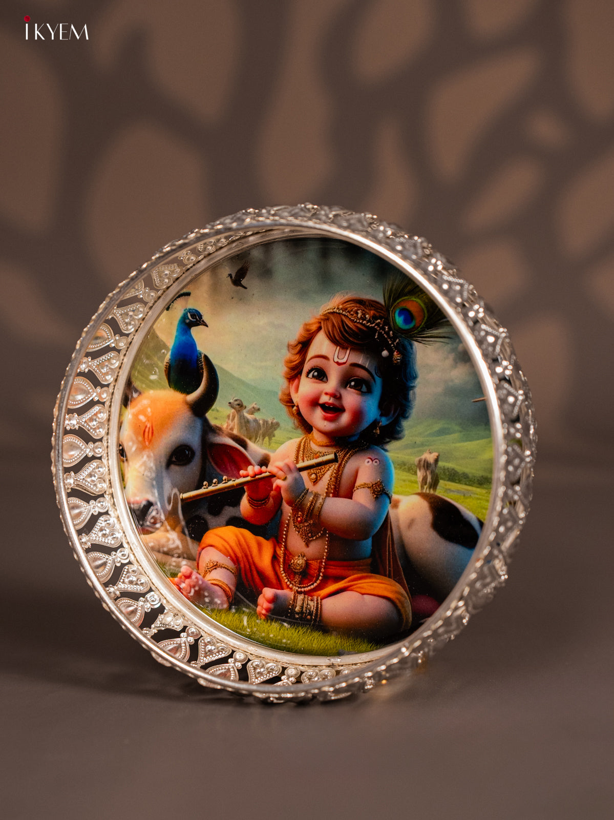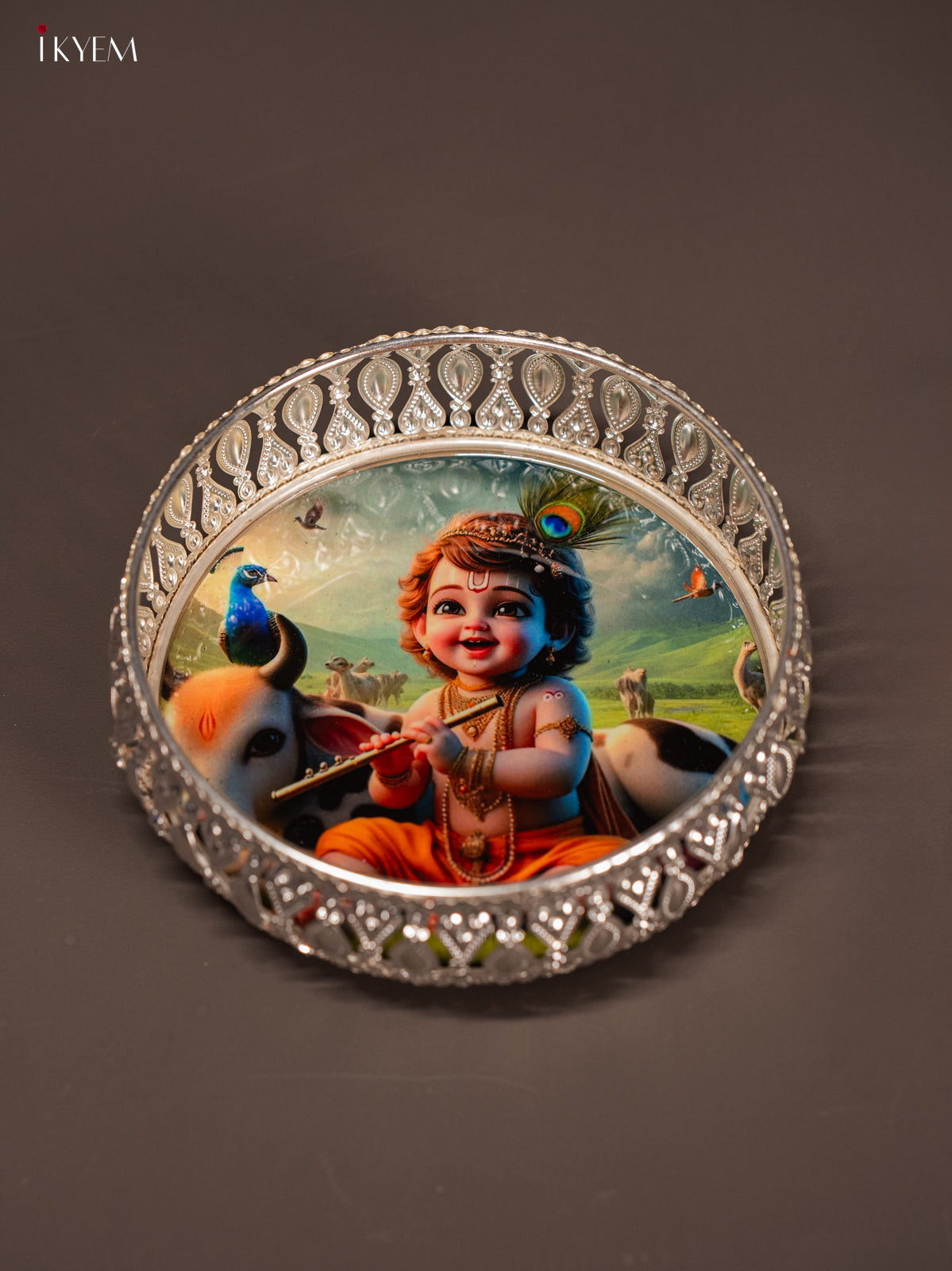 Digital Printed German Silver Tray - Krishna with Cow - 6 Inches - KI10120