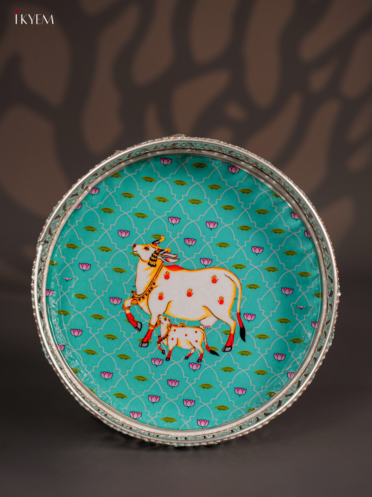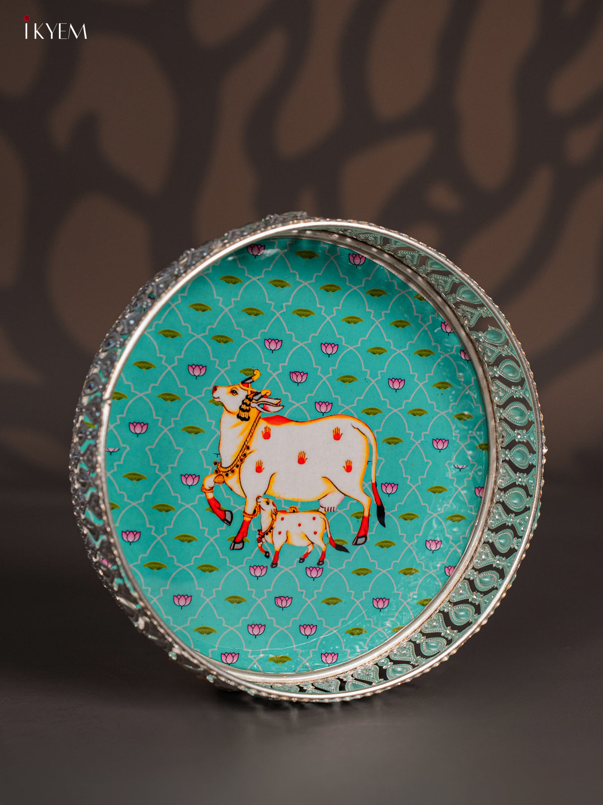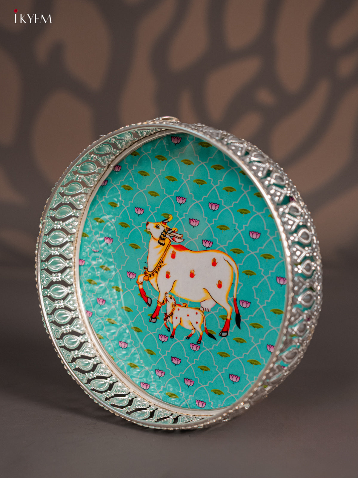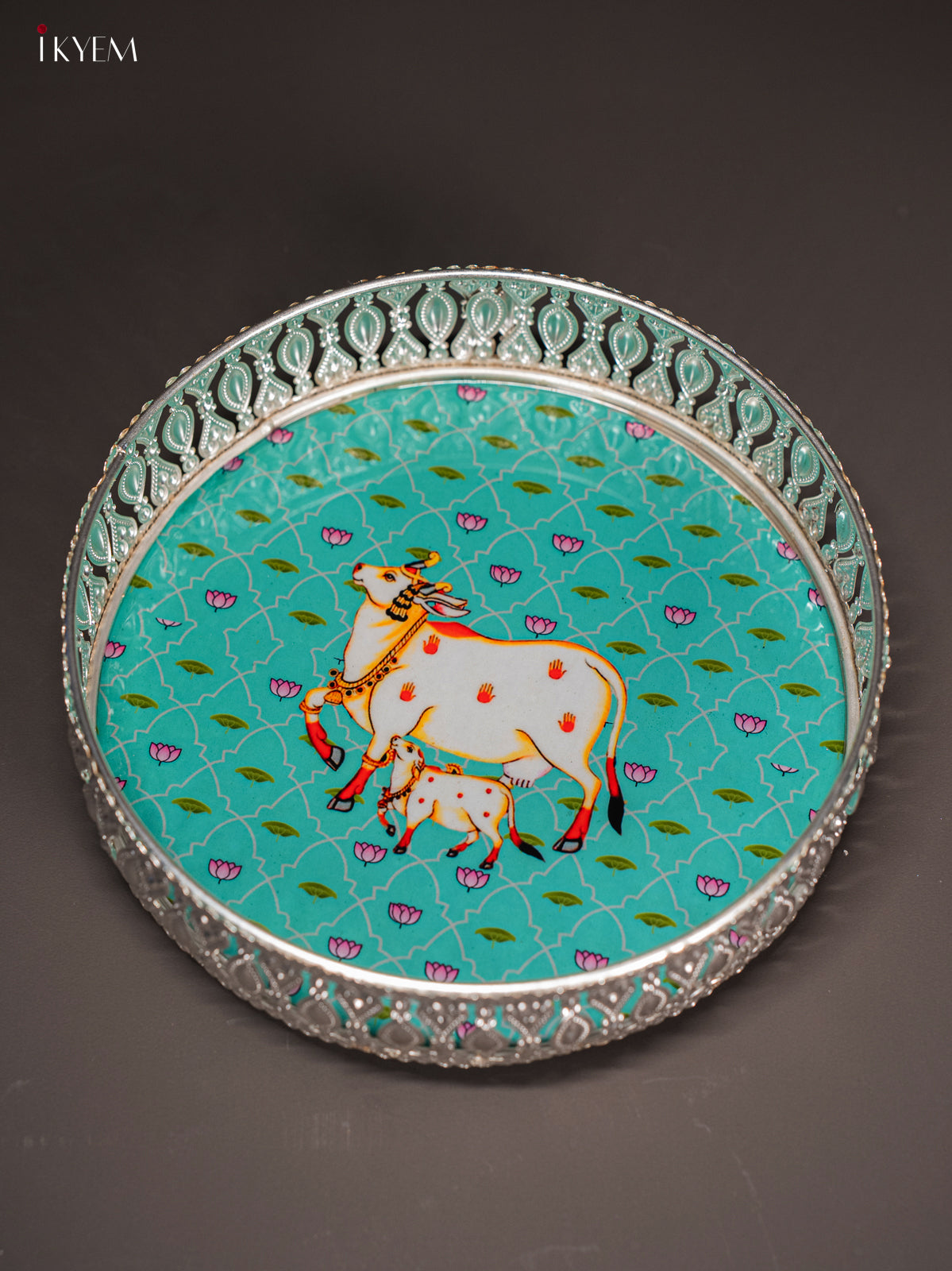 - This 8-inch digital printed German silver tray features a vibrant green design showcasing a cow and calf motif, ideal for pooja rituals and elegant return gifts.