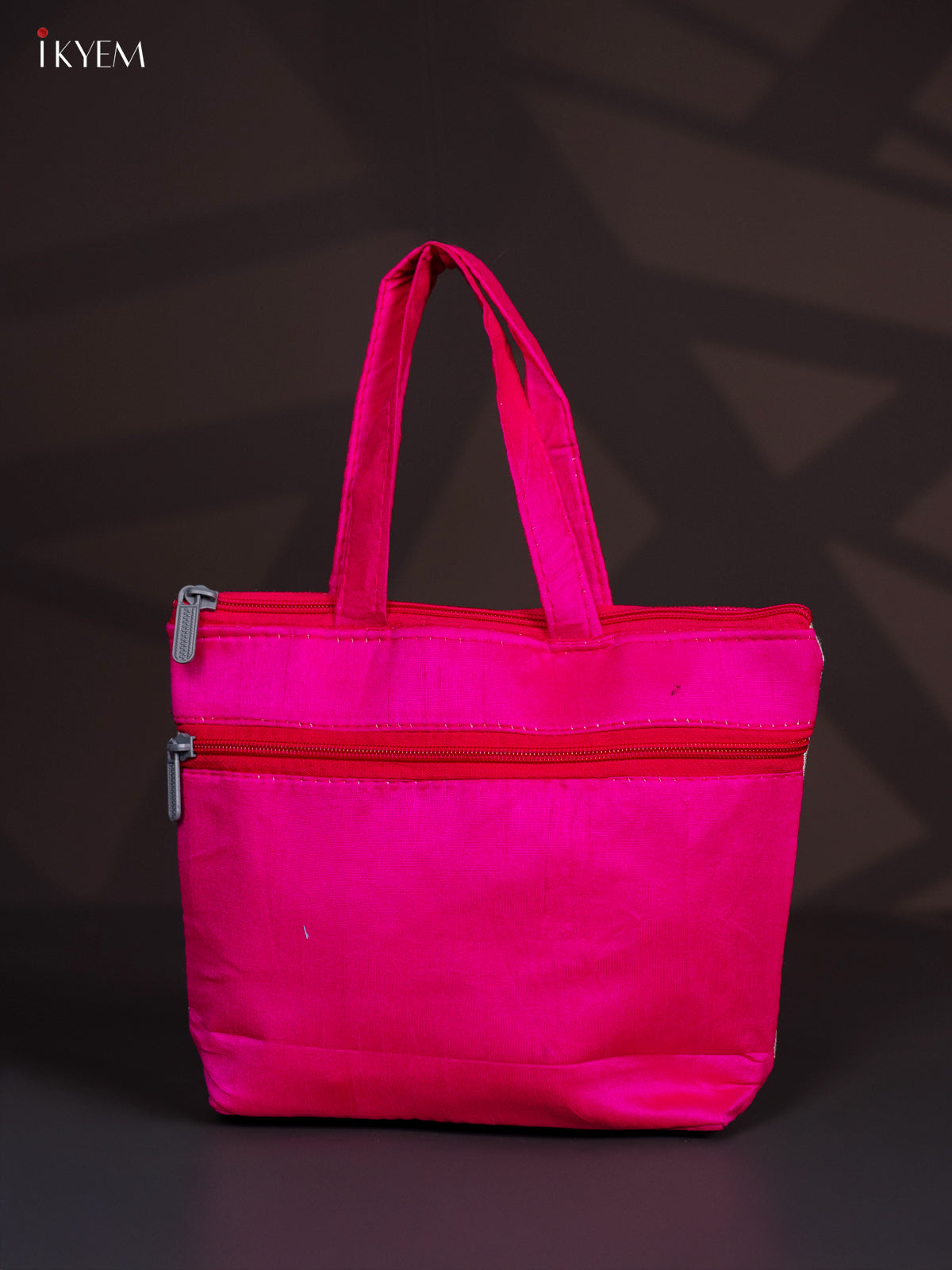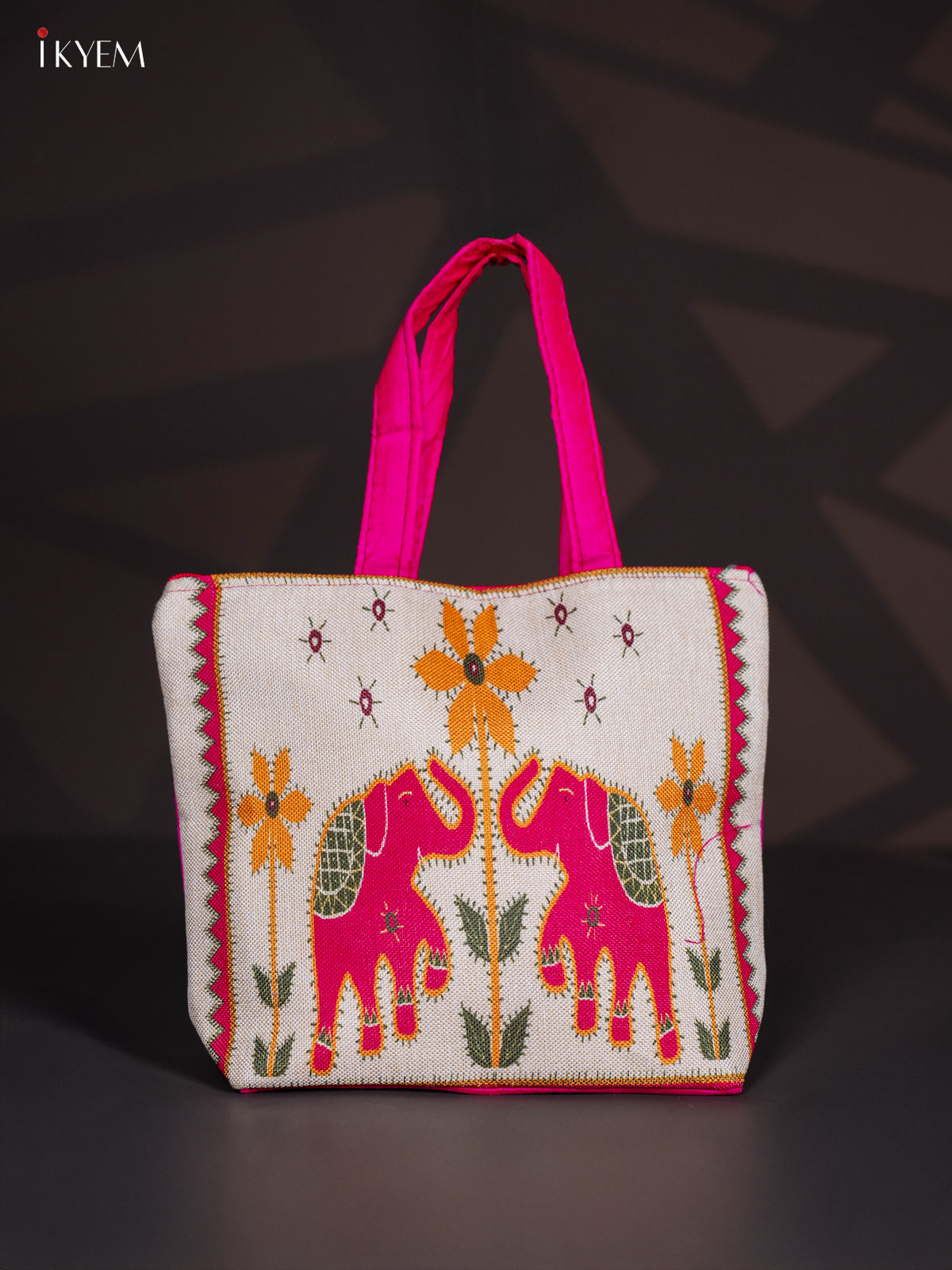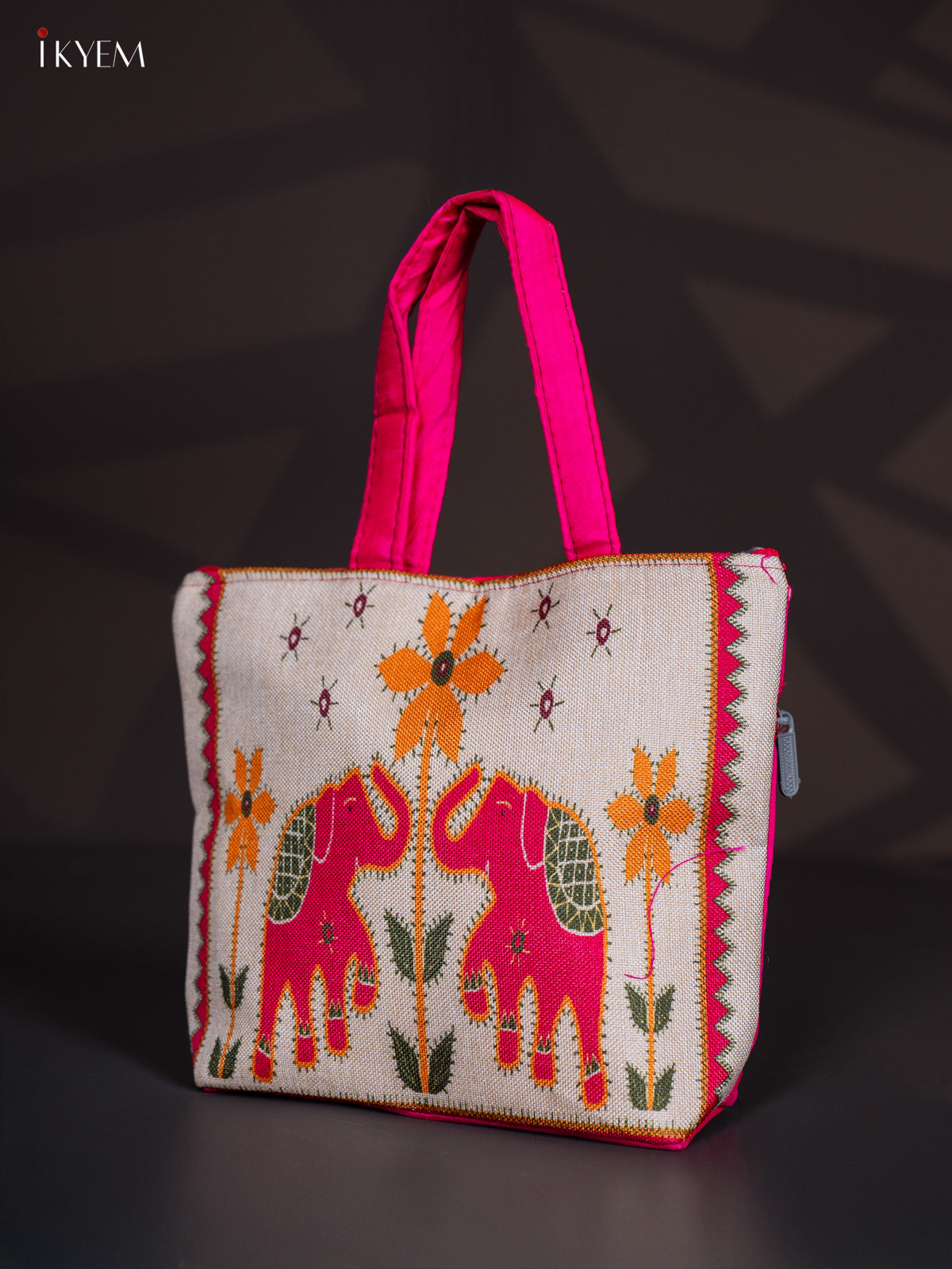 - The Elephant Design Jute Handbag in pink is a sustainable accessory crafted from durable jute material, featuring an elegant elephant motif.