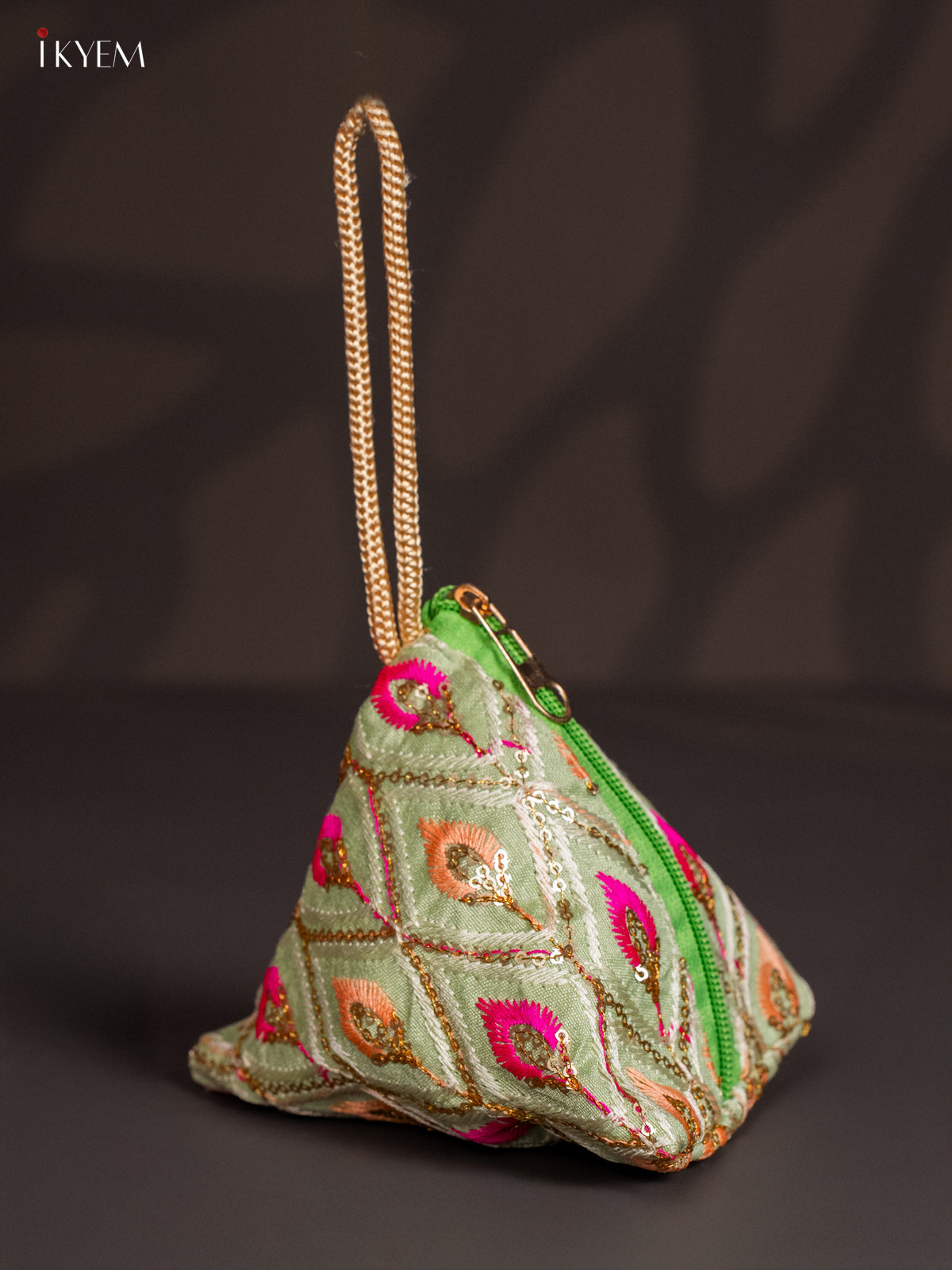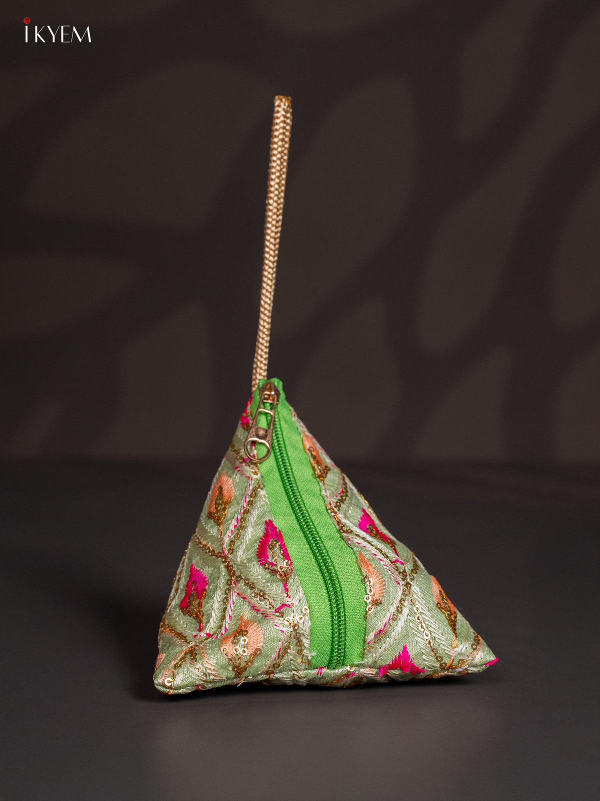 - This embroidered samosa-shaped pouch with designs features a secure zipper closure, making it an ideal accessory for storing small trinkets and essentials.