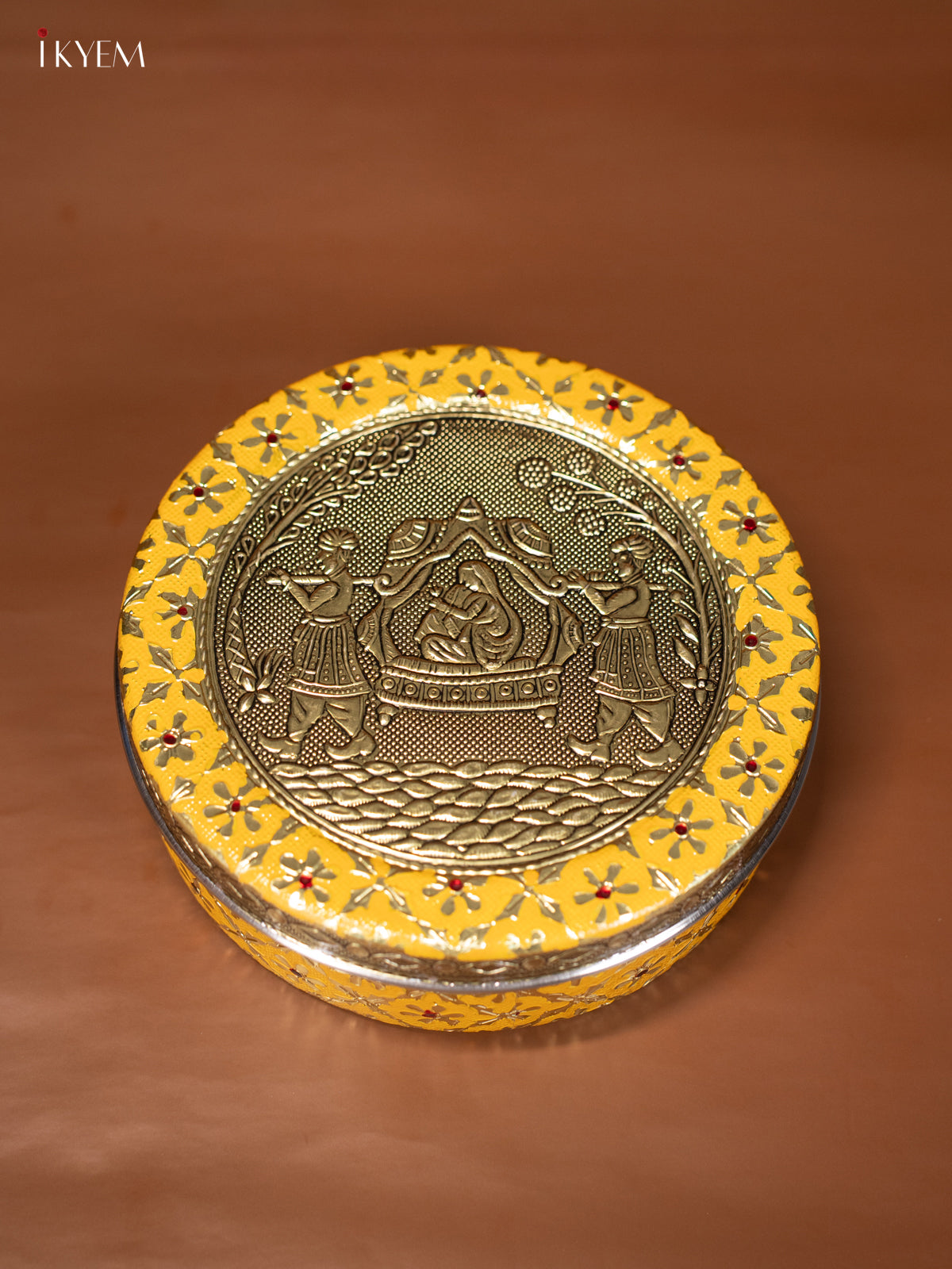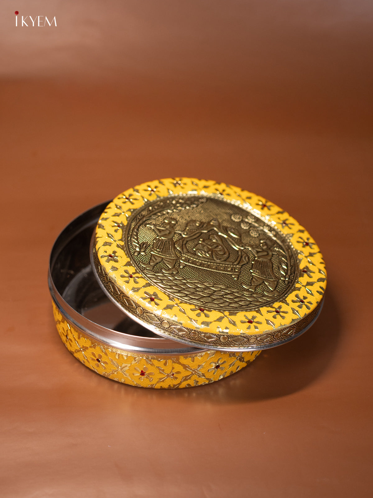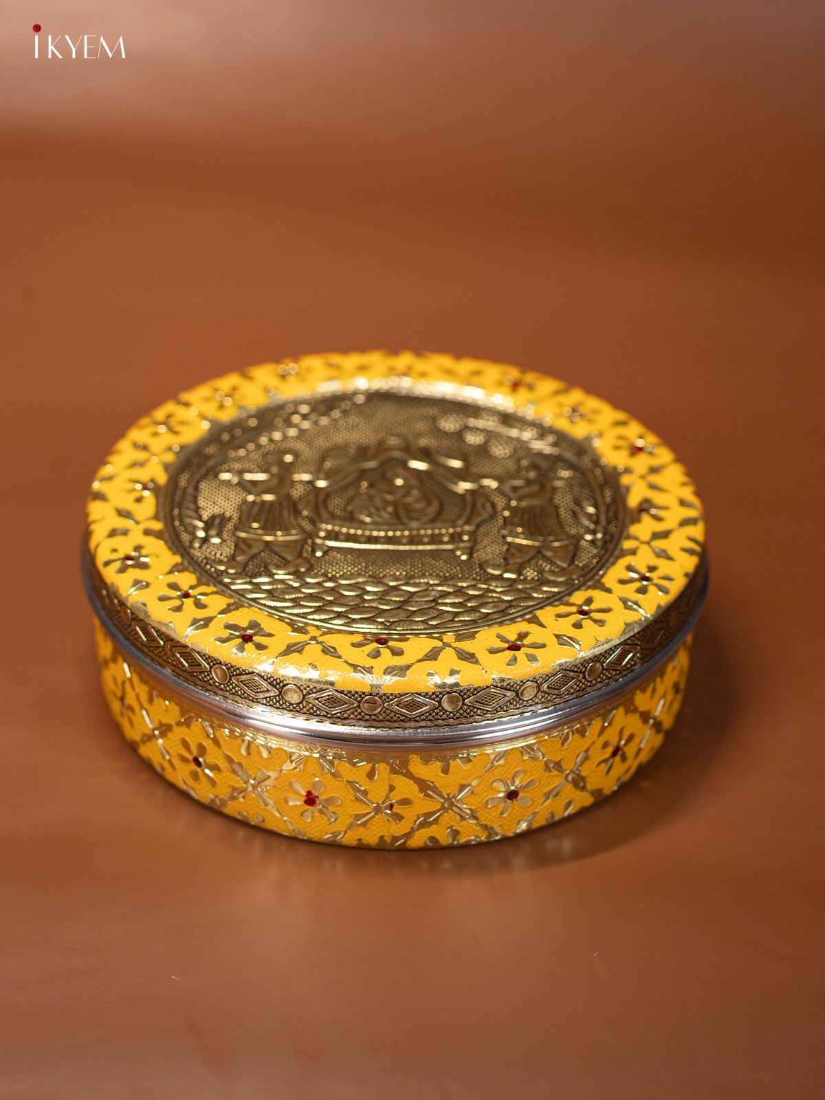 - This 7.5-inch yellow Meenakari box showcases an elegant oxidized Pallakku design, combining traditional craftsmanship with functional appeal.