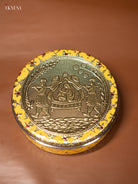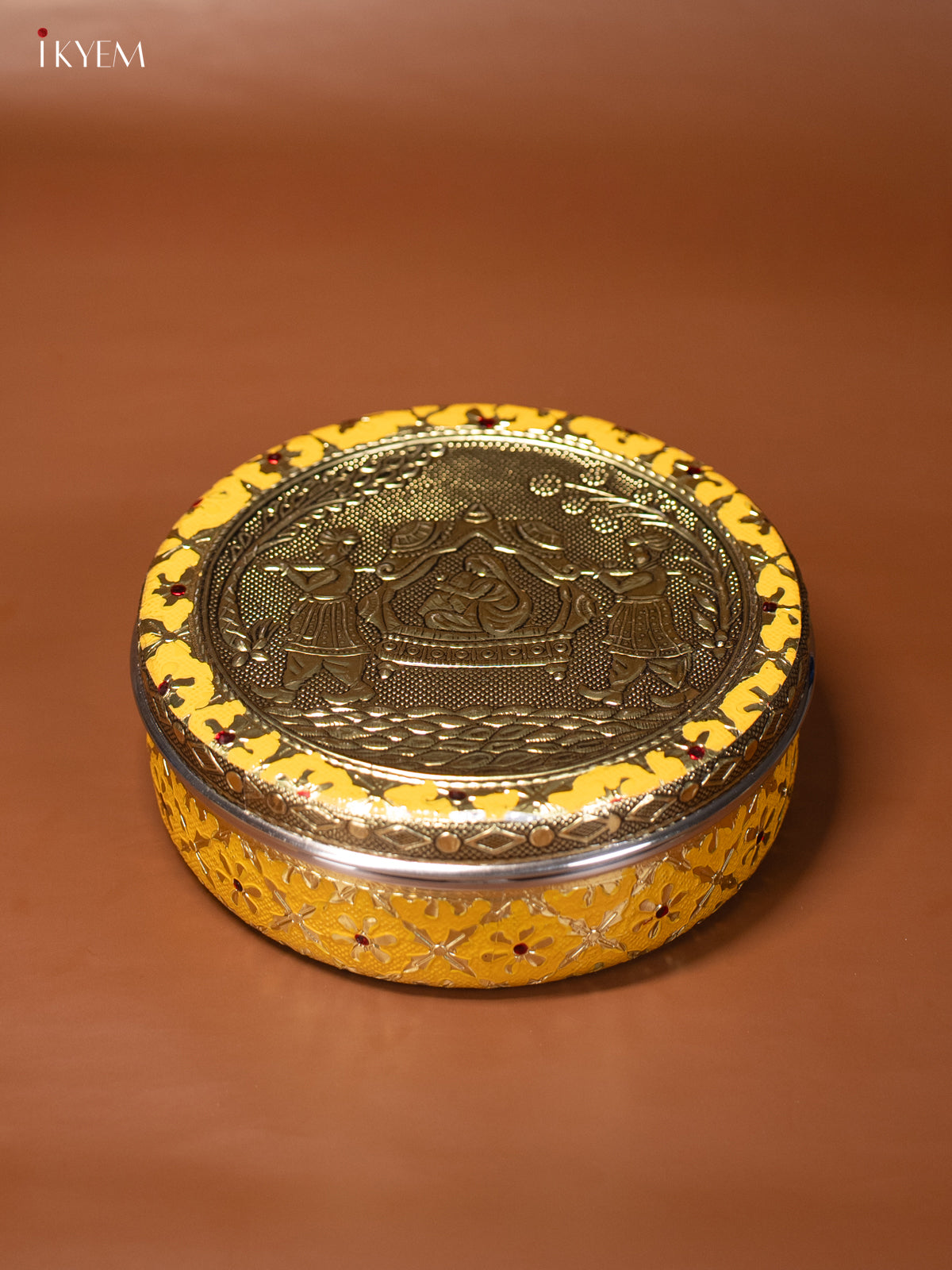 - This 7-inch yellow Meenakari box showcases an elegant oxidized Pallakku design, combining traditional craftsmanship with functional appeal.