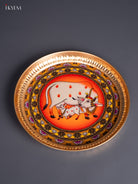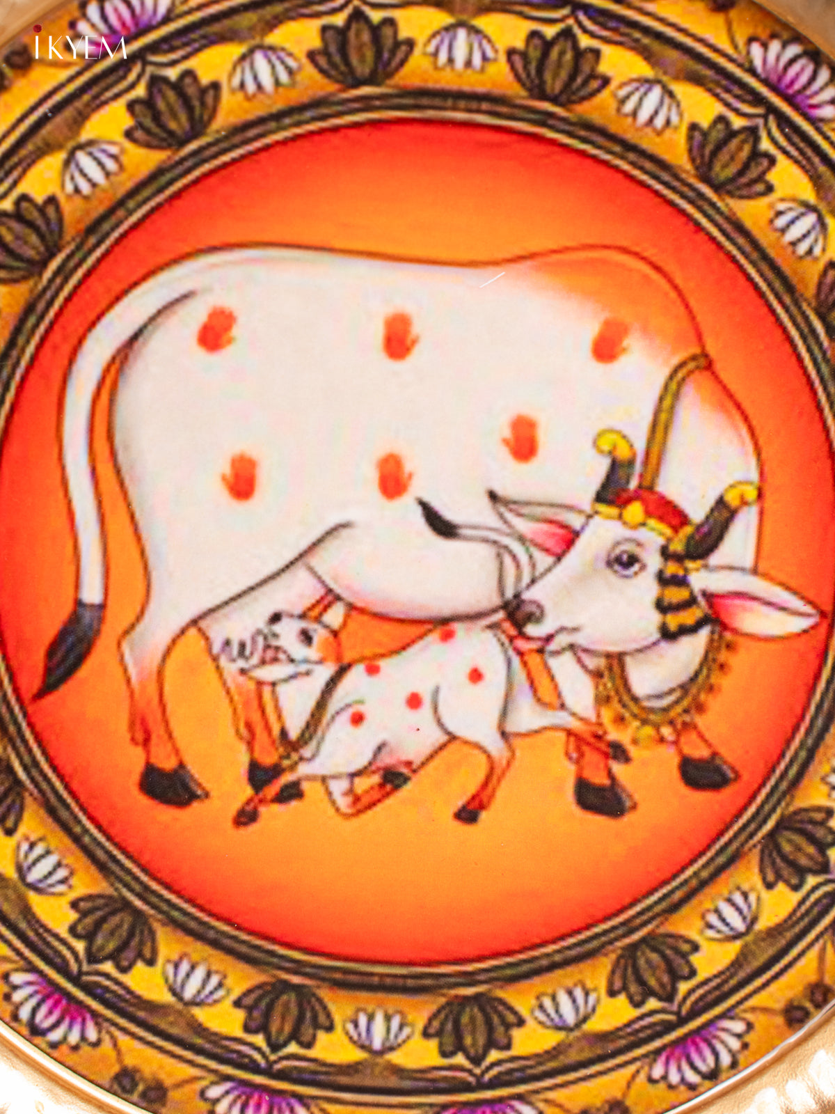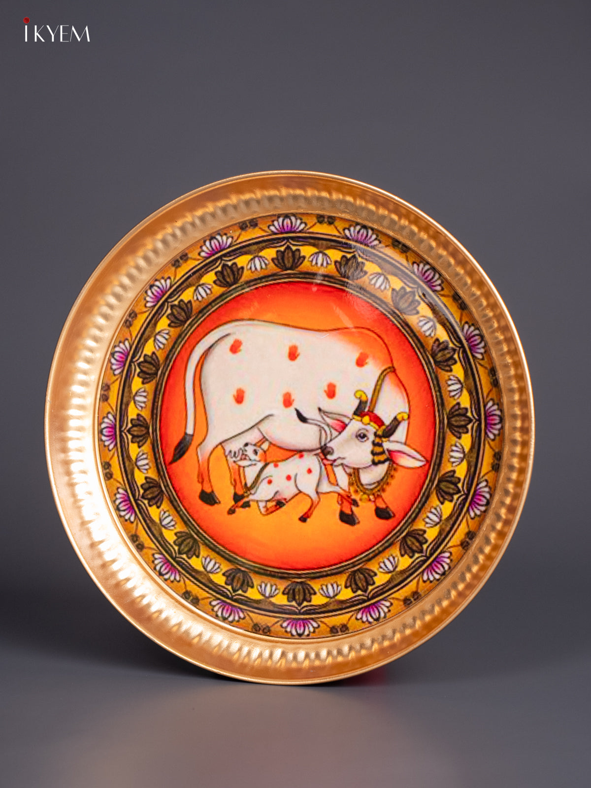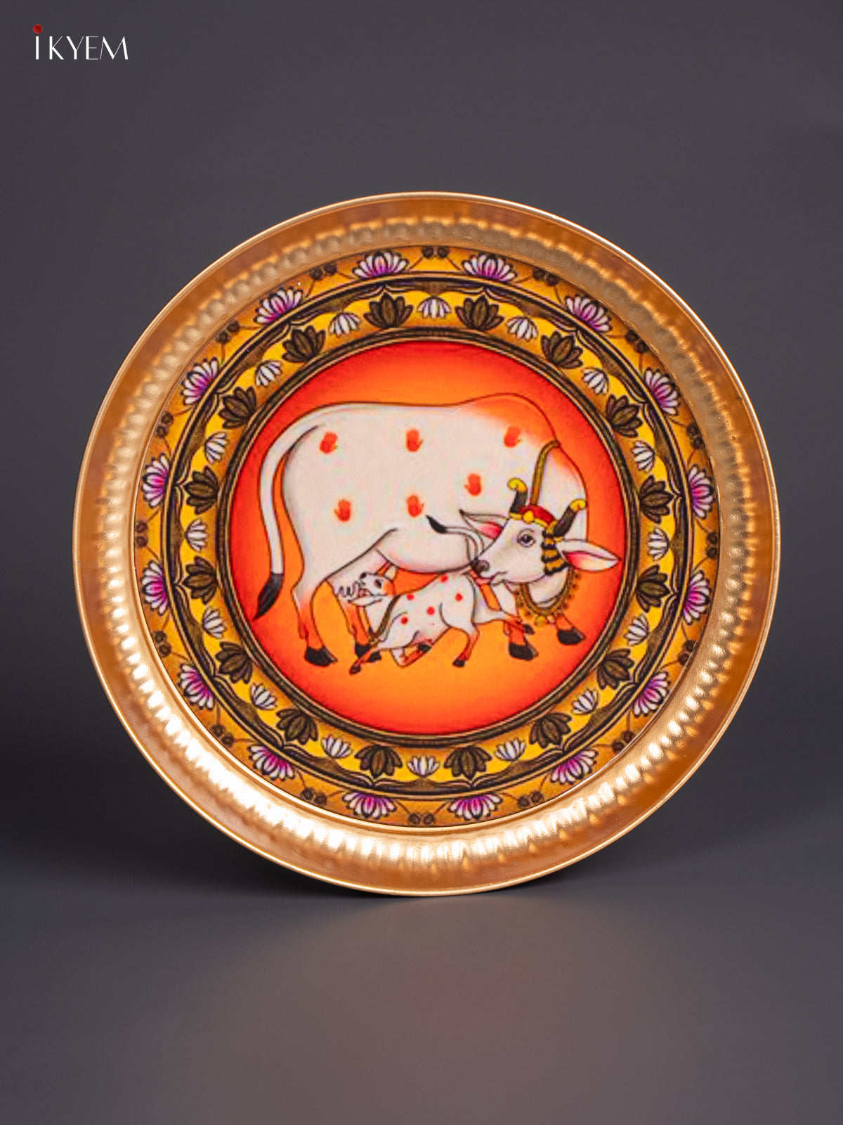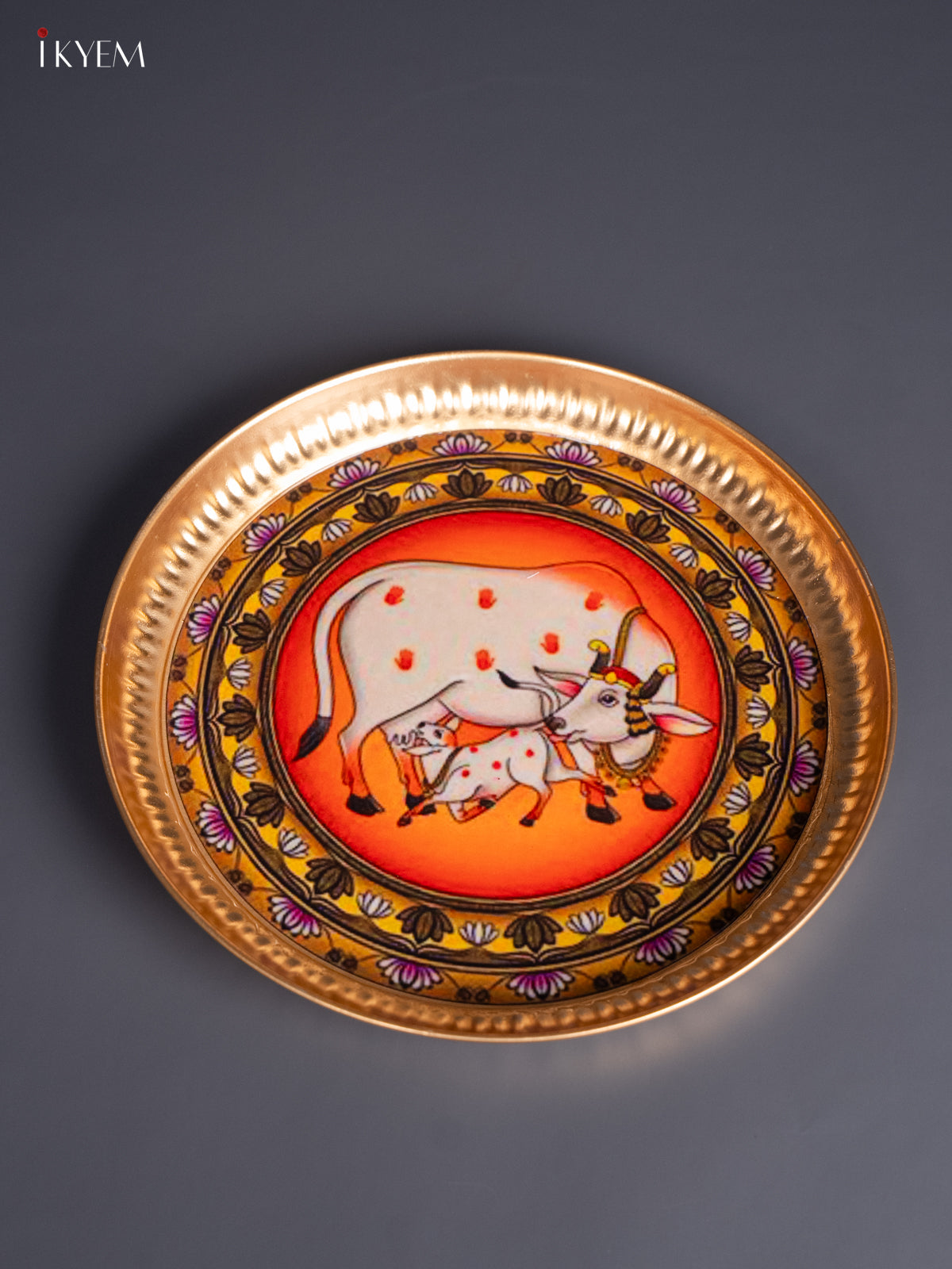 - Enhance your pooja space with this aesthetically printed metal plate featuring intricate pichwai designs in vibrant tones.