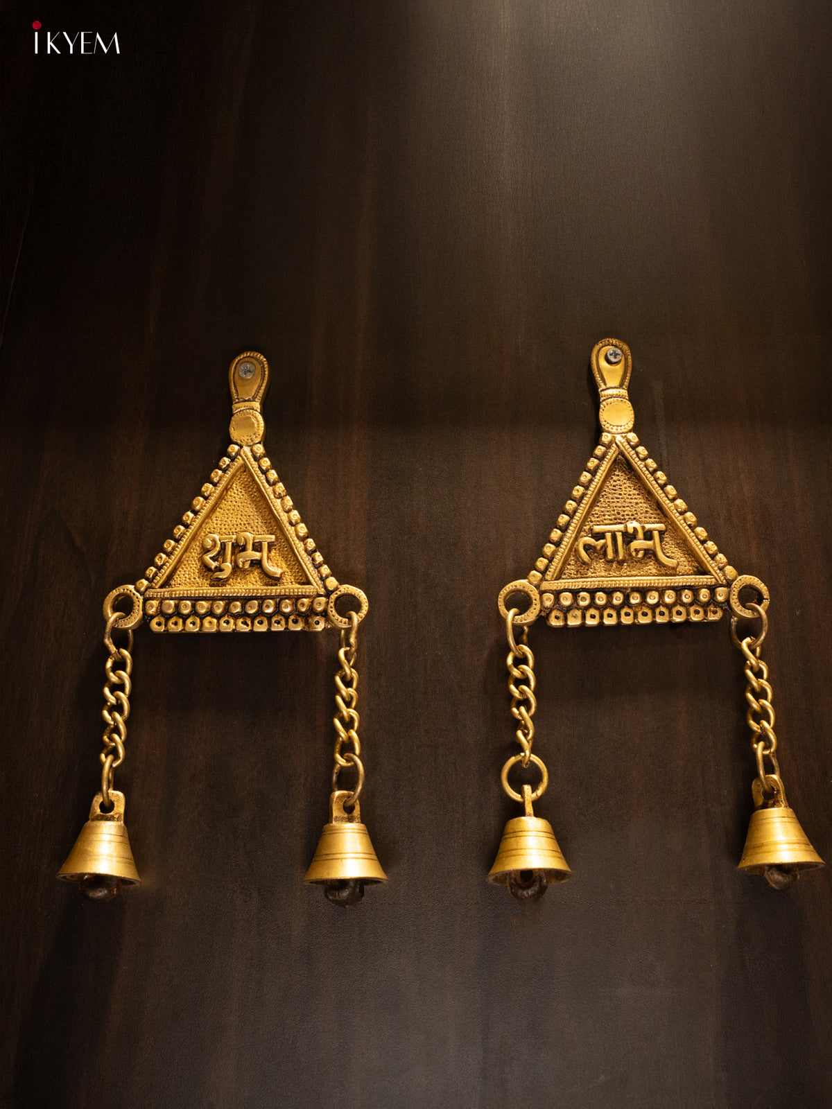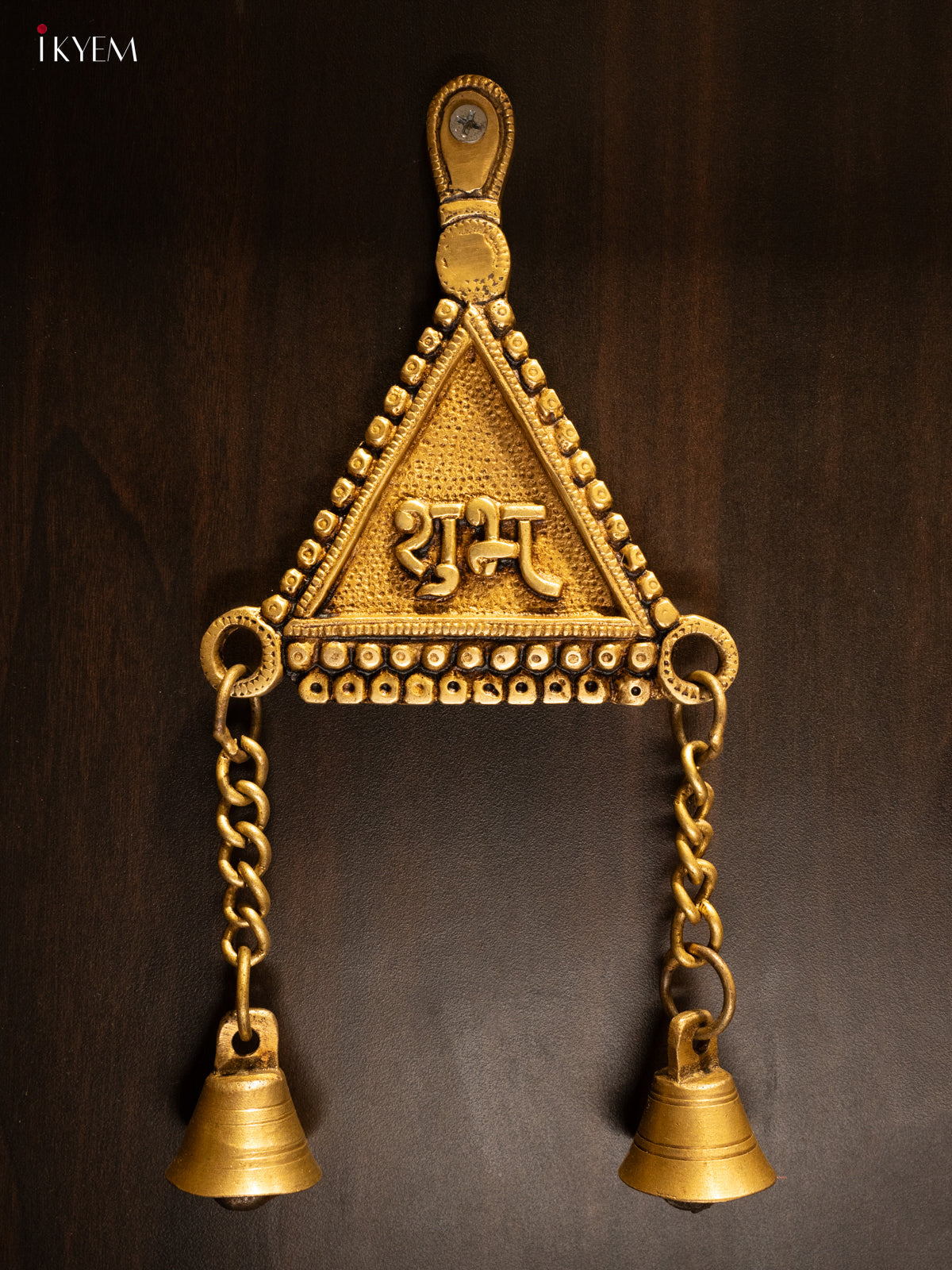 - This brass wall hanging features the auspicious symbols of "Shubh" and "Laabh" along with the soothing sound of bells.