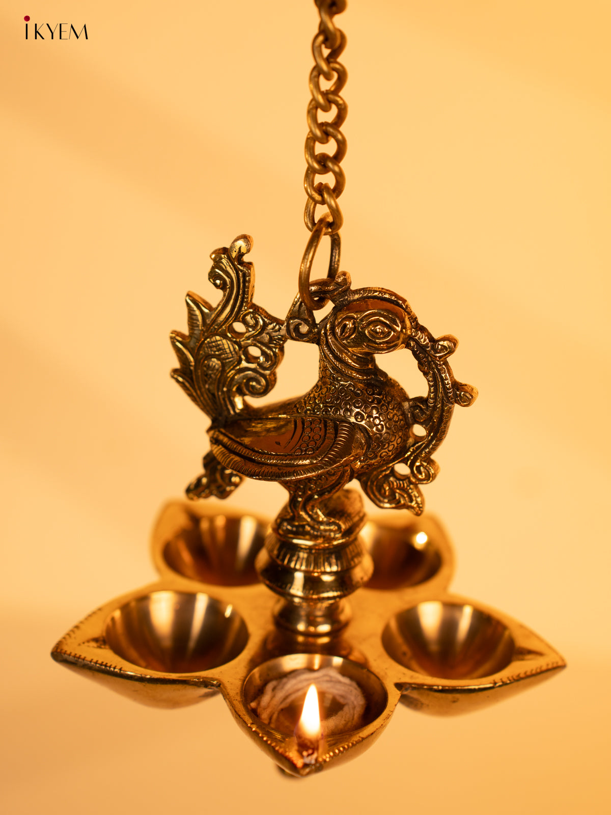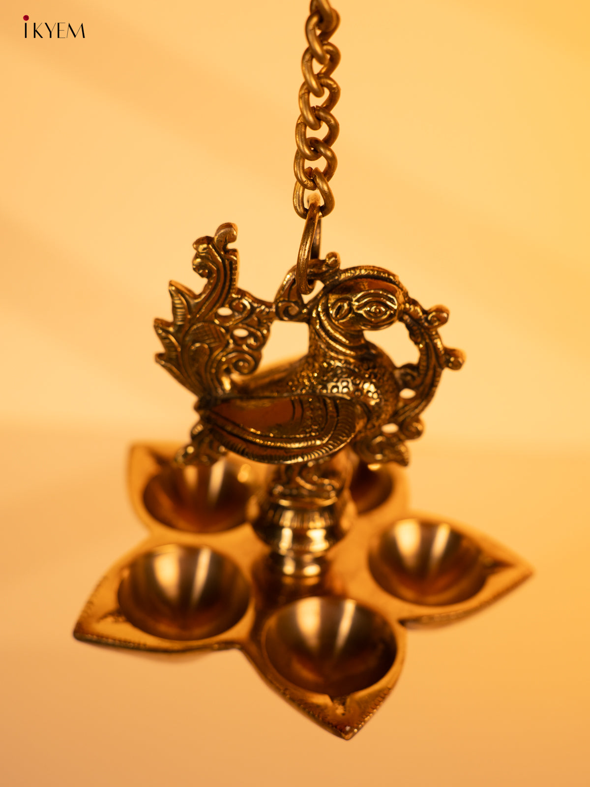 - Expertly crafted from brass, this 5-face Annapakshi hanging diya will add a touch of elegance to any space.