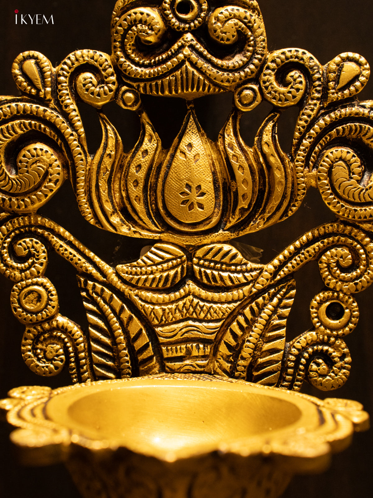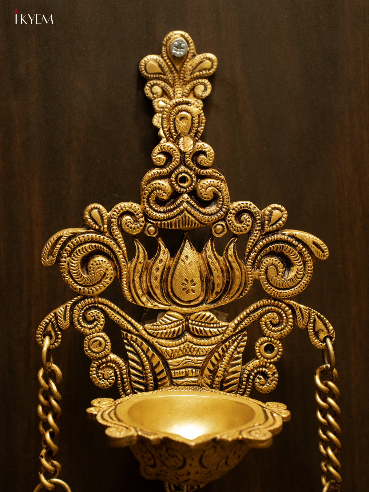 - Made of high-quality brass, this diya features a stunning lotus design and includes hanging bells for added charm.