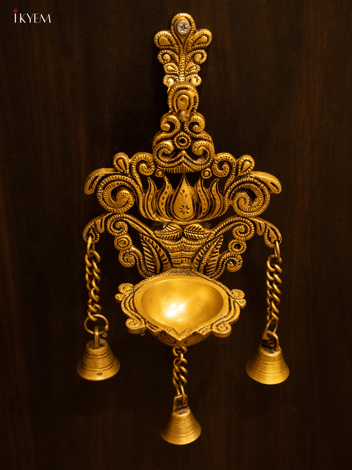 - Introducing the Brass Lotus Wall Hanging Diya with Hanging Bells - a beautiful and elegant addition to your home decor.