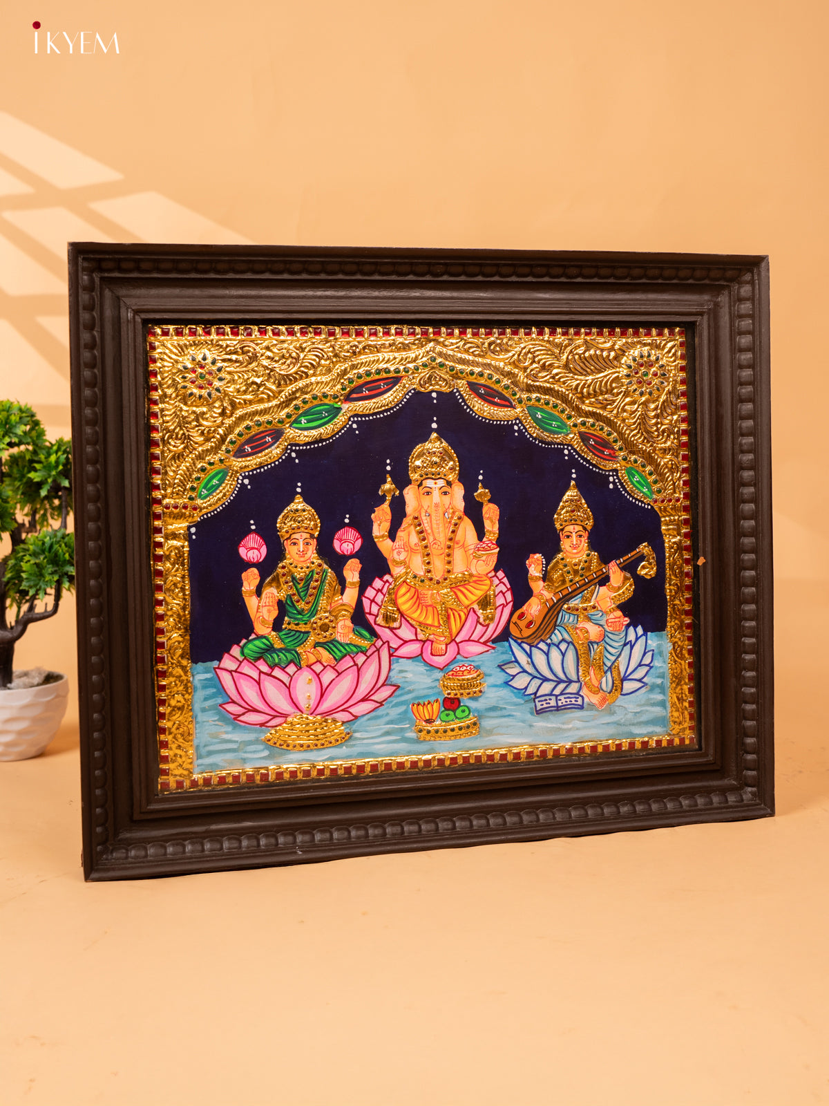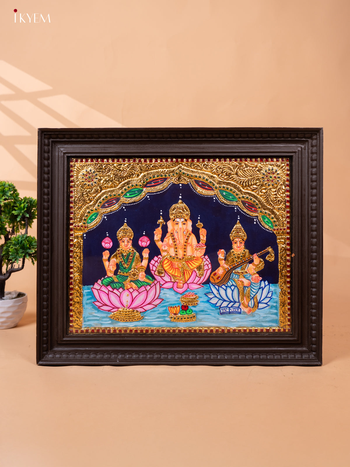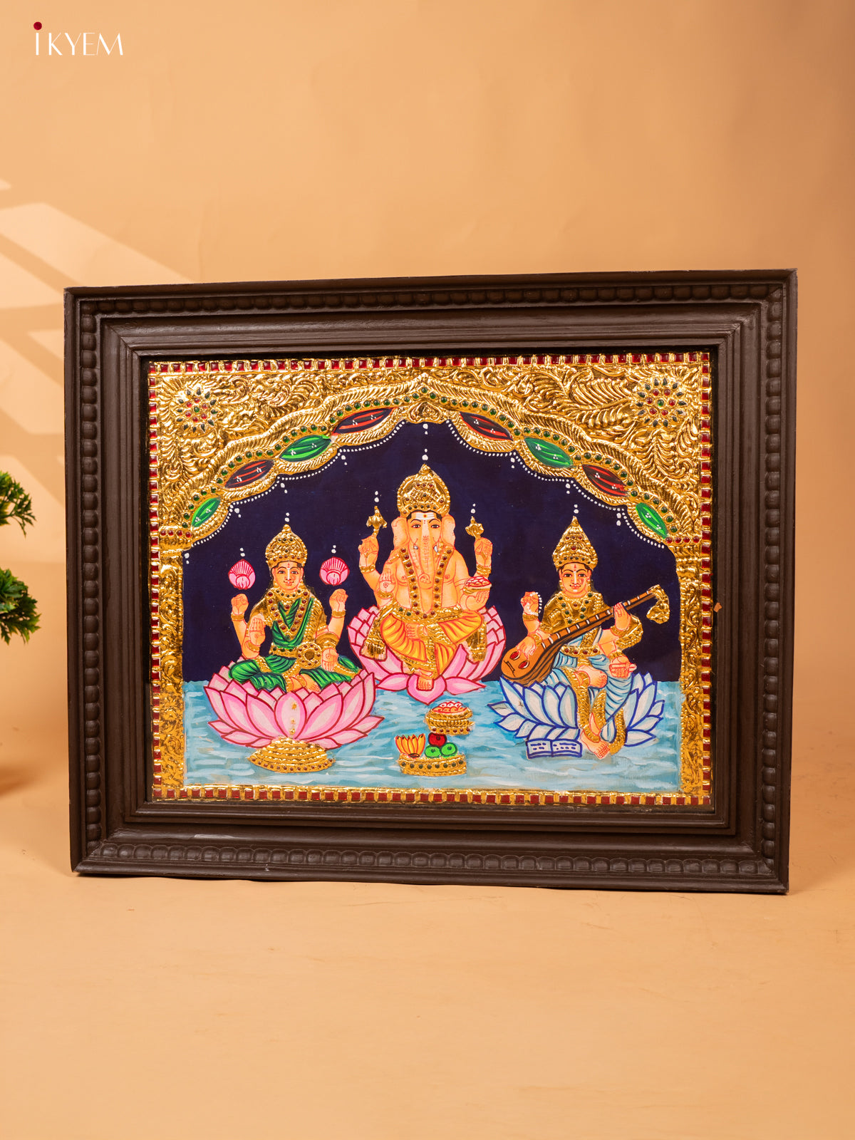 - This authentic Gajalakshmi Ganesha Saraswati-Tanjore Panting features a teak wood frame.
