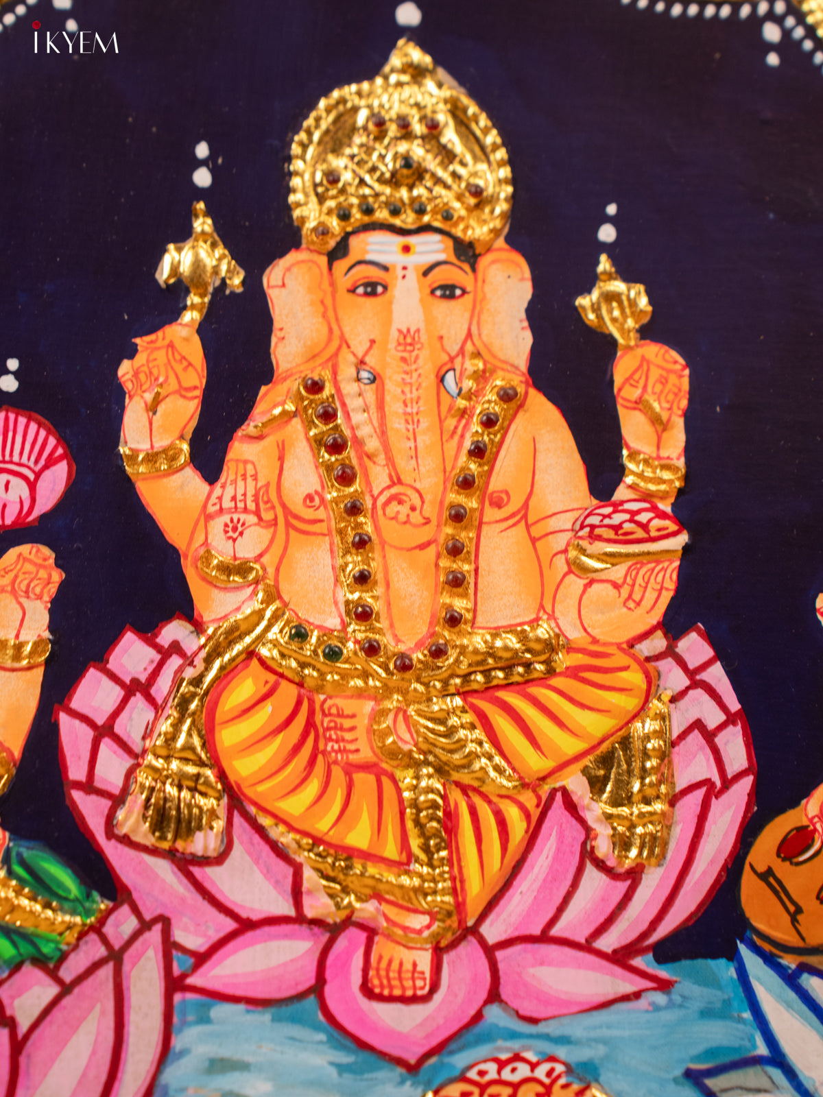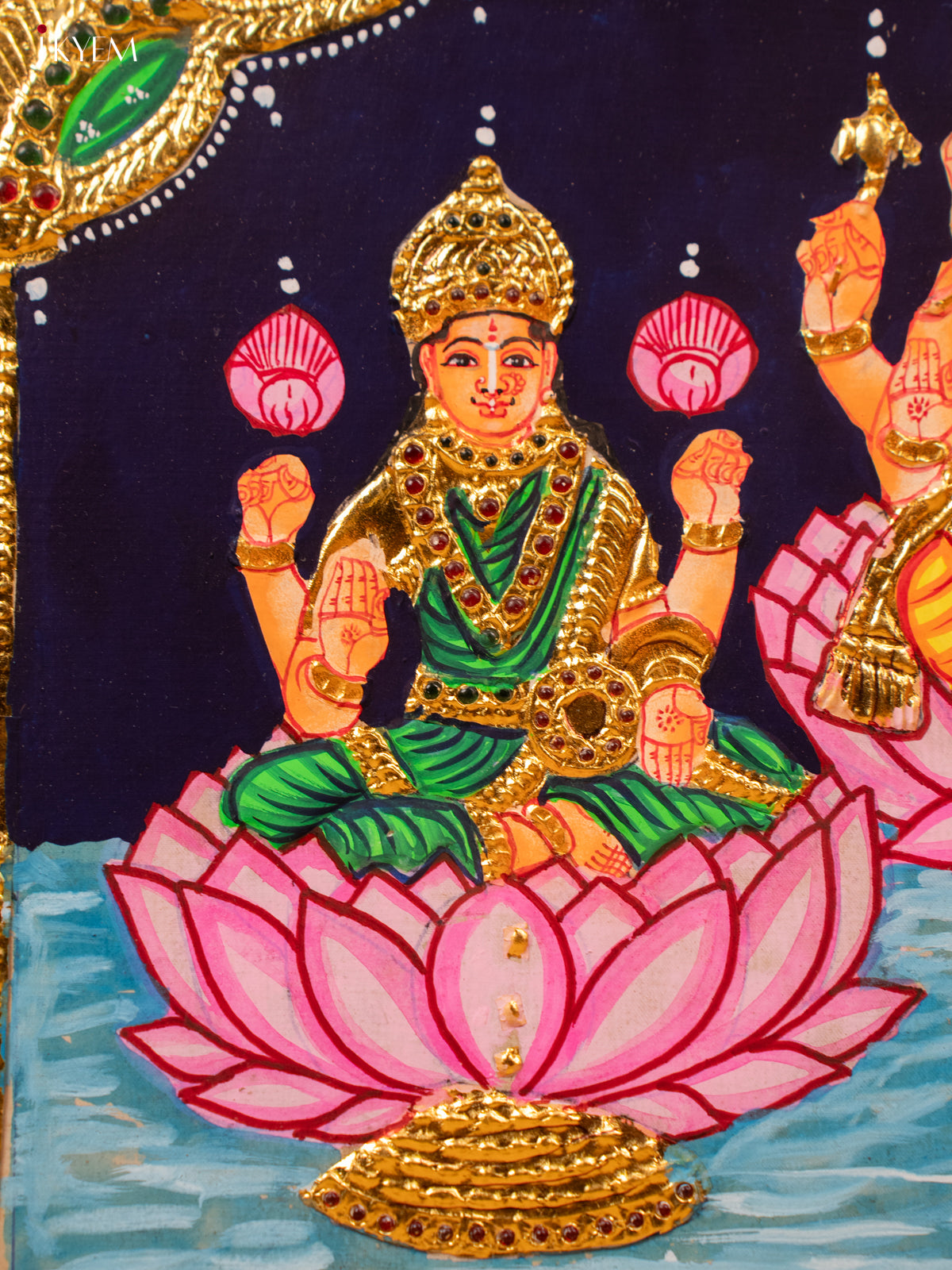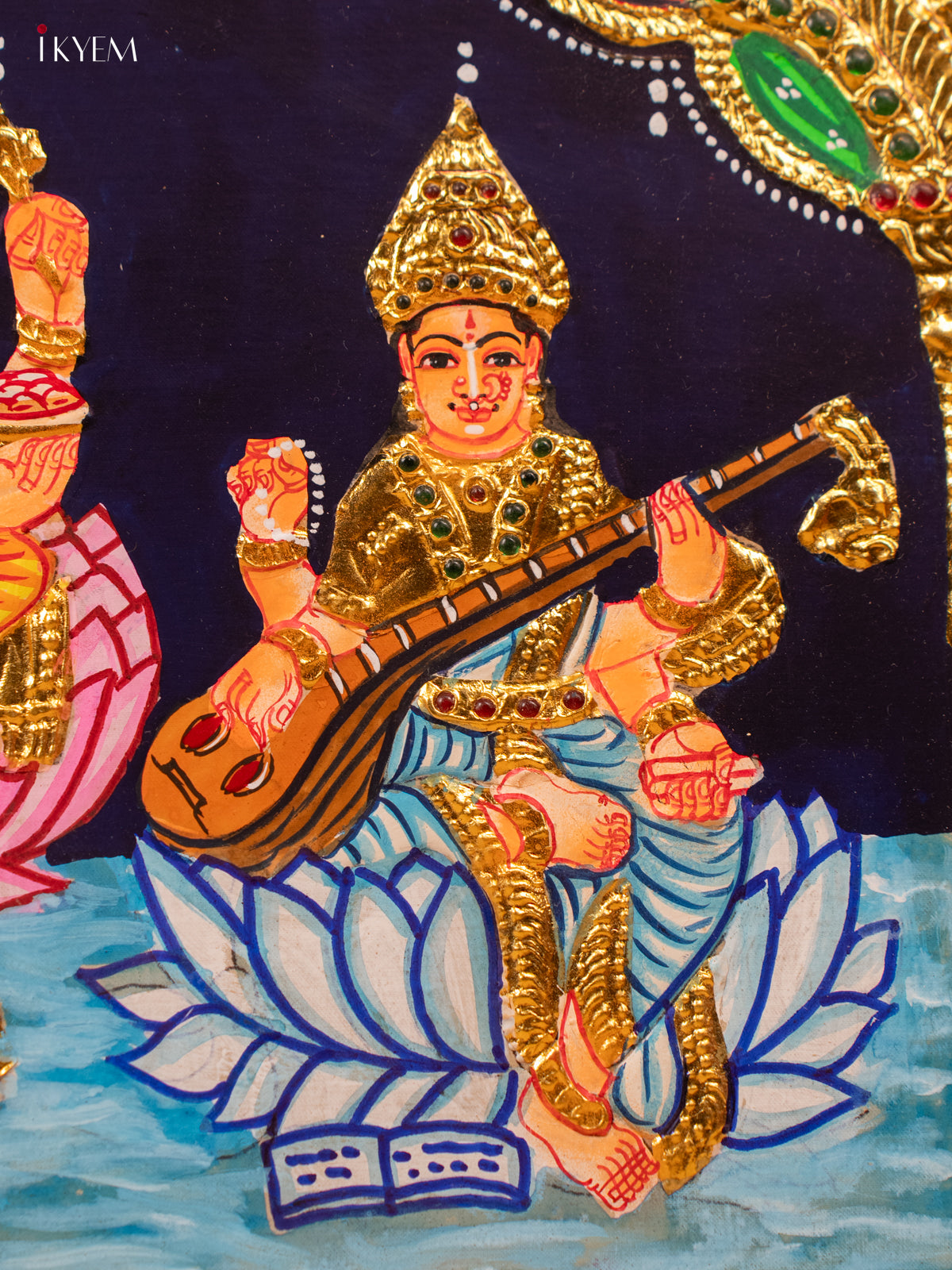 - This authentic Gajalakshmi Ganesha Saraswati-Tanjore Panting features a teak wood frame.