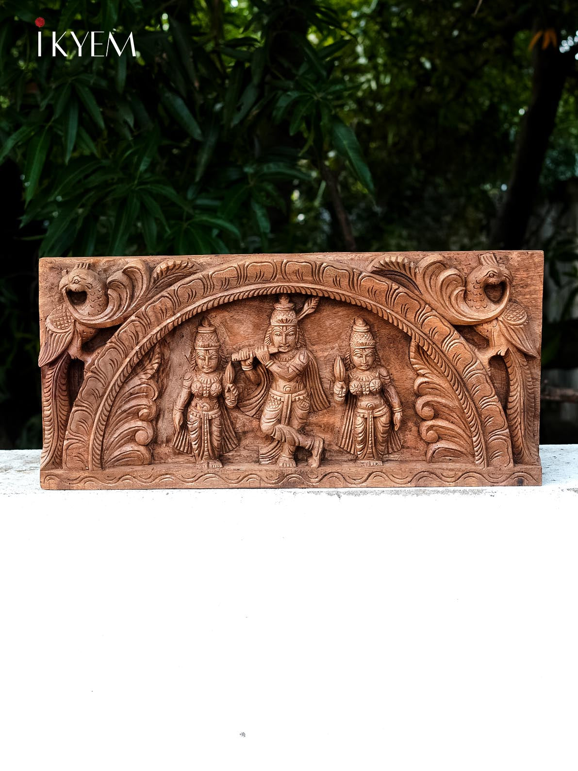 Hand carved Wooden Wall Panel of Krishna with Bhama & Rukmani - 4GJ09022