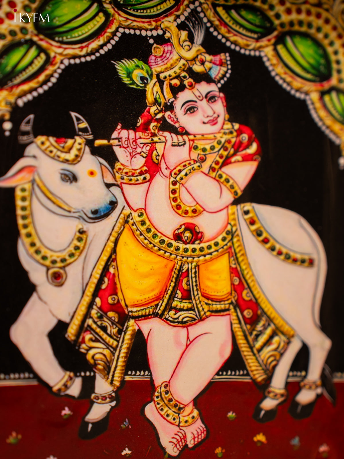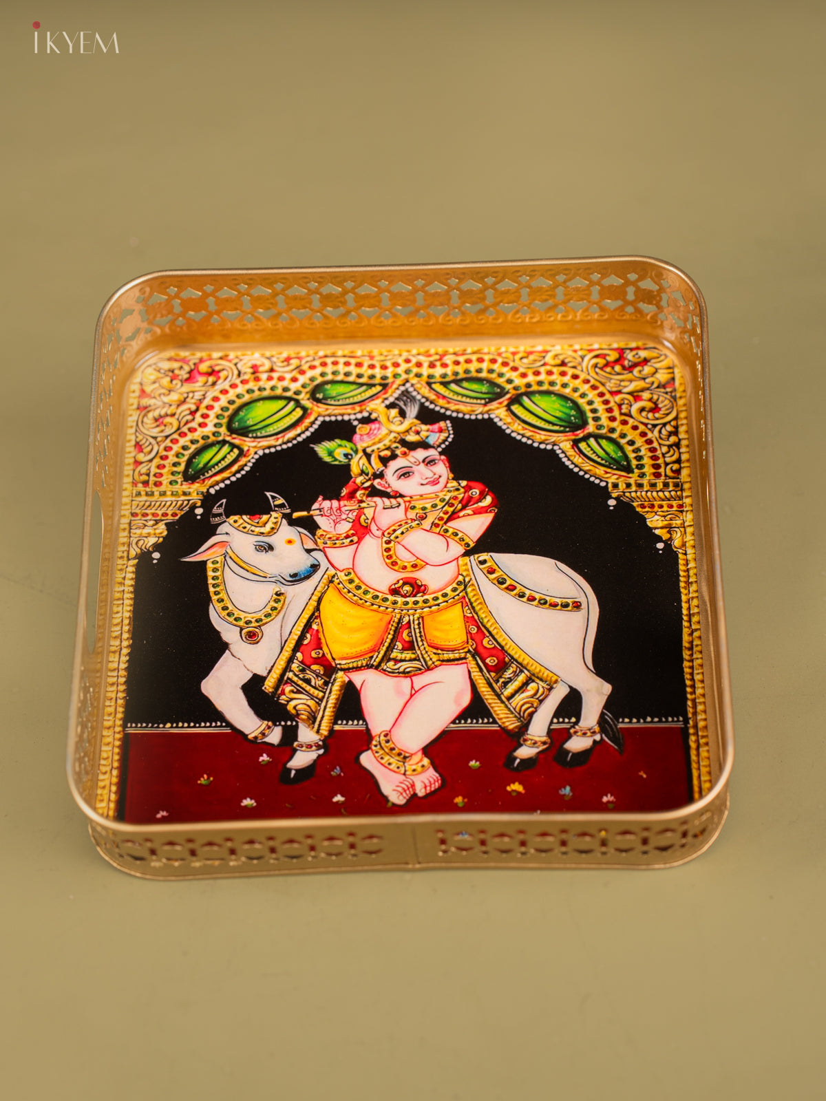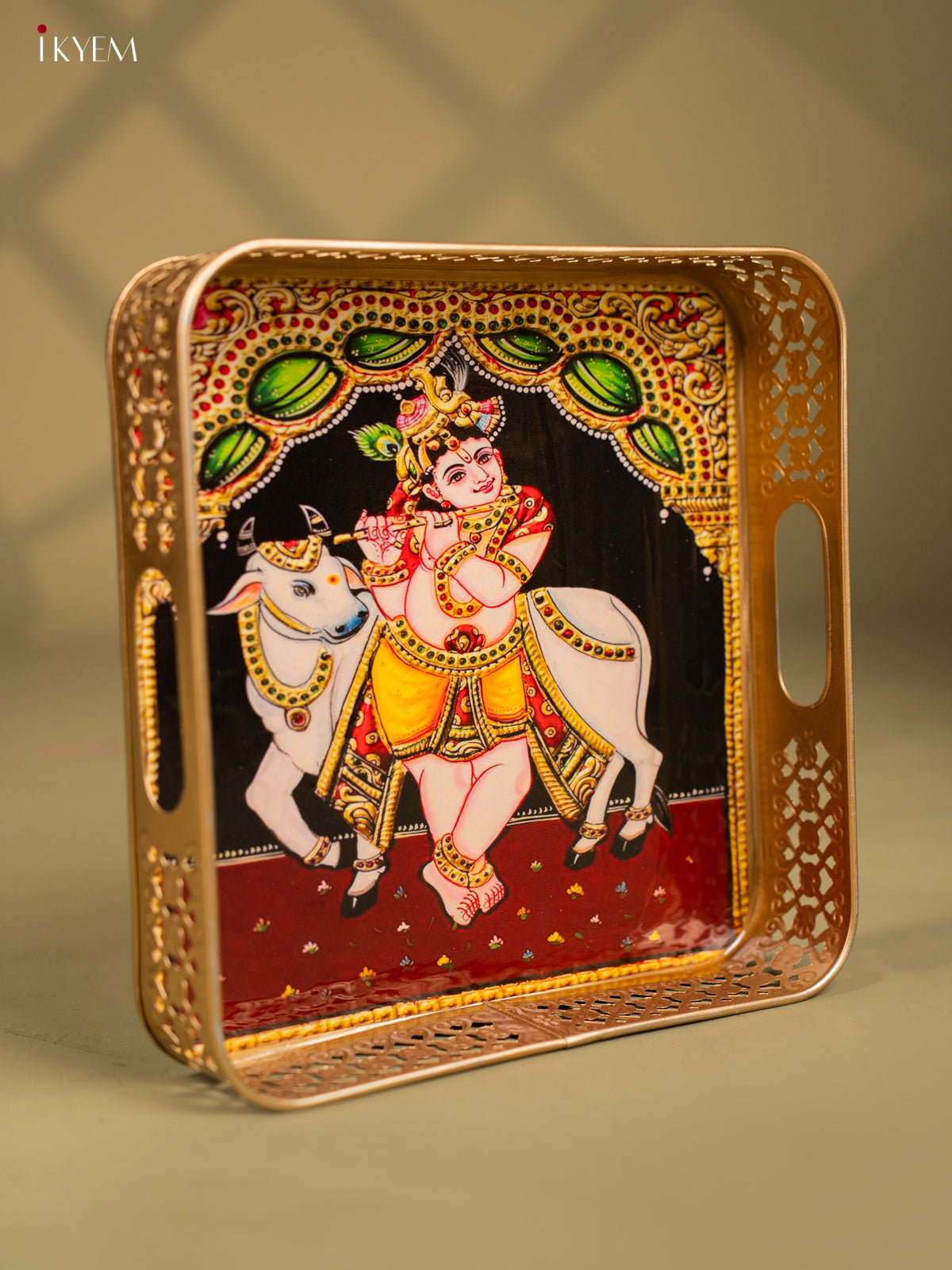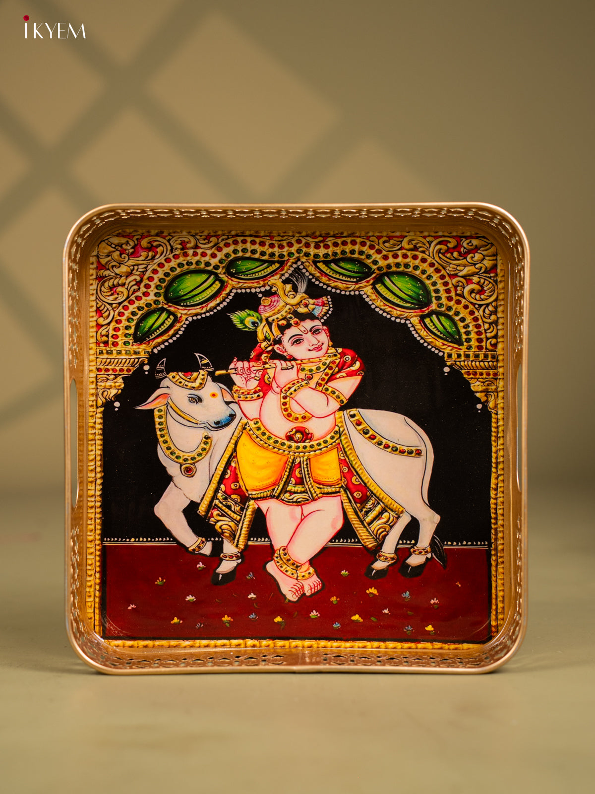 - This 10-inch square metal tray adorned with a vibrant and detailed print of Lord Krishna playing his flute alongside a sacred cow, symbolizing divine love, prosperity, and protection.
