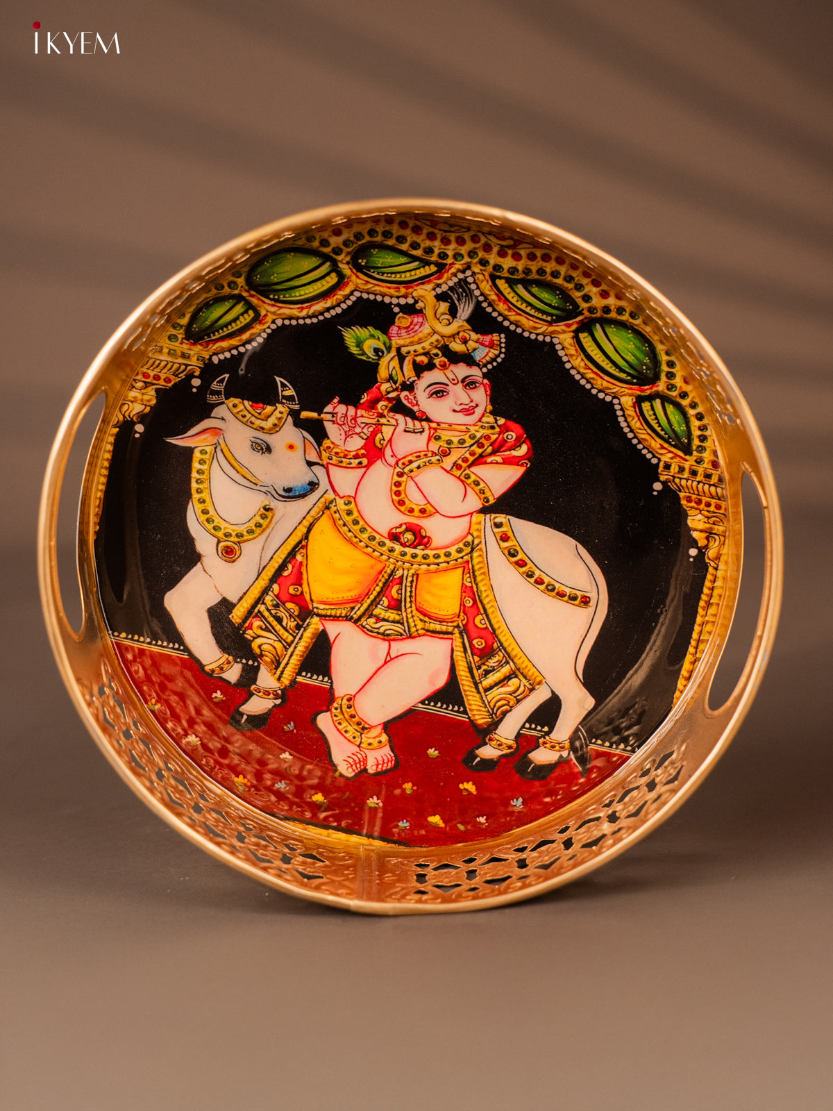 - This 8-inch metal tray features a high-quality digital print of Lord Krishna Playing Flute with a cow, making it a perfect choice for pooja ceremonies, decorative purposes, or as elegant return gifts.
