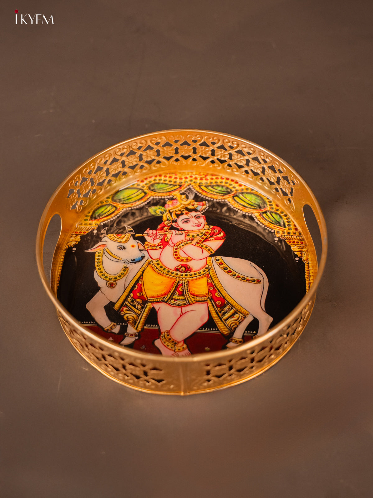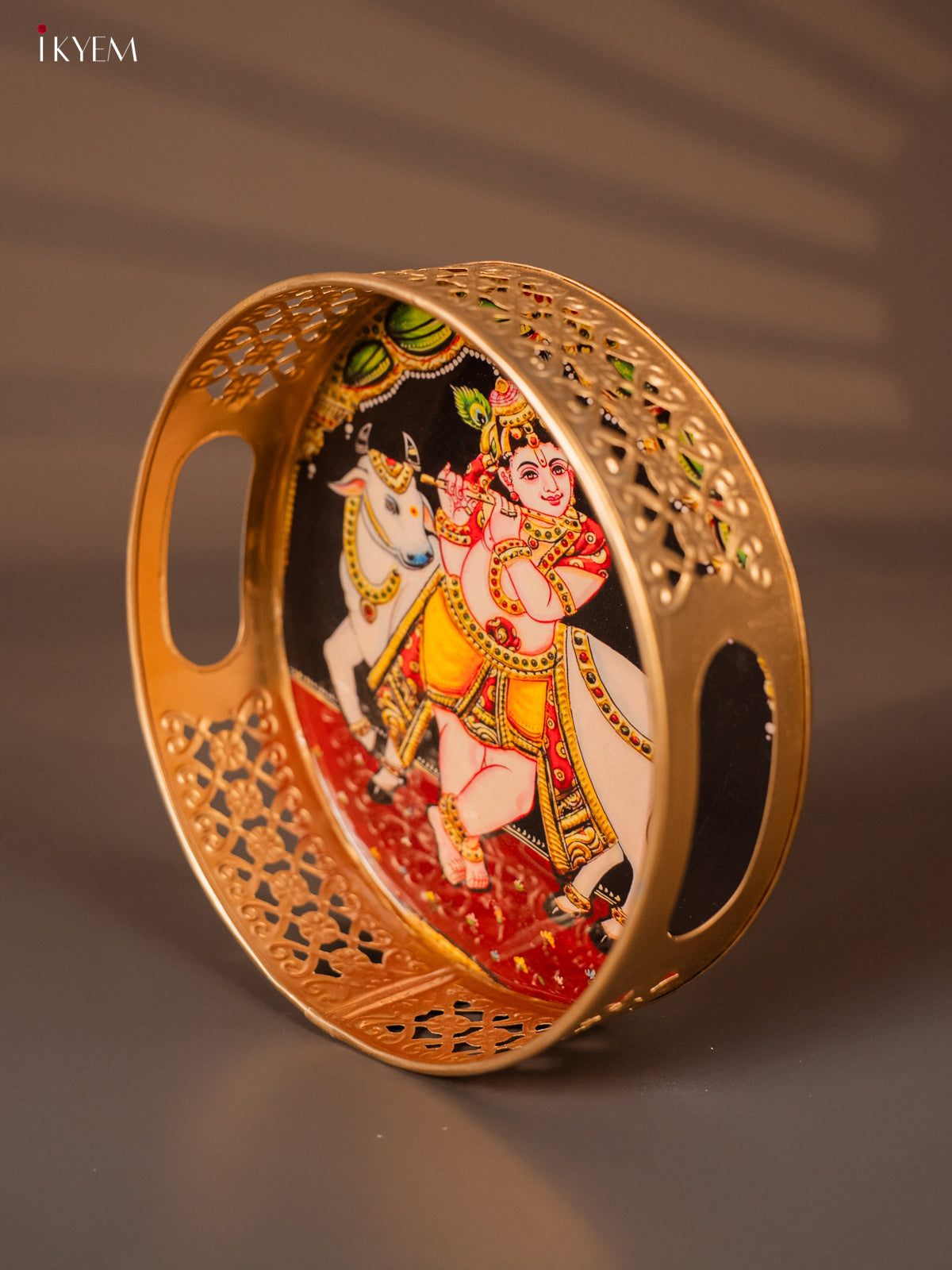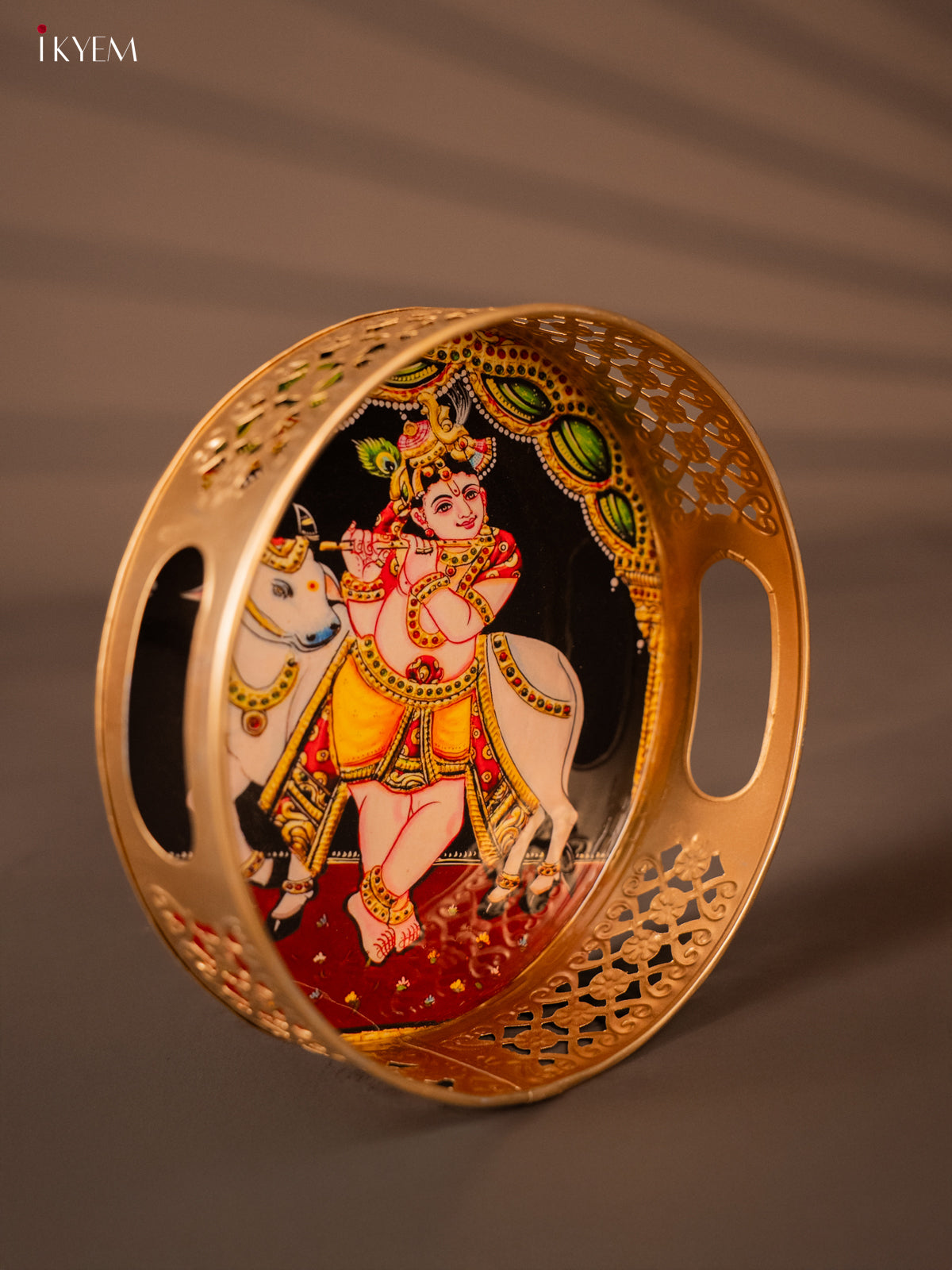 Beautiful God Krishna Playing Flute With Cow Printed Metal Tray - KH05126