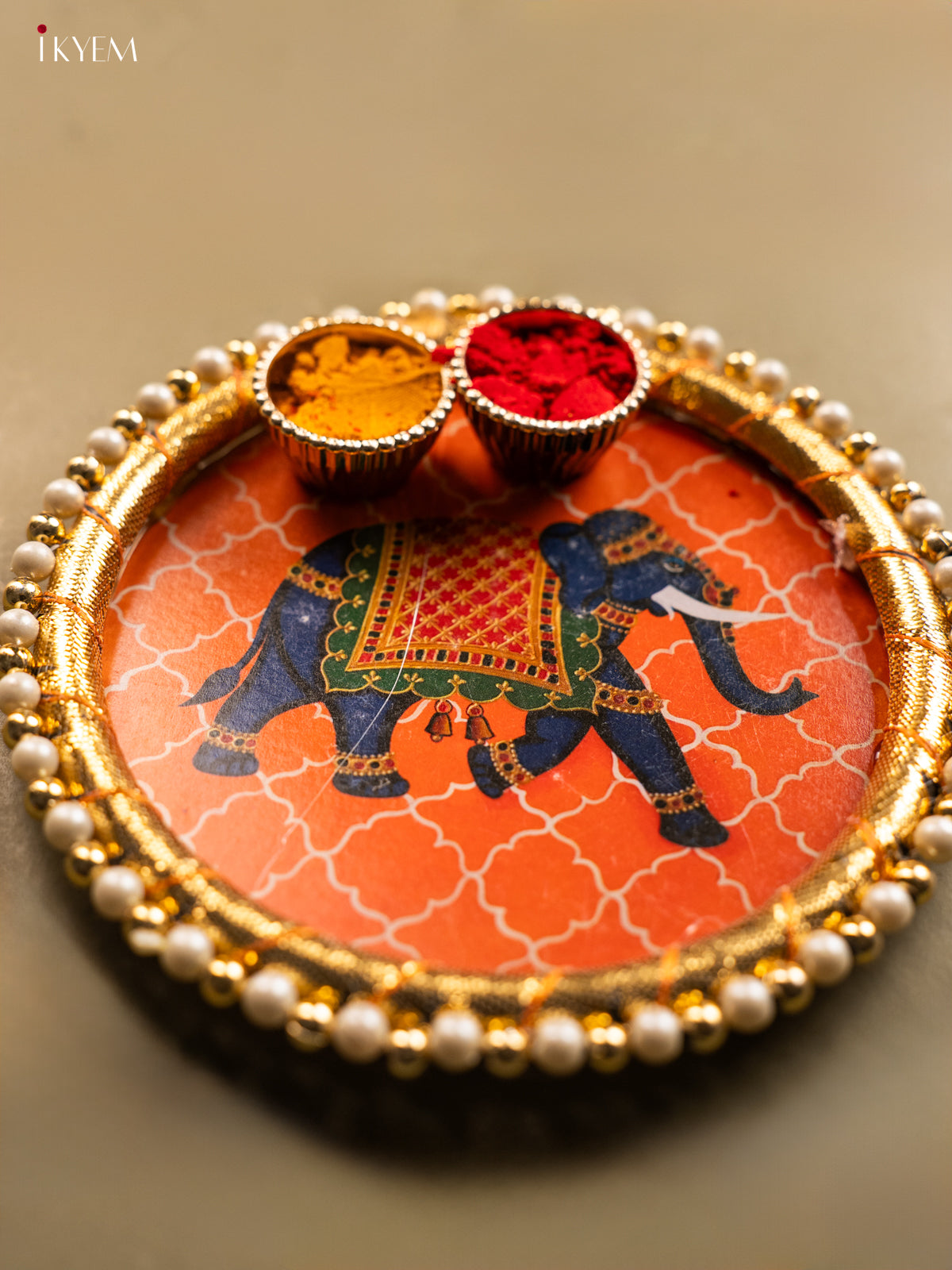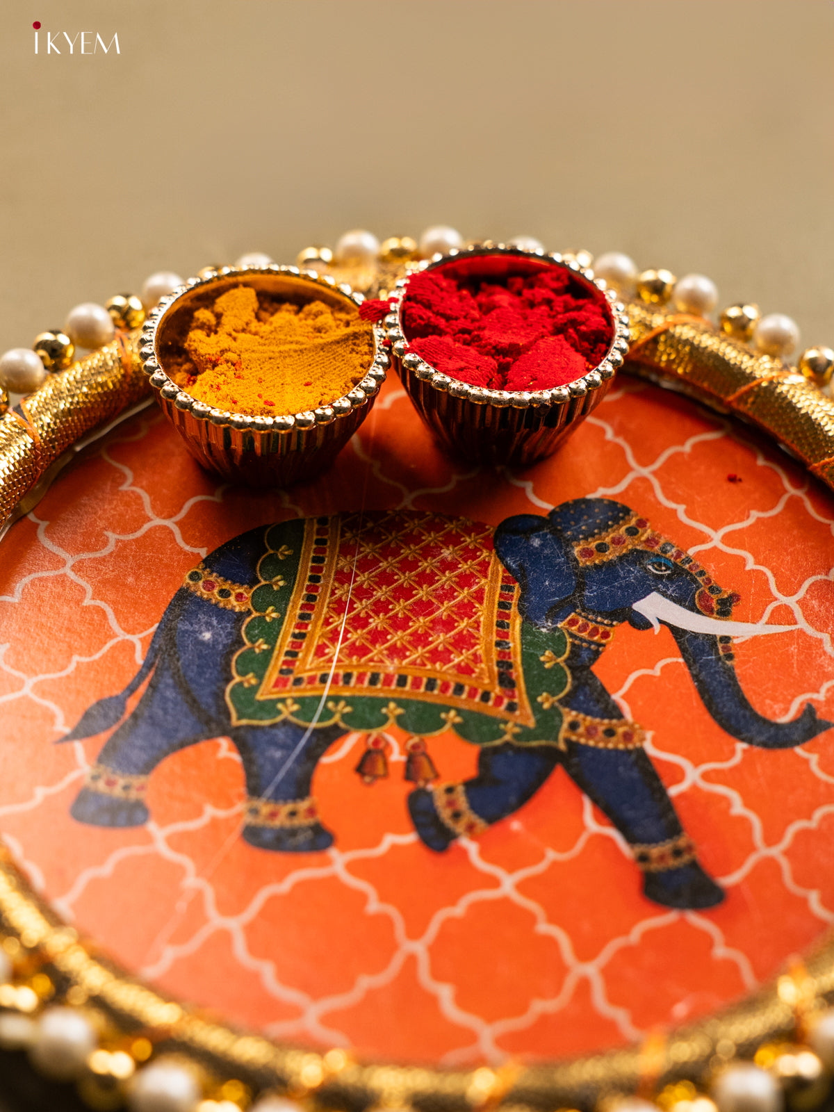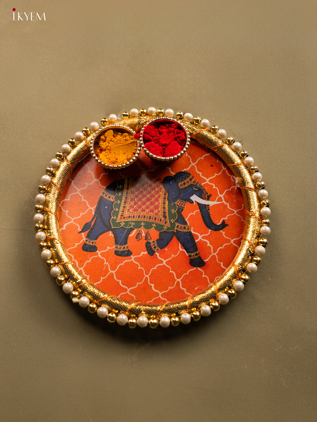 - This beautifully crafted plate with haldi kumkum holder features a graceful elephant motif enhanced with bright orange detailing. Thoughtfully designed to hold ceremonial powders, it is both functional and symbolic.
