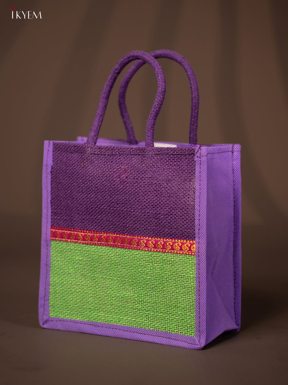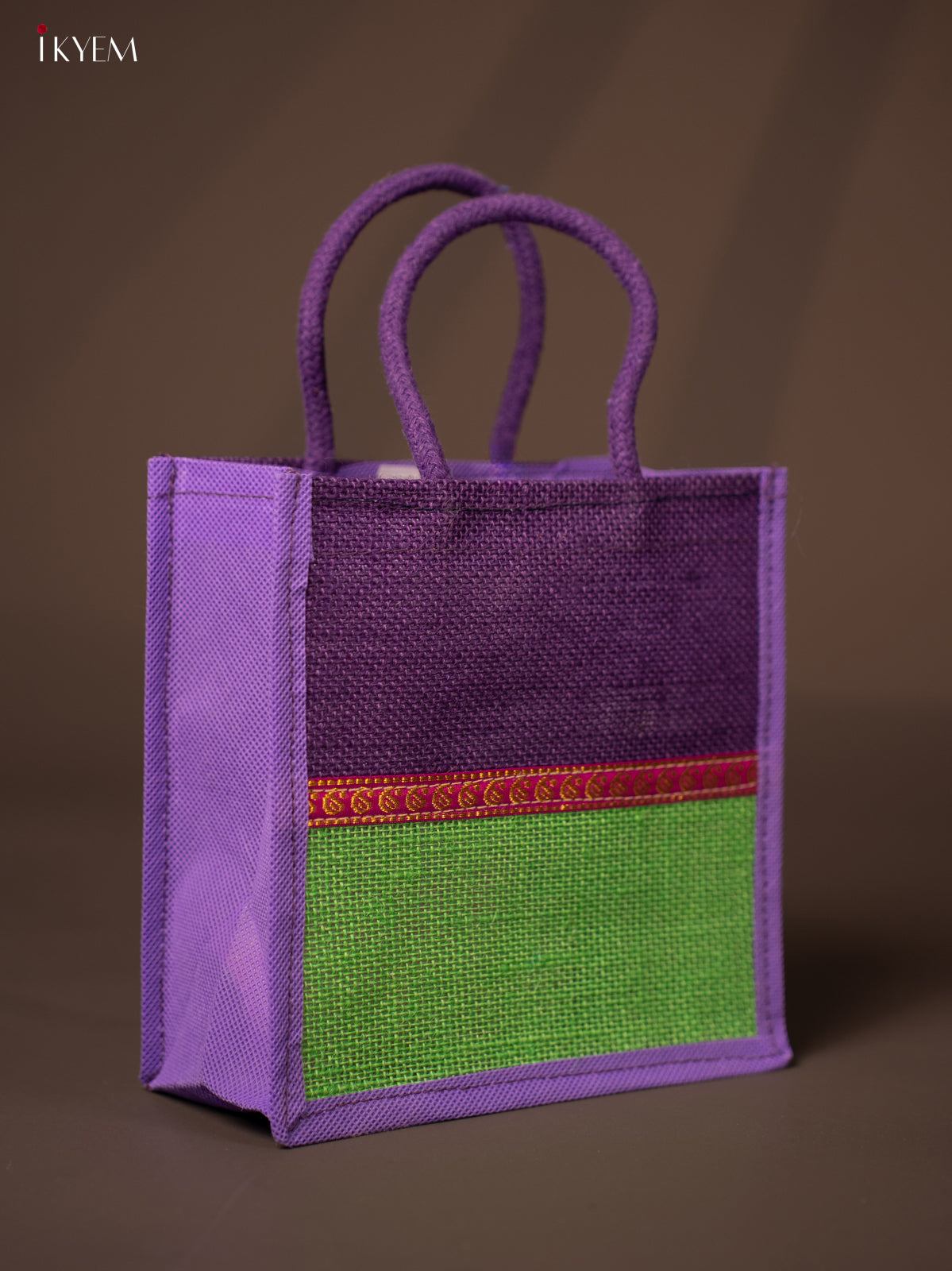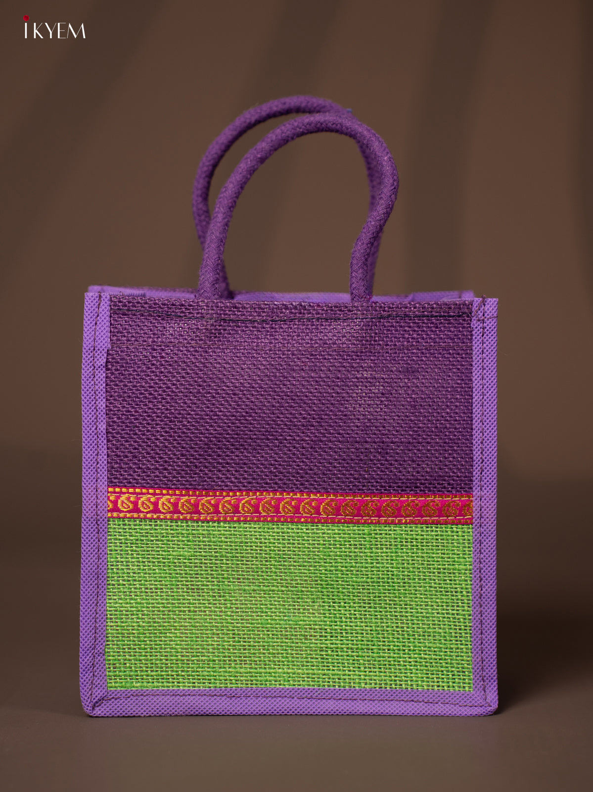 - This purple jute bag features a green 8-inch Velcro closure, sturdy rope handles, and an elegant zari strip.