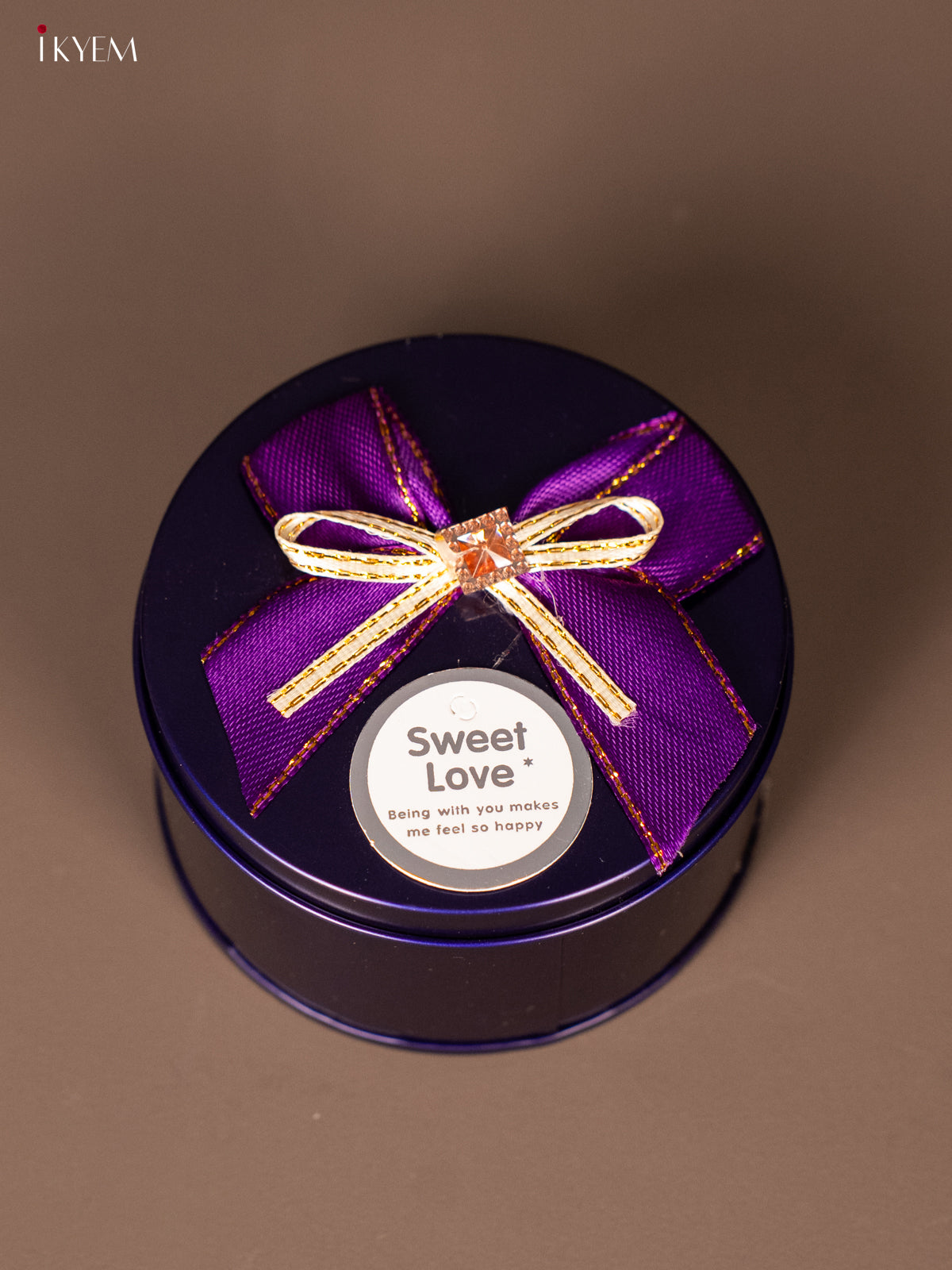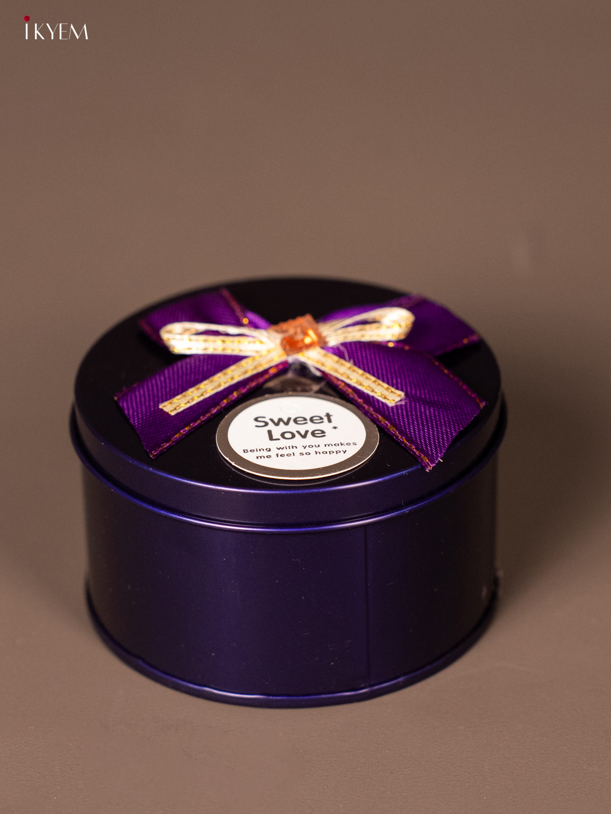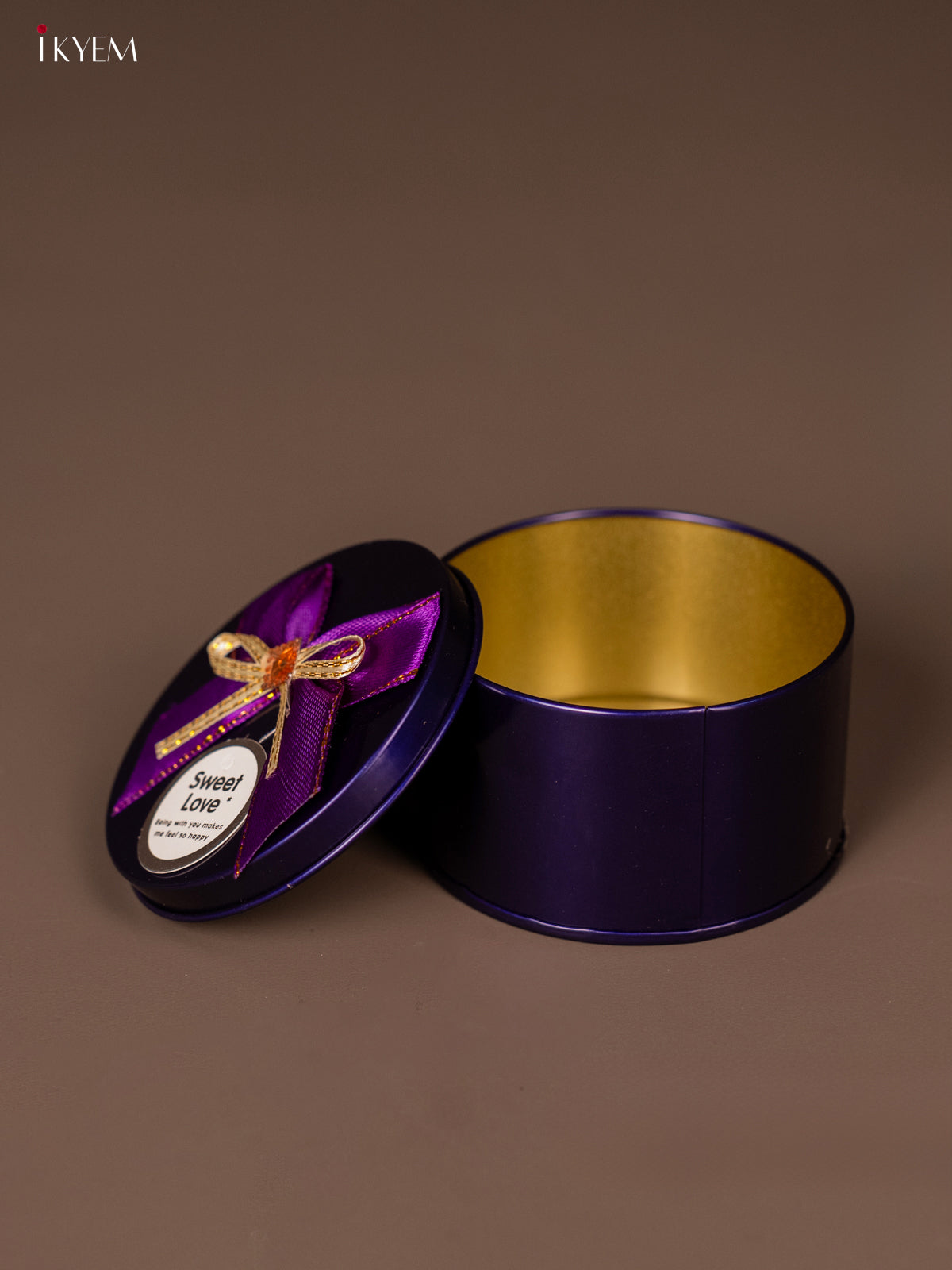 - Add charm and elegance to your celebrations with this Round, Purple Decorative Tin Box. Designed for both utility and beauty, it is the perfect blend of style and practicality.