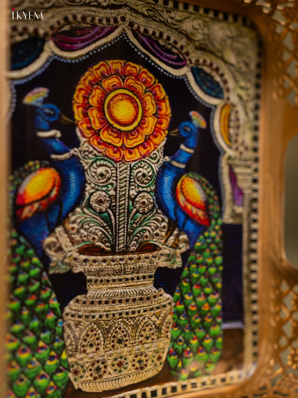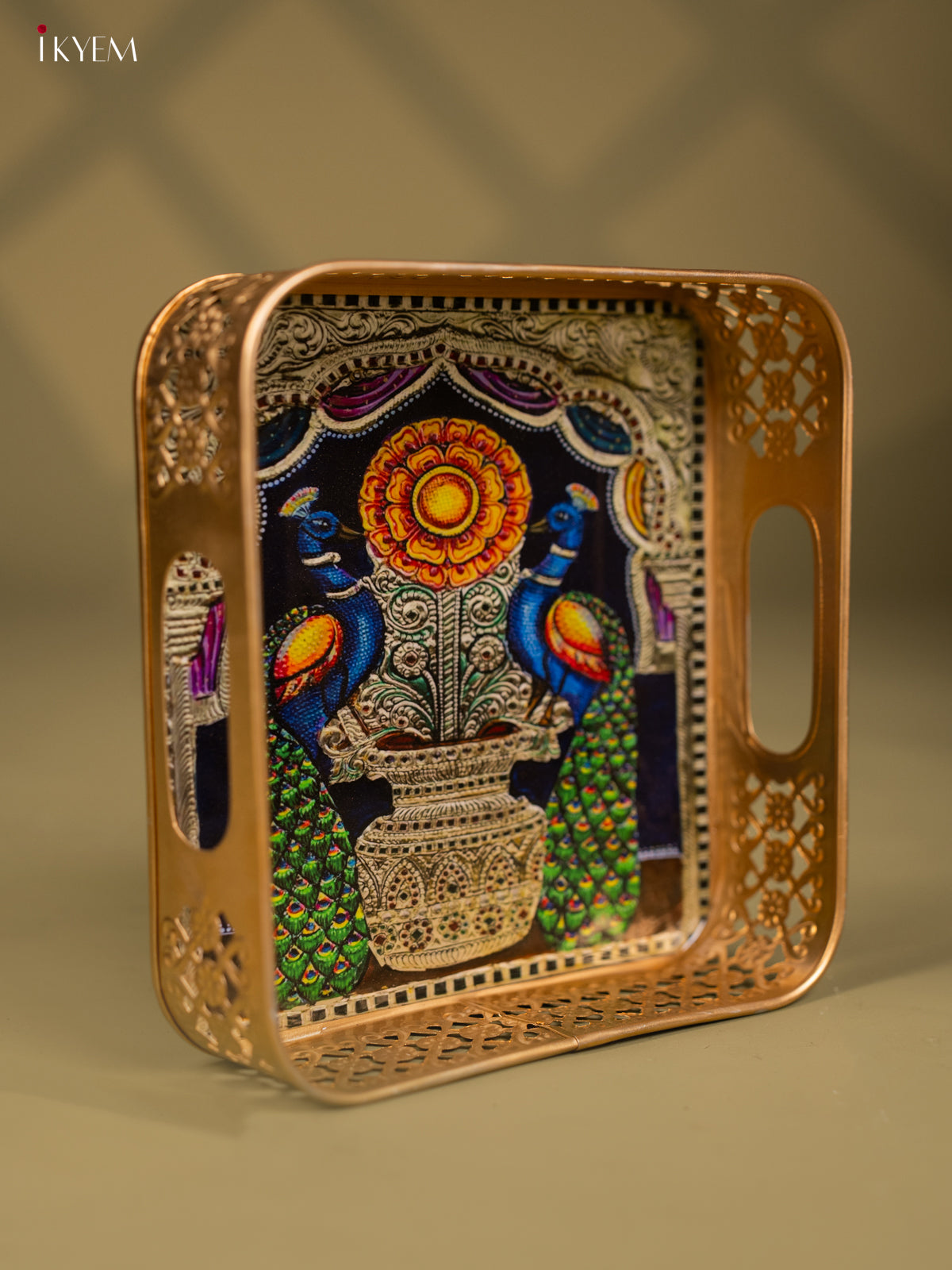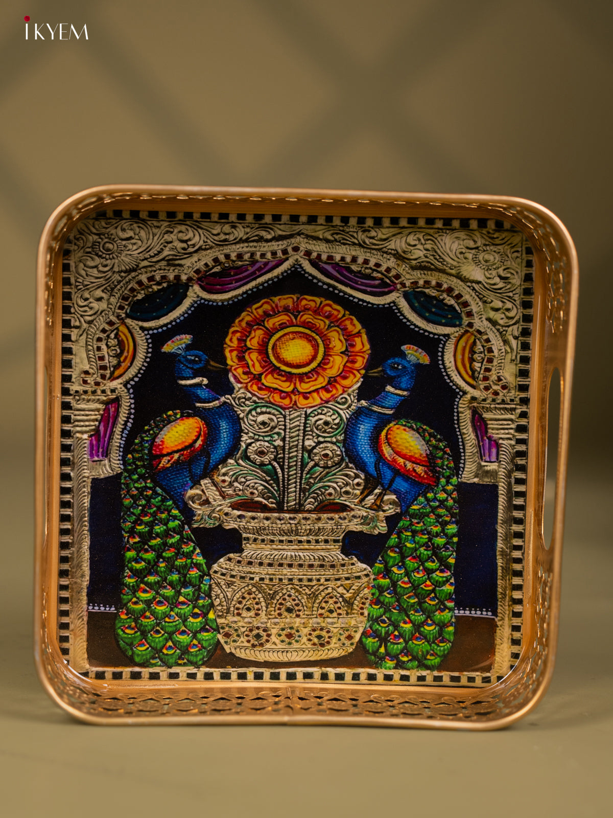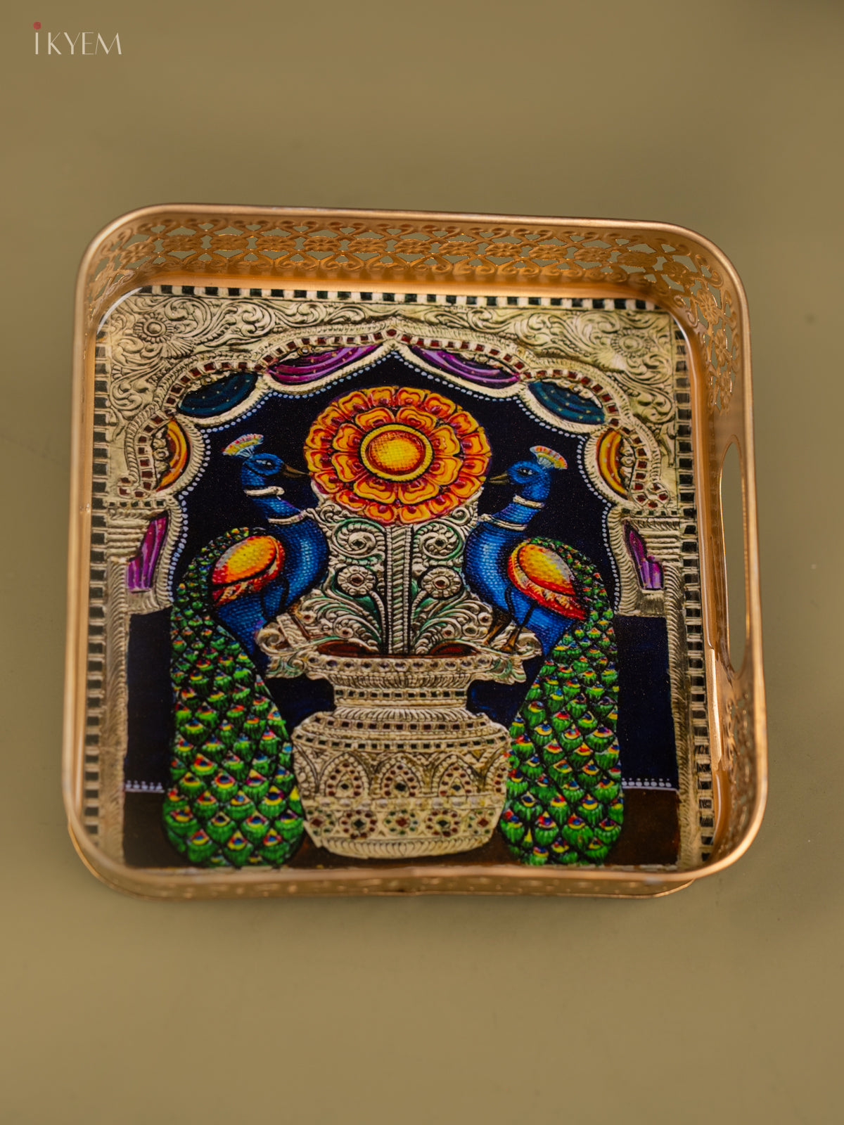 - This 8-inch square metal tray features a traditional Peacock design, perfect for pooja ceremonies and religious offerings.