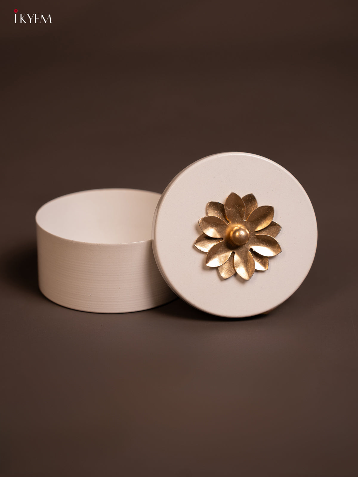 - Handcrafted White kitchen containers with elegant brass top designed for storing dry fruits and nuts.