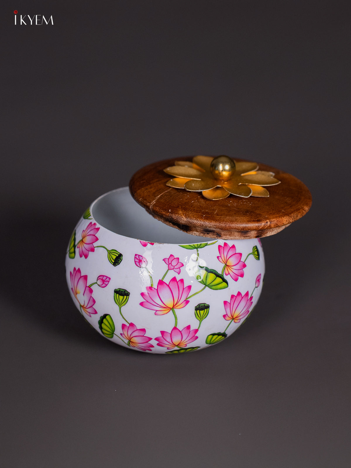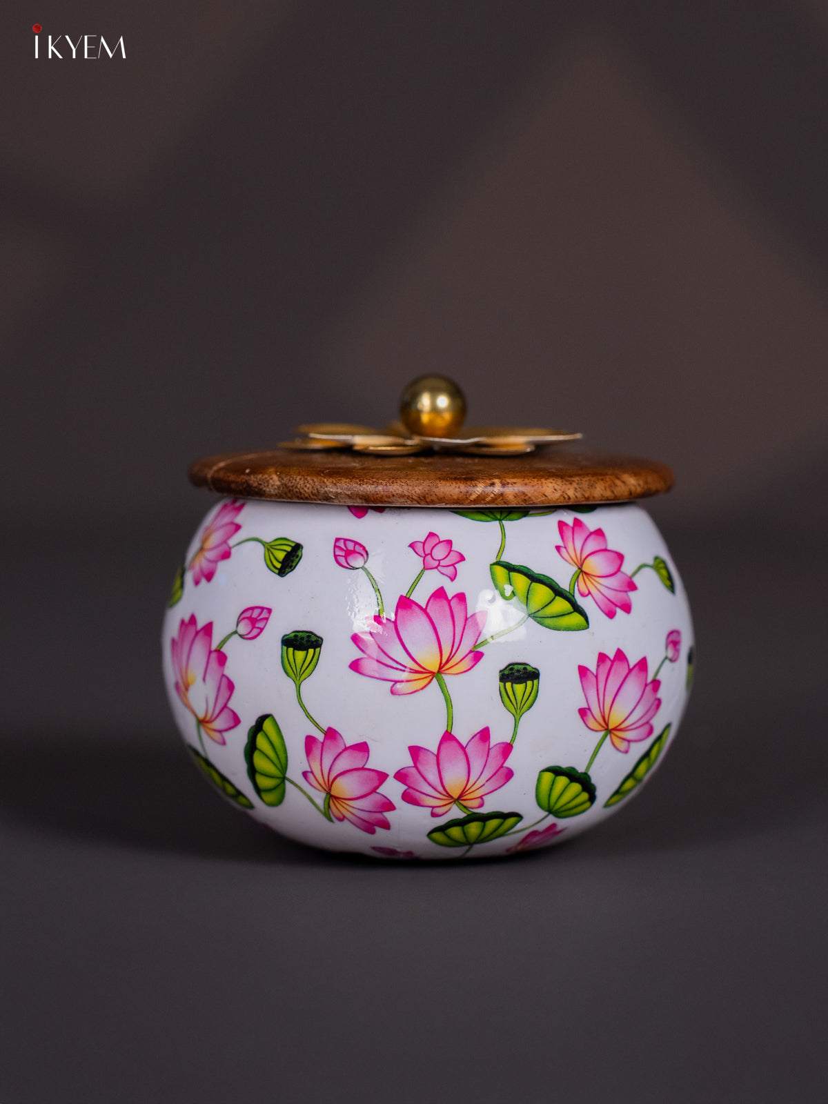 The digitally printed white lotus motif on a sturdy metal base with a finely crafted wooden lid adds a heritage-inspired touch. Compact yet stylish, it’s perfect for storing sweets, nuts, or as a charming cookie jar that enhances your festive décor.