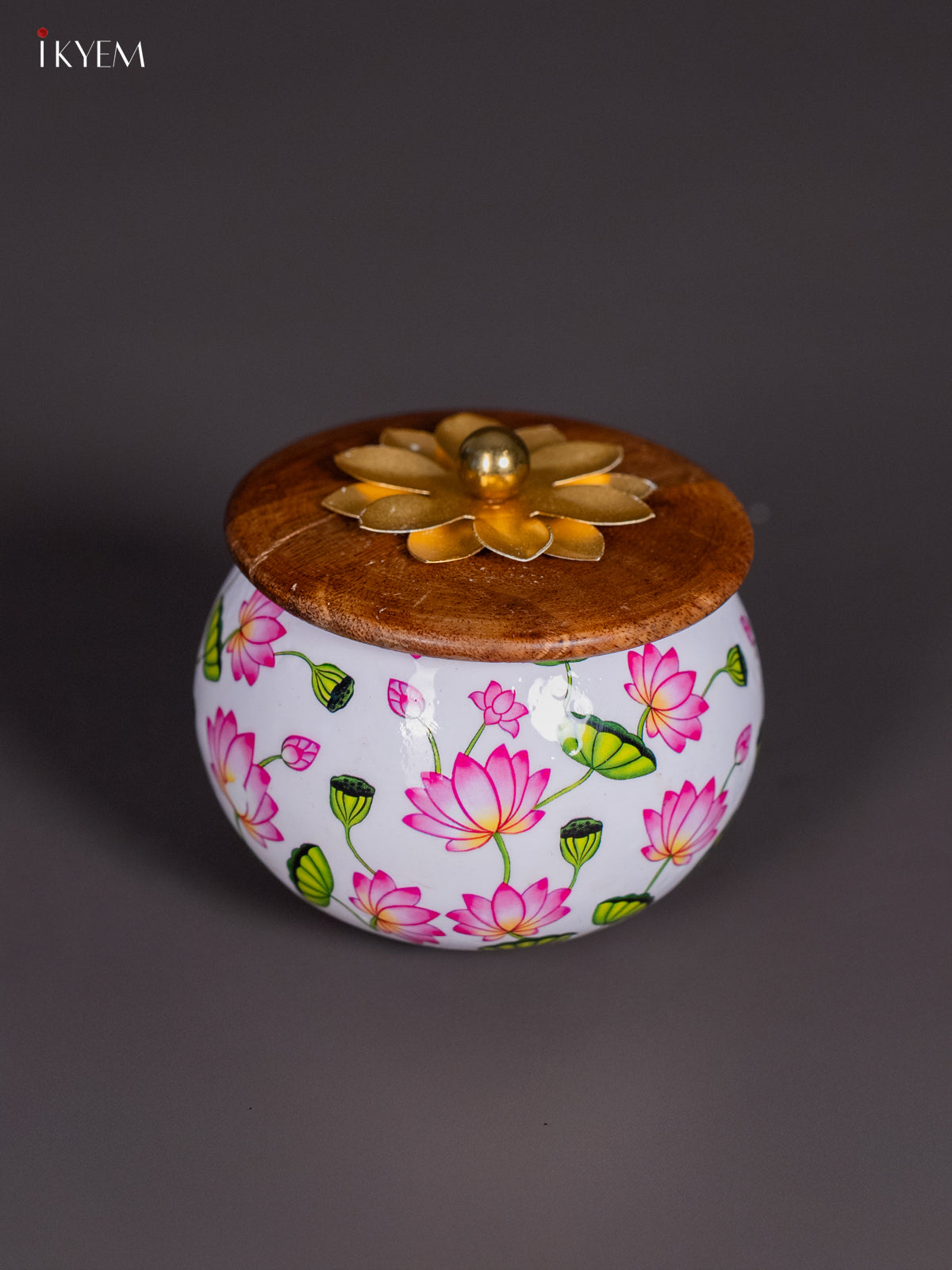 Exquisite Lotus Printed White Dry Fruits Jar With Wooden Lid - (3 Inches) - KI26115