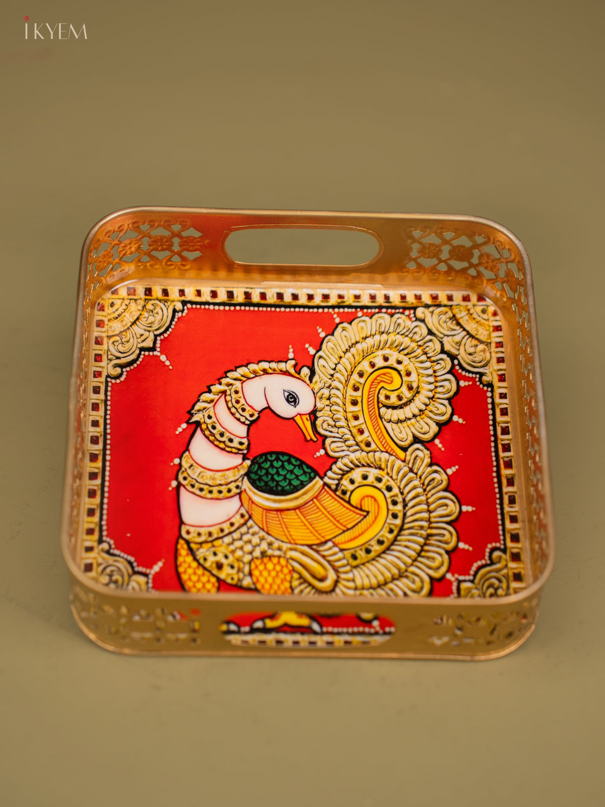- This 8-inch square metal tray features a yellow Peacock design, perfect for pooja ceremonies and religious offerings.