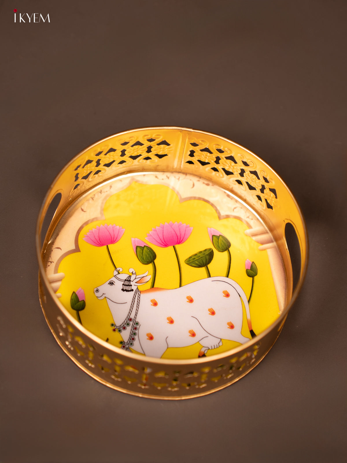 - This 6-inch Metal Digital Pichwai Round Tray in yellow, features a beautiful Pichwai cow & Lotus design.